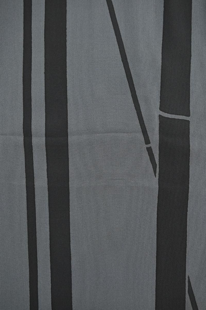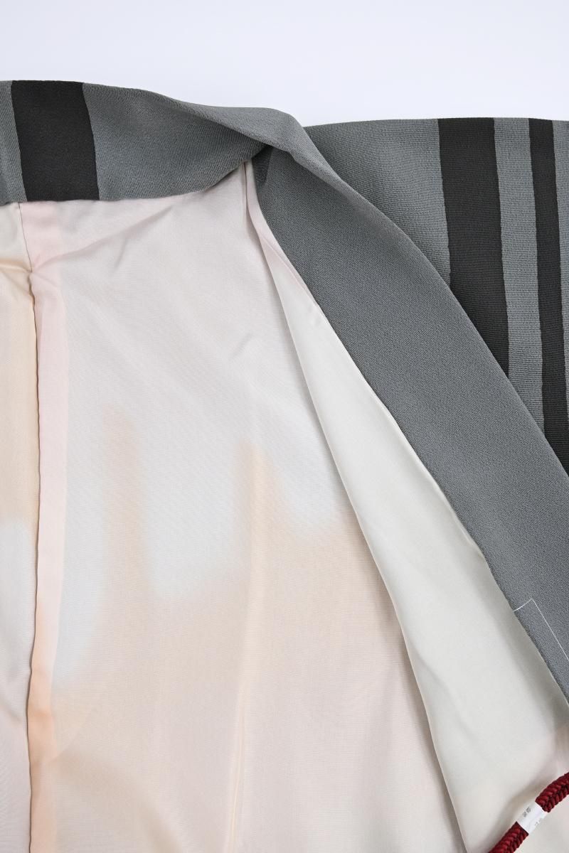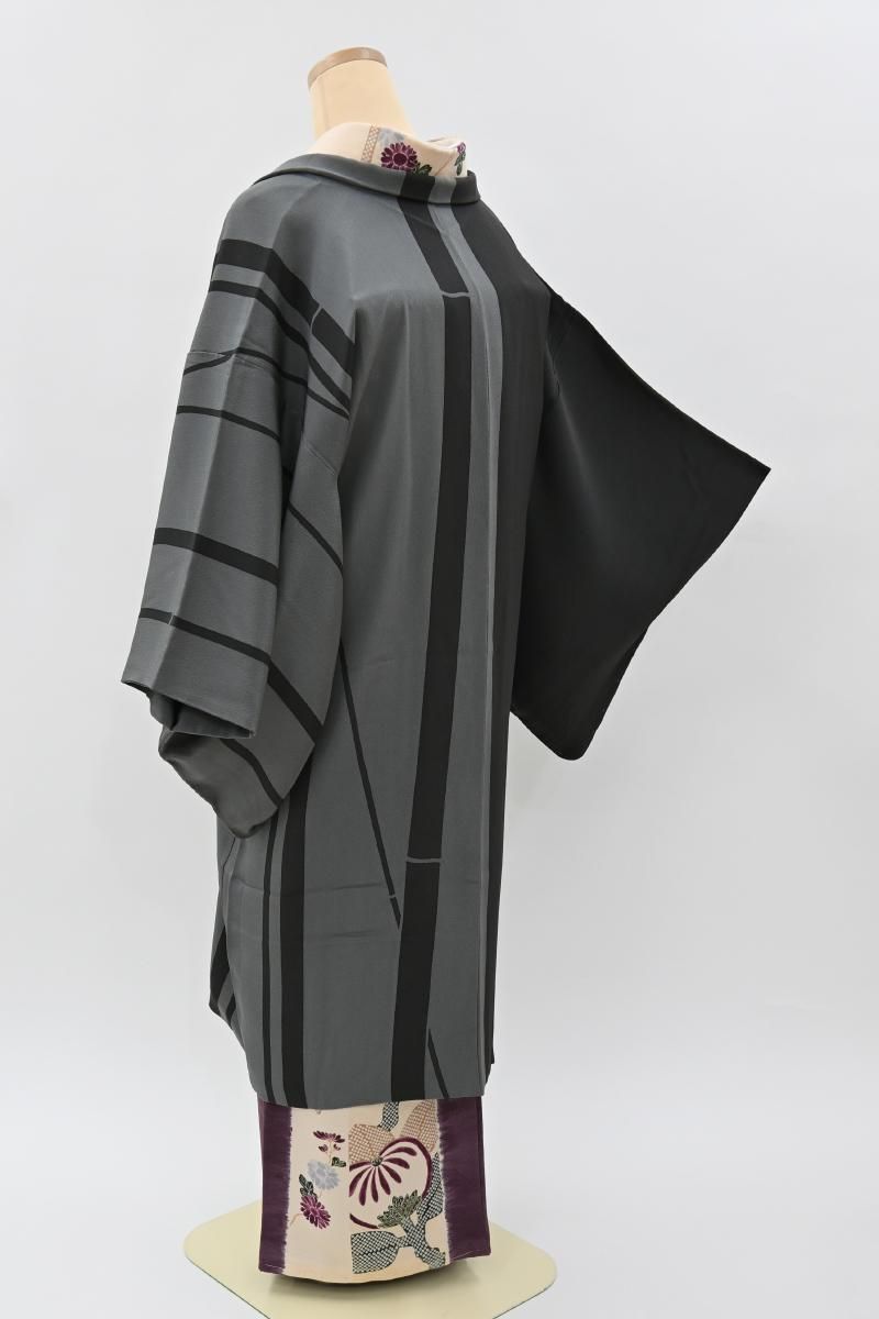 竹の図を配した僅かに青みを含んだグレーと、黒に近いほどごく深いグレーの片身替わりの羽織です。ふっくらとシボを帯びた縮緬地に、ぐっとシックな彩りでシンプルに表されたモチーフがモダンな印象の一枚、紬や小紋に合わせてきりりと小粋な装いをお楽しみいただけそうですね。防寒や塵除けとしてこれからの季節に必須の羽織もの、この機会にぜひ洒落みある一枚をいかがでしょうか。