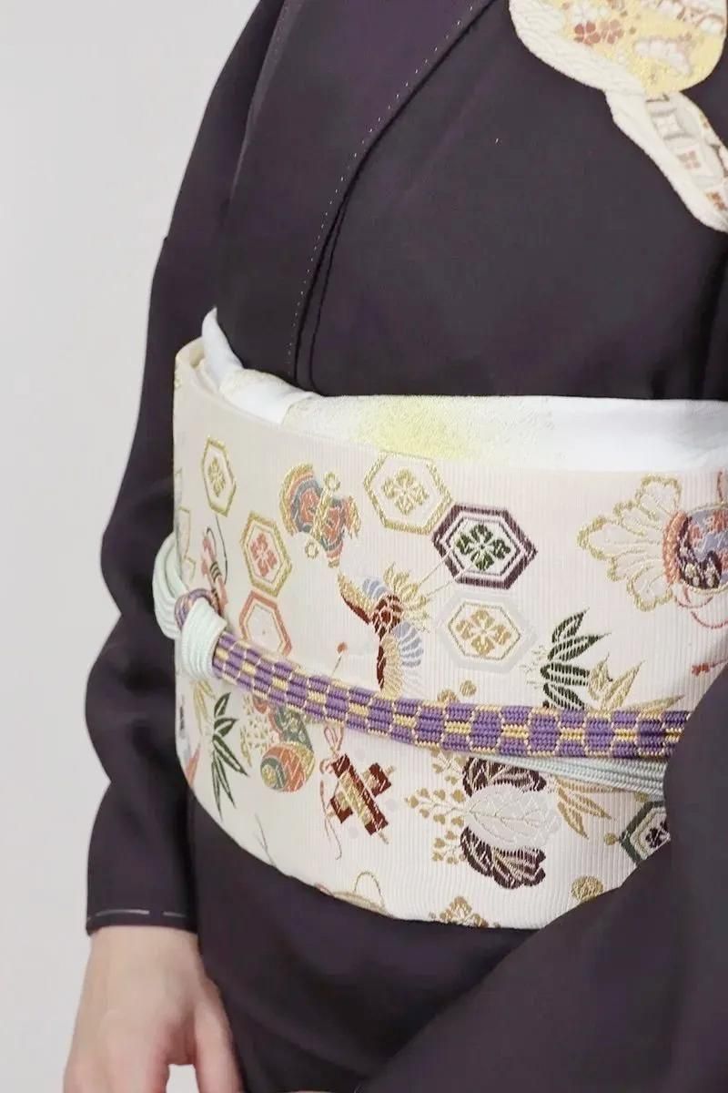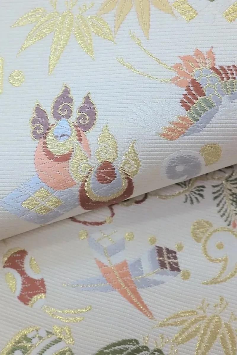 すっきりとしたオフホワイトの地に、宝尽くし文を織りだした袋帯です。晴れやかなお色目に色とりどりの色彩と金糸の煌めきが映えるお品、華やかな意匠が祝意溢れる明るさを添えていますね。付下げや色無地、訪問着など幅広い着物に合わせて、気品豊かな装いをお楽しみいただけることと思います。この機会にいかがでしょうか。
