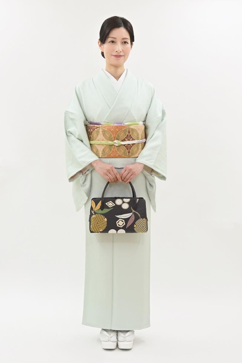 やや色を薄めた白緑色が近いでしょうか、ごく淡いミントグリーンの地に、桐竹鳳凰の地紋を浮かべた色無地です。柔らかな光沢を帯びた地風が品良い華やぎを感じさせるお品、すっきりと澄んだお色目はお顔映りも良く、凛とした気品の感じられる装いをお楽しみいただけることと思います。紋は入っておりませんので繍の一ッ紋などを入れて頂きますとお茶席など様々な場面に重宝にお召し頂けますね。季節の染め帯から織名古屋帯など幅広い帯合わせでお楽しみ下さいませ。