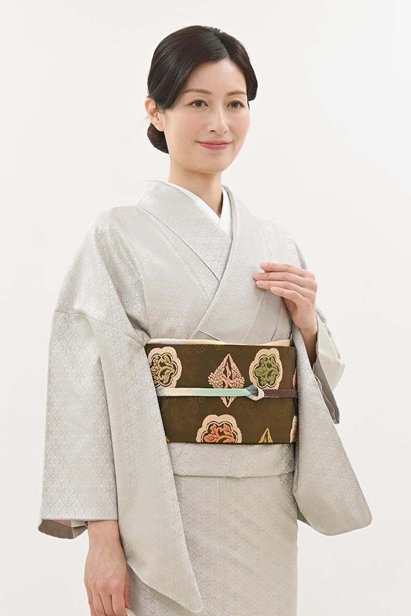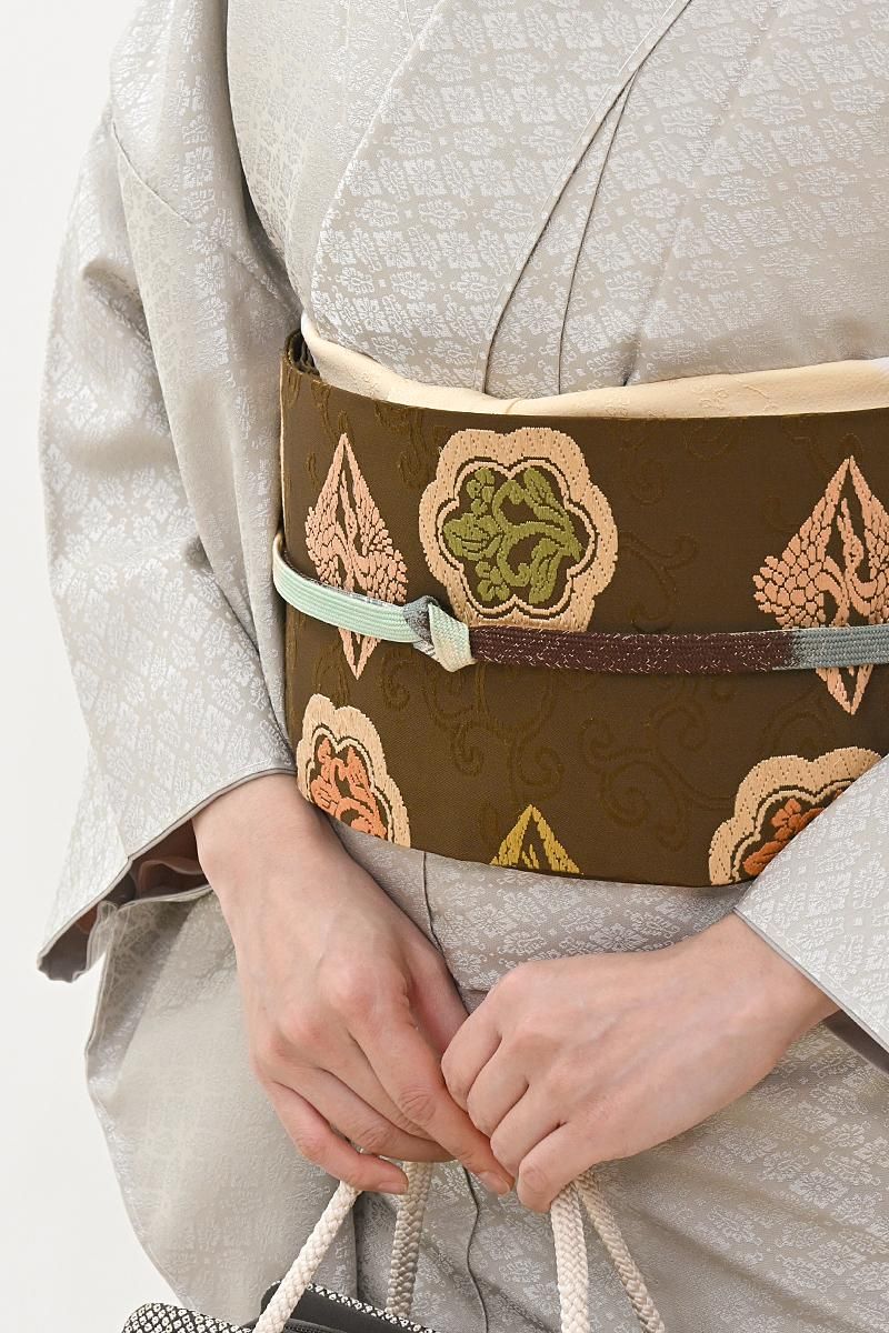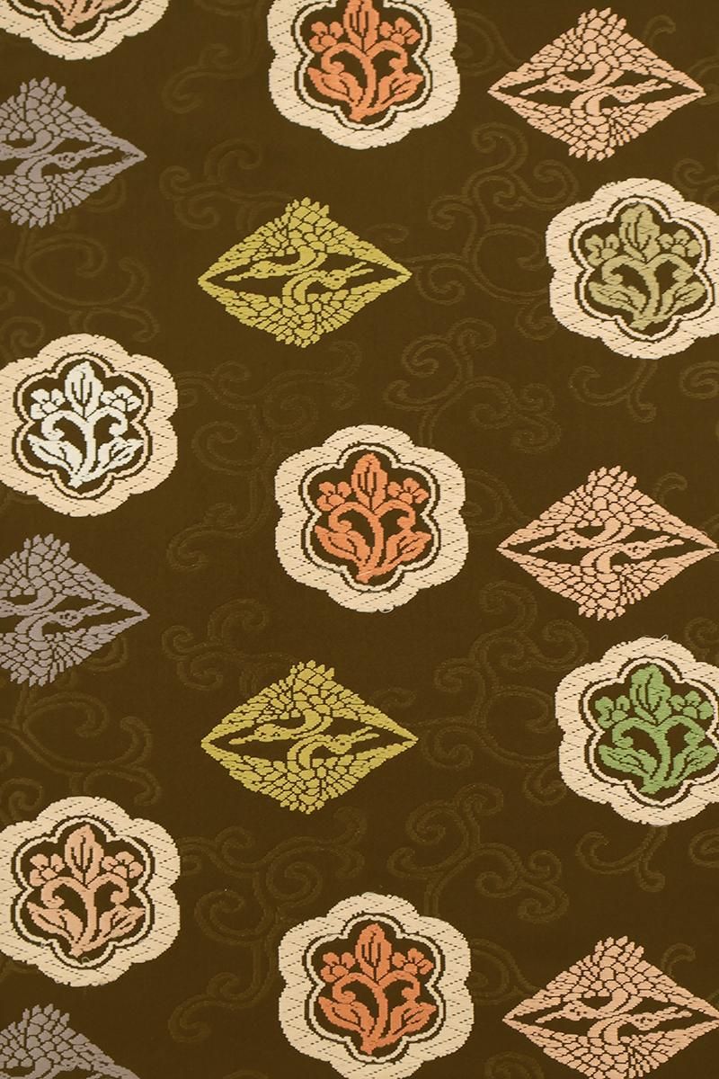 やや色を薄めた吉岡染色が近いでしょうか、ごくわずかに緑みを含んだ深い焦茶色の地に、木瓜や向かい鶴文を織り出した名古屋帯です。唐草の地紋が浮かぶシックなお色目に、ふっくらとした唐織で表現された意匠が女性らしい華やぎを添えるお品、装いを格調高く優雅に引き立ててくれることと思います。色無地や江戸小紋などに合わせて、お茶のお席など改まった場面の装いにいかがでしょうか。