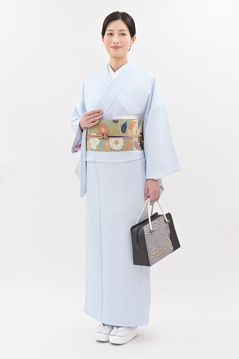 やや明度を上げた蒼白色が近いでしょうか、ごく淡い澄んだ薄青色の地に、花唐草の地紋の浮かぶ色無地です。穏やかな光沢を帯びた柔らかな地風が優雅な印象の一枚、澄んだお色目に清々しい気品が香りますね。紋は入っておりませんので、合わせる帯次第で様々な場面にお使い頂けることと思います。季節の染め帯を合わせてお友達との気軽なお出かけに、格高の名古屋帯や袋帯を合わせて少し改まったお席など、幅広くお楽しみくださいませ。