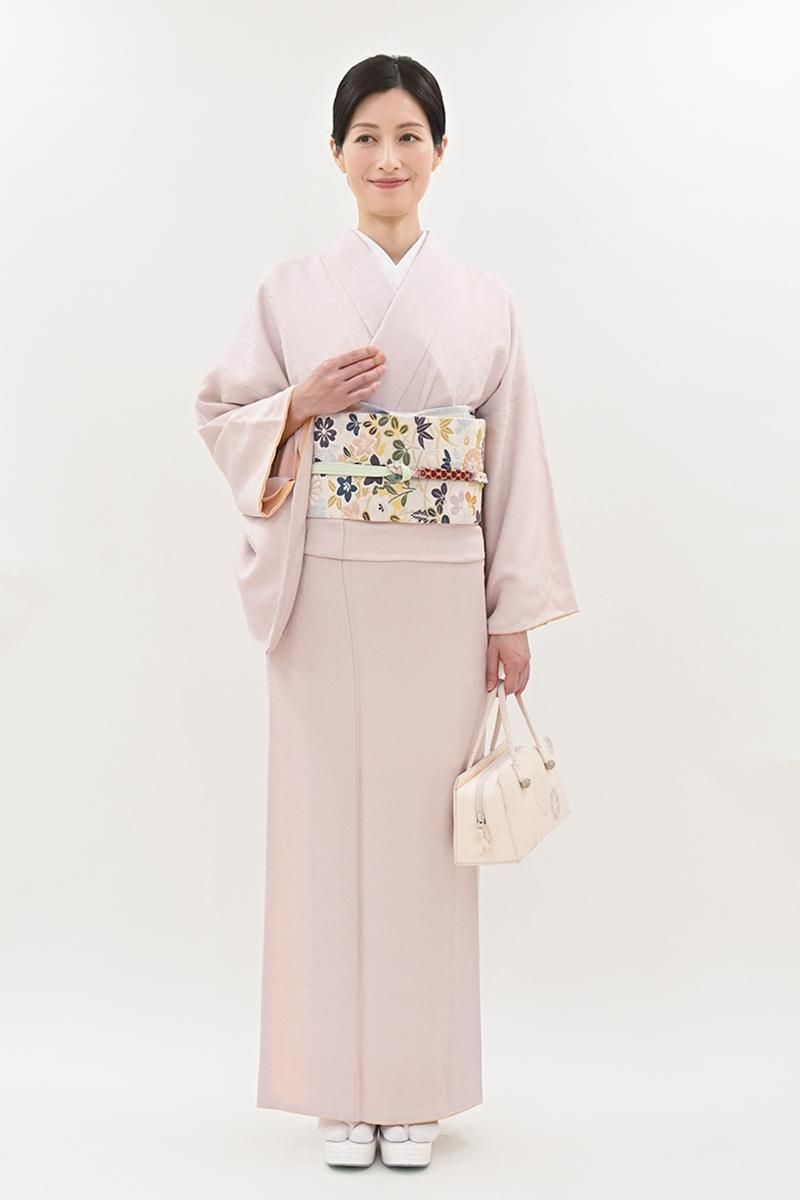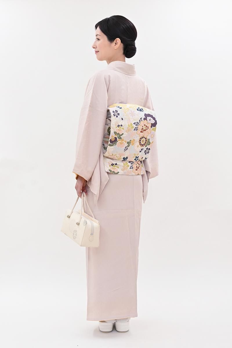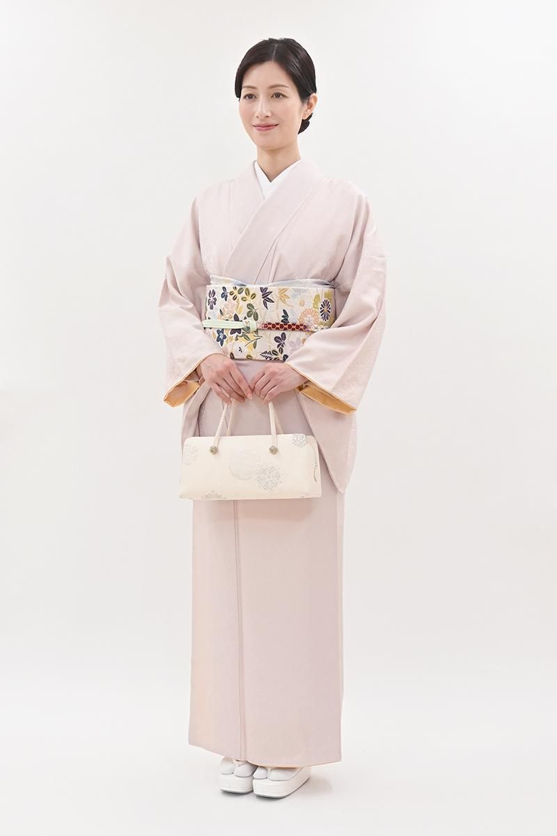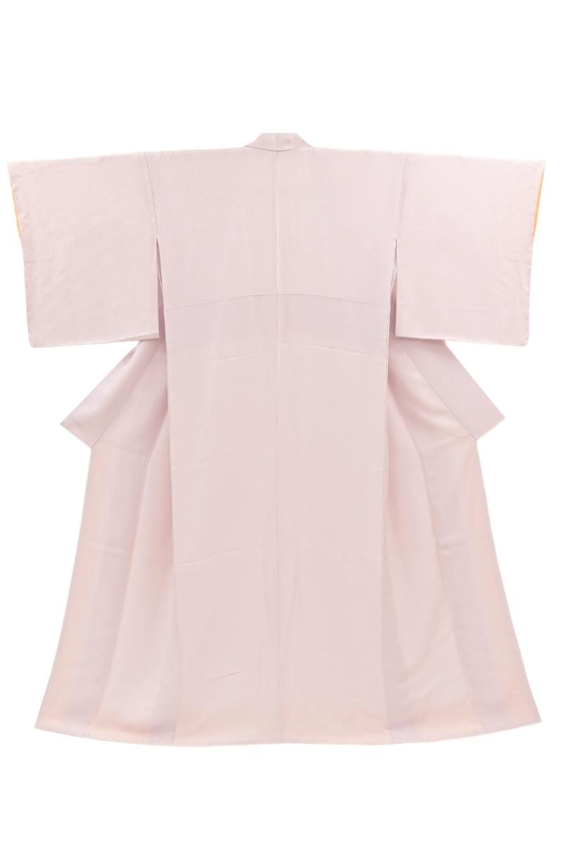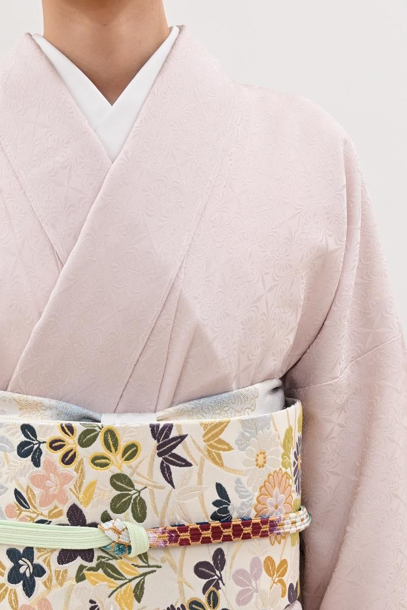 やや明度を上げた灰桜色が近いでしょうか、灰みの薄ピンク色の地に、装飾的な菱の地紋が浮かび上がる色無地です。こちらはしっとりと女性らしいお色目に光の加減で浮かぶ地紋が陰影豊かな景色を創るお品、柔和なお色目はお顔映りもよく、帯の背景としても万能ですね。合わせる帯も様々に、お食事やパーティなどに洗練された装いをお楽しみいただけることと思います。ぜひこの機会にいかがでしょうか。