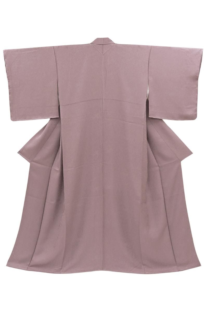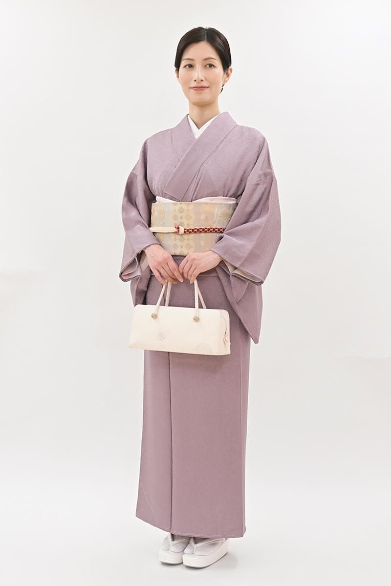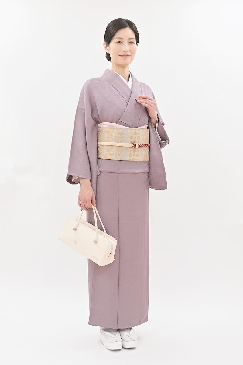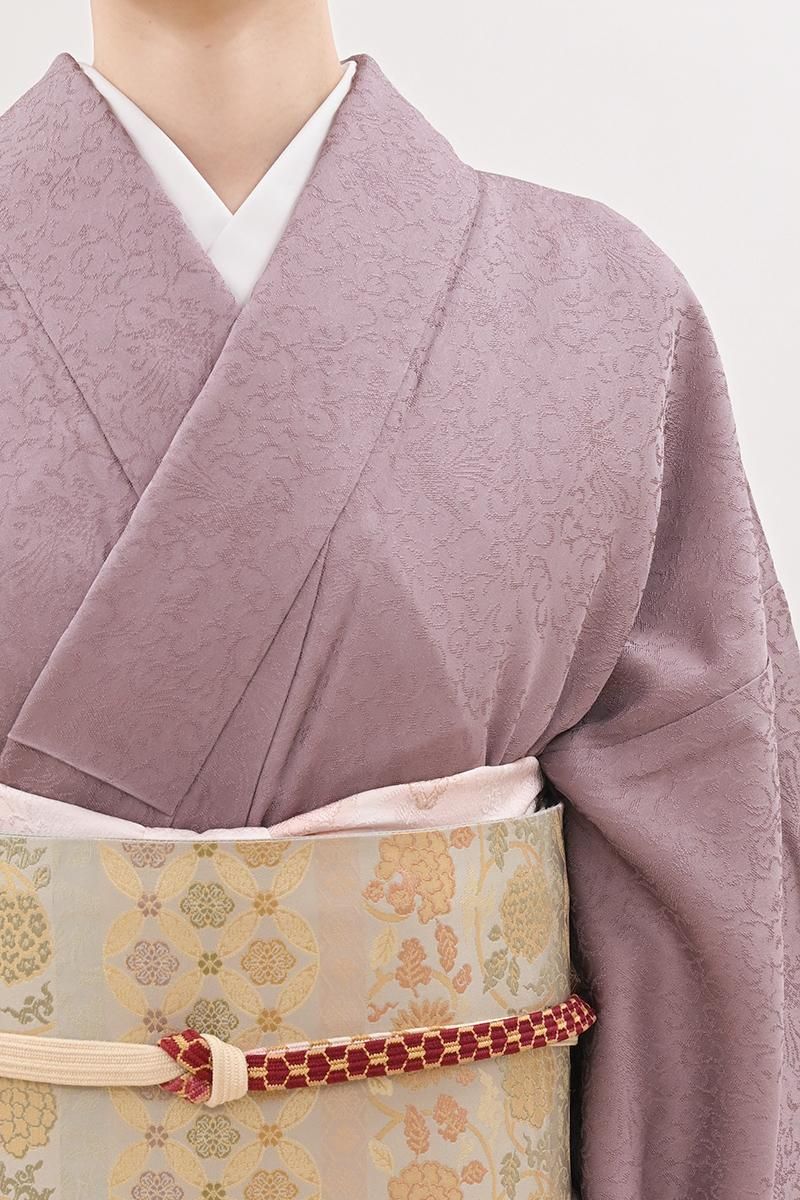 やや明度を上げた鳩羽鼠色が近いでしょうか、ほのかな光沢を帯びた灰みの強い紫色の地に、鳳凰唐草の地紋が浮かび上がる色無地です。こちらは京友禅の名門として知られた染の北川さんのお品、少しおおぶりの地紋が陰影豊かな景色を創り出していますね。しっとりと落ち着いたお色目が大人の女性らしい洗練された印象で装いを引き立ててくれることと思います。改まったお席への備えとして、上質な色無地をいかがでしょうか。