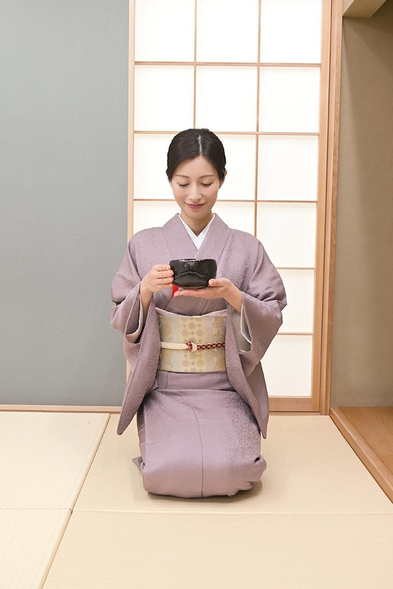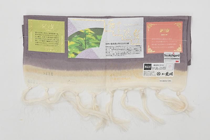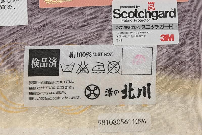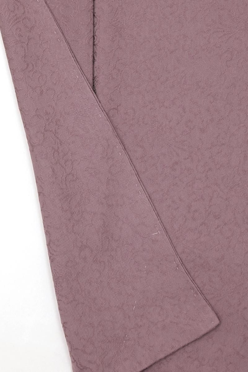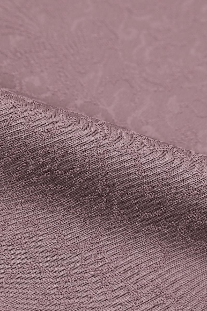 やや明度を上げた鳩羽鼠色が近いでしょうか、ほのかな光沢を帯びた灰みの強い紫色の地に、鳳凰唐草の地紋が浮かび上がる色無地です。こちらは京友禅の名門として知られた染の北川さんのお品、少しおおぶりの地紋が陰影豊かな景色を創り出していますね。しっとりと落ち着いたお色目が大人の女性らしい洗練された印象で装いを引き立ててくれることと思います。改まったお席への備えとして、上質な色無地をいかがでしょうか。