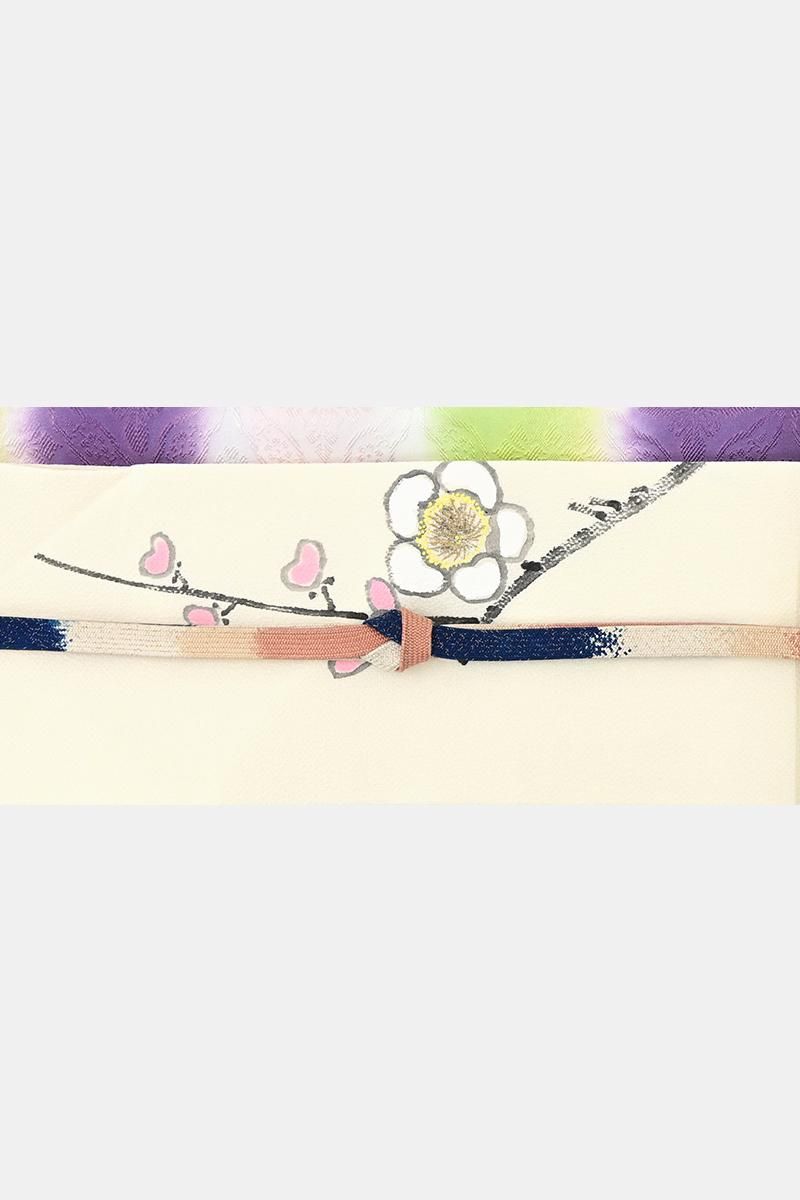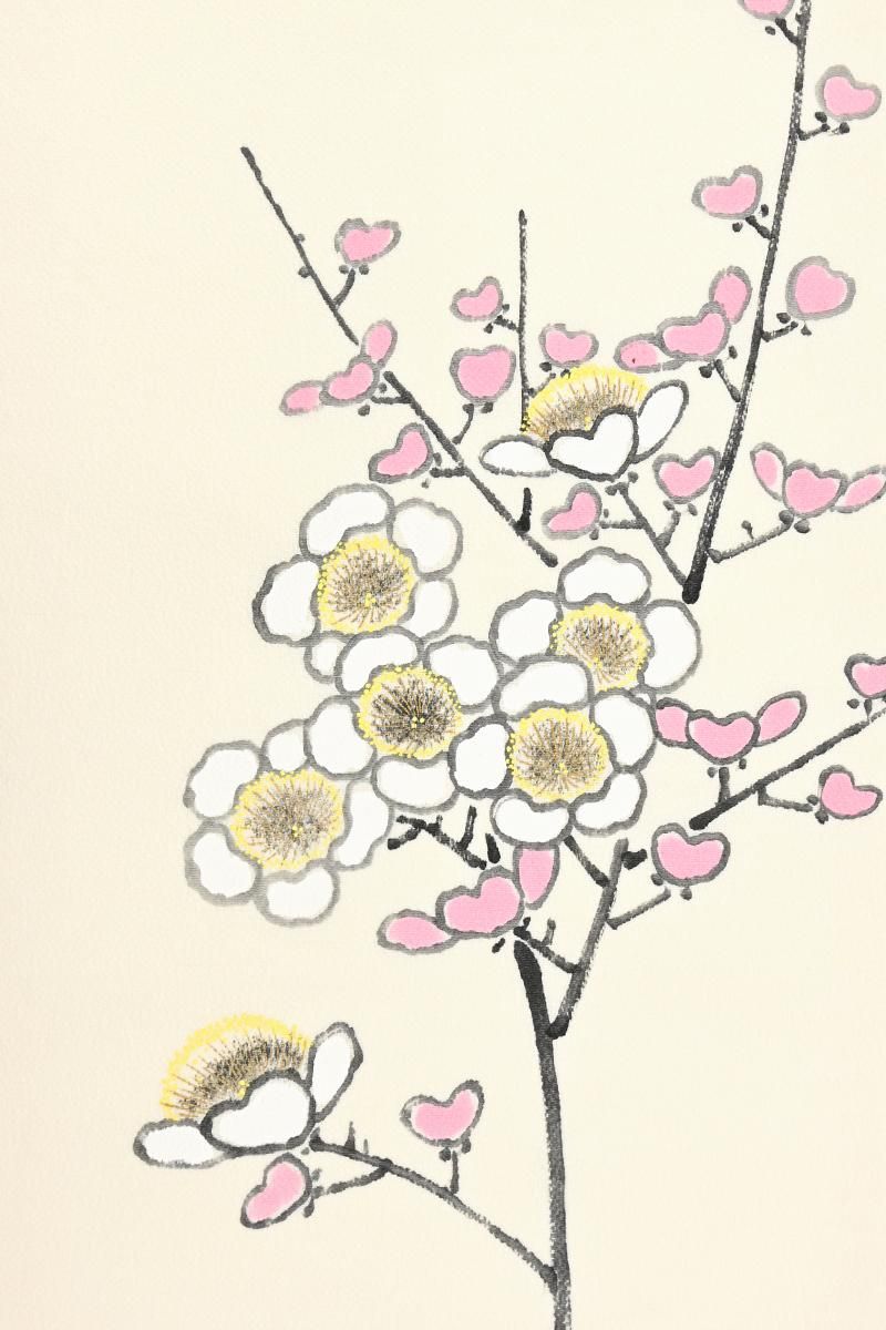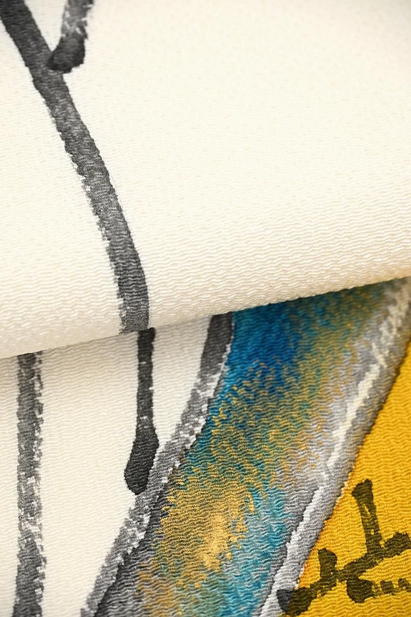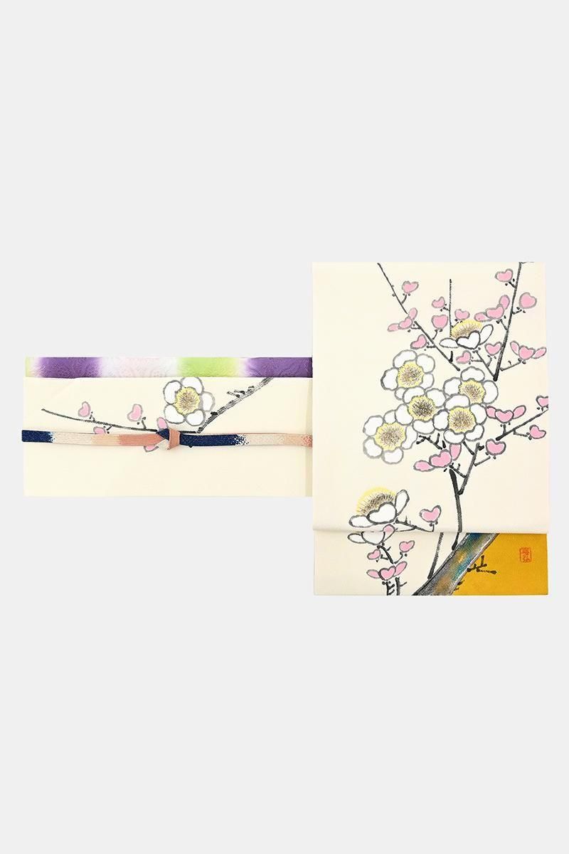 練色が近いでしょうか。灰みや黄みを帯びた温かみのあるオフホワイトの縮緬地を背景に、ひと枝の梅の花が描かれた染名古屋帯です。源平咲きの梅でしょうか、二色の芳しい花たちの晴れやかな姿が表現されたお品。墨色や薄墨色をのせた力強く勢いのある筆によるシンプルな枝や蕾のかたちが、それとは対照的に胡粉色、そして淡黄色や金彩で彩られた数輪の白梅の煙るような繊細な美しさをくっきりと引き立てていますね。脇を固める可愛らしい一重梅色が、明るい春の気配を呼び込んでくれる一点。装飾を抑えた景色には洗練された清々しさが感じられ、穏やかな白を主調とする清澄な世界が気品ある装いを創り出してくれることと思います。こちらは重要無形文化財「友禅」の保持者、森口華弘さんの作品。高度に完成された蒔糊などに見られる緻密さとはまた趣きの異なる大らかな表現は、より身近に親しむことのできるこの方のもう一つの美のかたちを教えてくれますね。紬や小紋に合わせて、季節ならではの贅沢な装いをお楽しみ下さいませ。三越さんの扱いです。