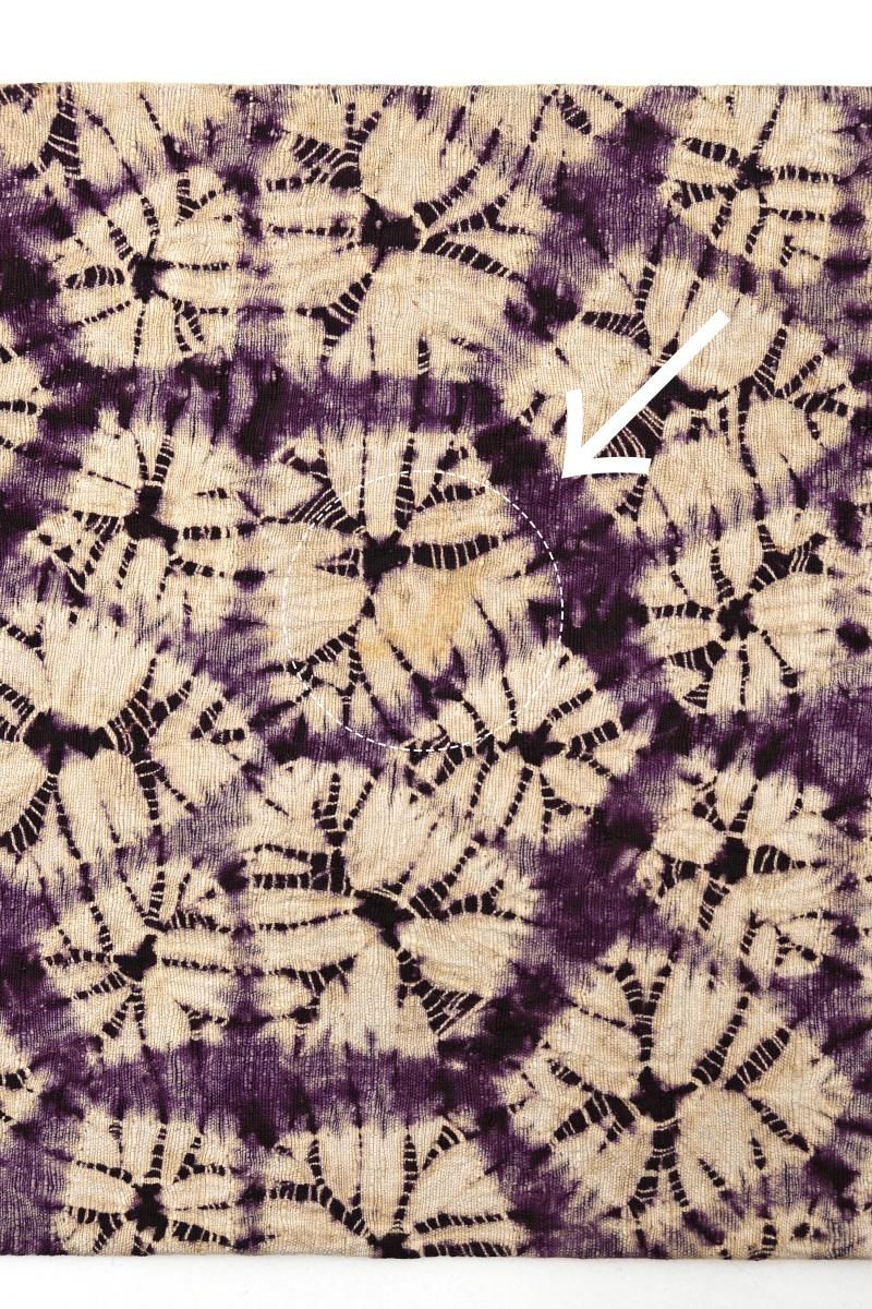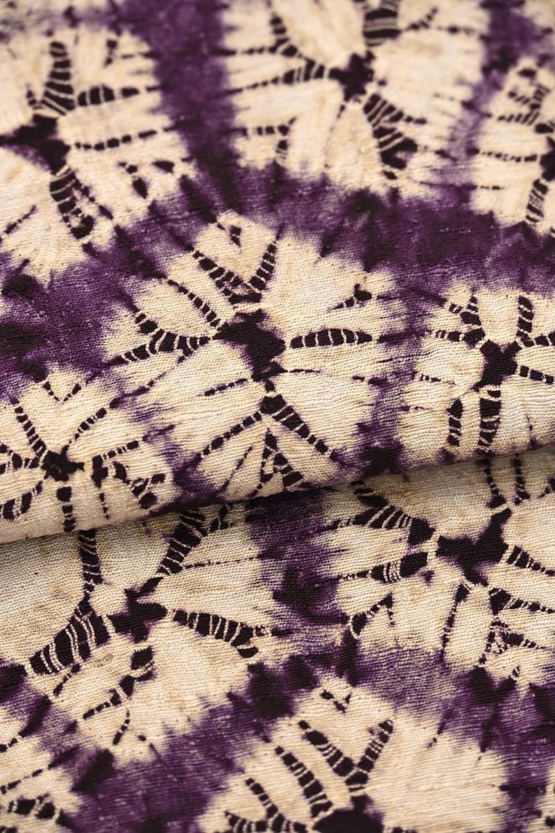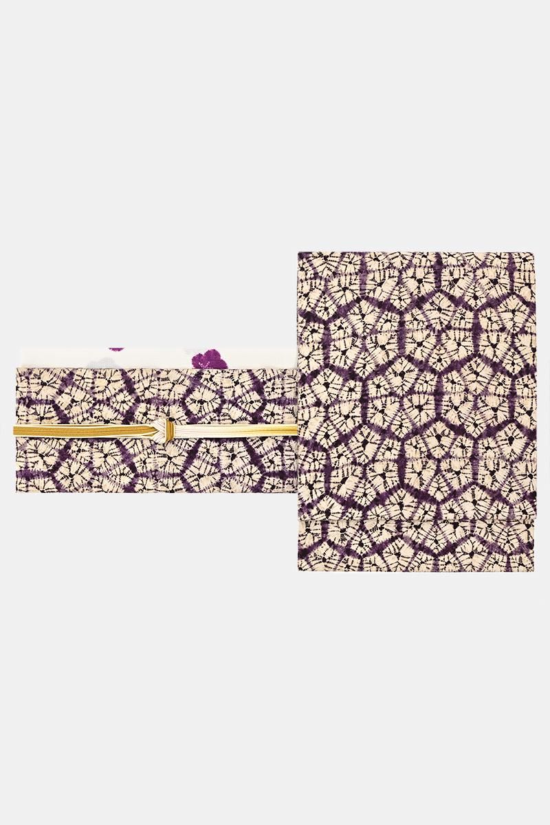 古くから南部地方に伝わる茜染めと紫根染めを守り続ける盛岡の工房・草紫堂さんのお品から、紫根染めの名古屋帯です。こちらの紫根染めは熟練の技術を持つ市内近辺在住の女性が一つ一つ時間をかけて手で絞り、染料としてとりわけ稀少な紫草の根を用いて繰り返し染められます。手のかかる仕事を積み重ねてようやく目にすることのできる紫根の色やはり特別なもの。穏やかな華を備えた上品な女性らしさに、どなたも魅せられることと思います。今回のご紹介は、大小の花弁を組み合わせた花のような形を亀甲繋ぎ風に配した名古屋帯。黄みがかった穏やかな白、そして時を経て落ち着いた濃色との優しいコントラストにほっと心癒されますね。紬や小紋などの装いに合わせて、草紫堂さんの紫根染ならではの清楚な美しさを、どうぞお楽しみくださいませ。