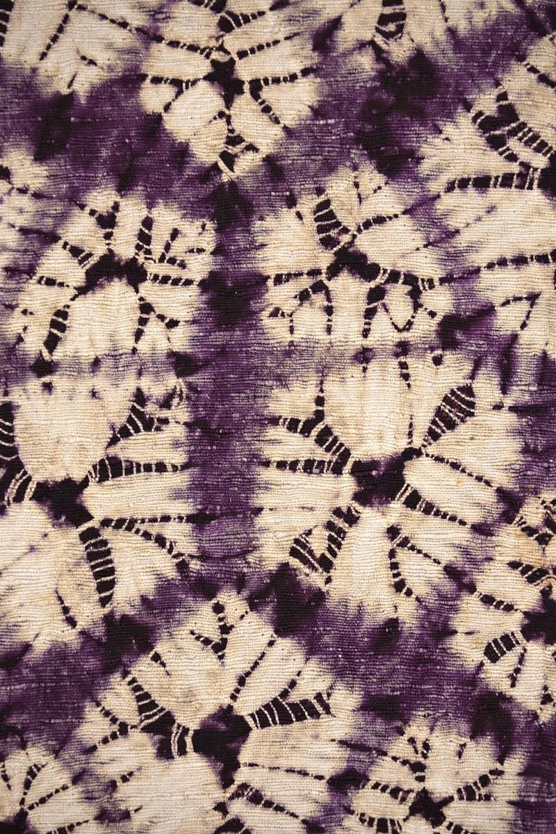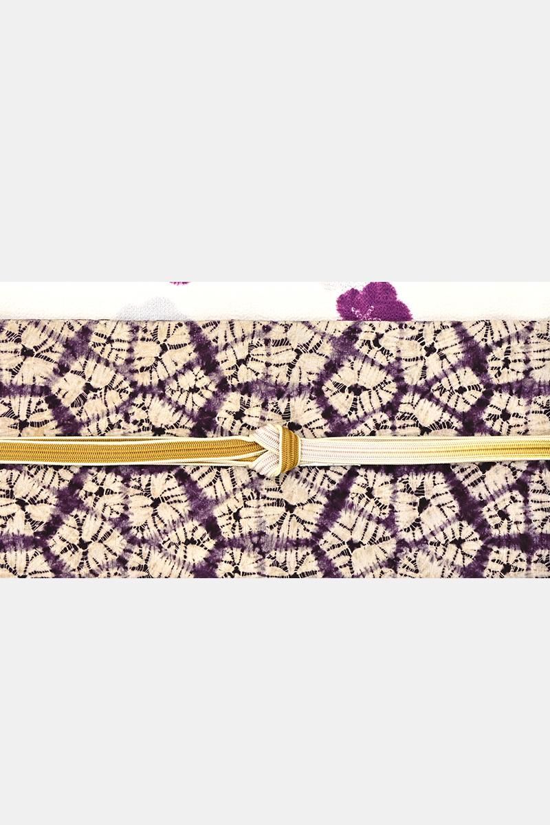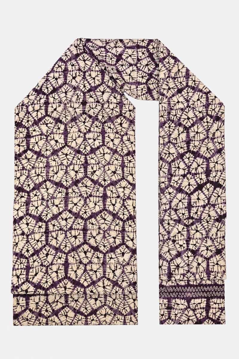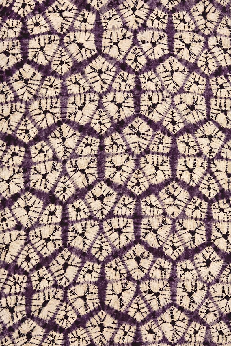 古くから南部地方に伝わる茜染めと紫根染めを守り続ける盛岡の工房・草紫堂さんのお品から、紫根染めの名古屋帯です。こちらの紫根染めは熟練の技術を持つ市内近辺在住の女性が一つ一つ時間をかけて手で絞り、染料としてとりわけ稀少な紫草の根を用いて繰り返し染められます。手のかかる仕事を積み重ねてようやく目にすることのできる紫根の色やはり特別なもの。穏やかな華を備えた上品な女性らしさに、どなたも魅せられることと思います。今回のご紹介は、大小の花弁を組み合わせた花のような形を亀甲繋ぎ風に配した名古屋帯。黄みがかった穏やかな白、そして時を経て落ち着いた濃色との優しいコントラストにほっと心癒されますね。紬や小紋などの装いに合わせて、草紫堂さんの紫根染ならではの清楚な美しさを、どうぞお楽しみくださいませ。