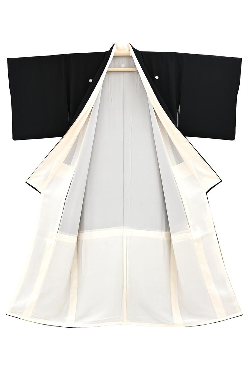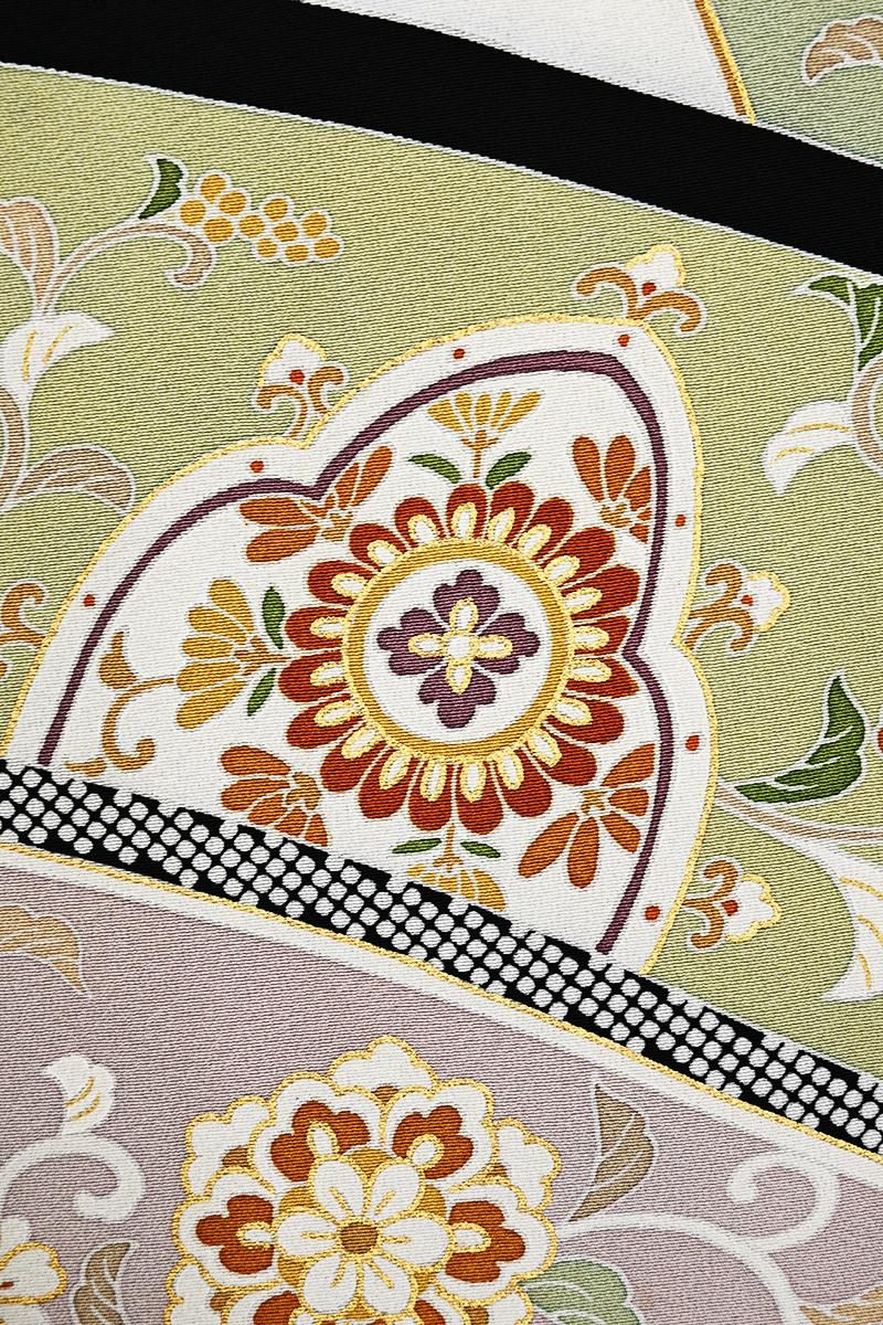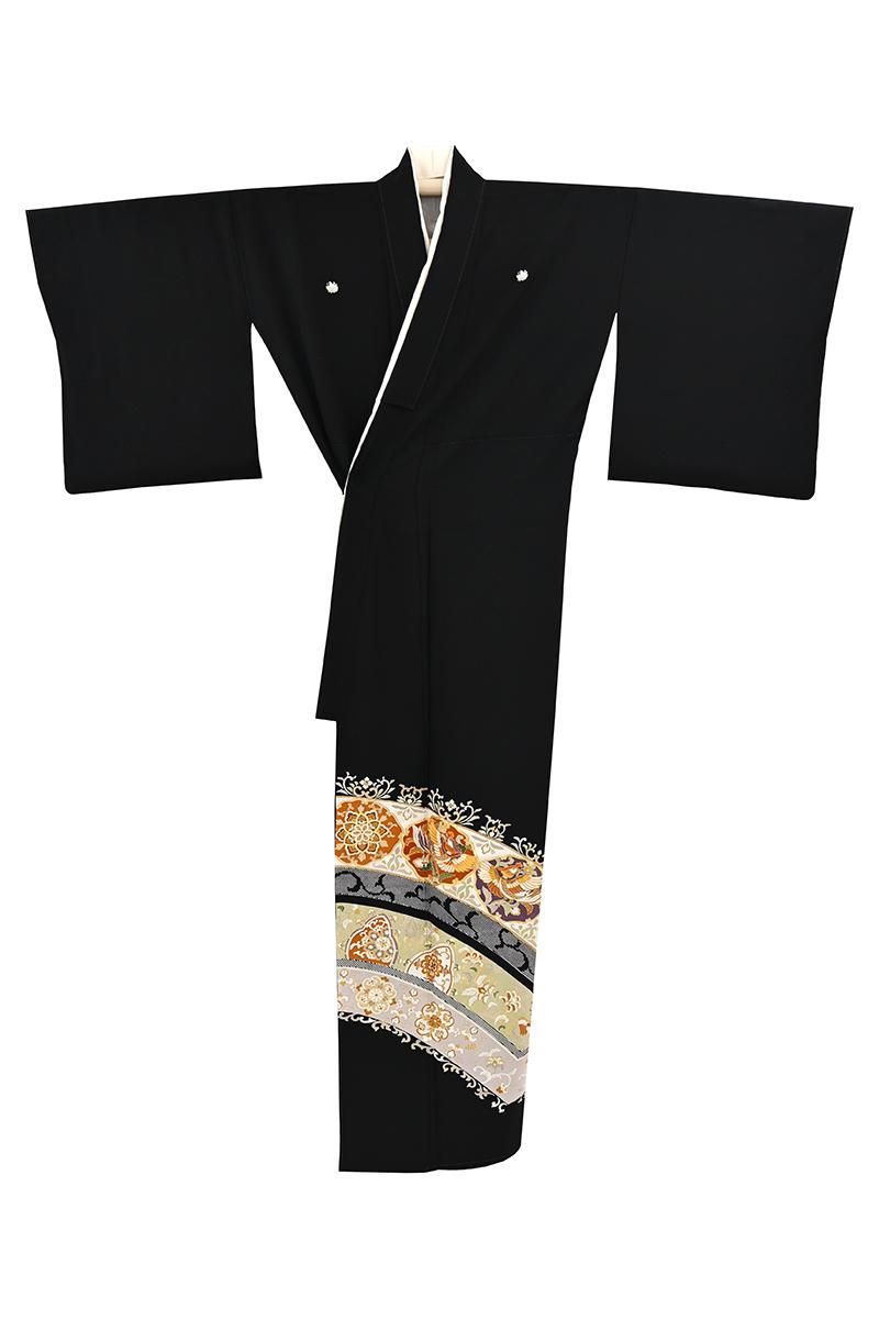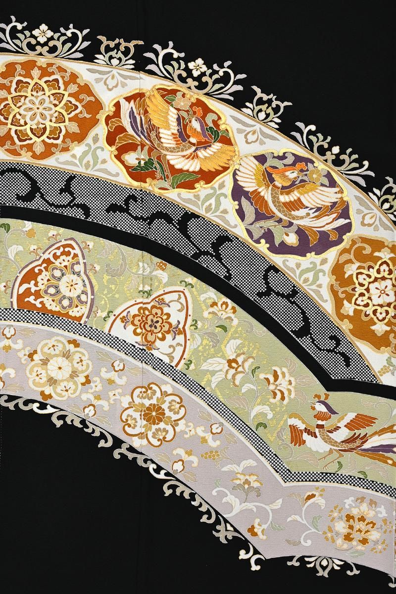 緩やかに弧を描く帯状の場を重ね、それぞれに典雅な華文や更紗花唐草、摺疋田に鳳凰文などが精緻な筆と繊細な繍い、鈍く煌めく金彩をふんだんに添えて表現された黒留袖です。上代のさまざまな意匠が贅沢に裾を彩る重厚感あふれるお品。やや淡めの柔らかな彩りを主調としたモチーフは、背景の黒とのコントラストも穏やかです。高い格調を備えつつもとても優しい印象ですので、お召しになる方を選びませんね。高度な技術を駆使して丹念に表現された景色は、第一礼装に相応しい品位と存在感を備え、どのようなお席にも安心して臨んでいただけることと思います。こちらは創業470年を誇る京友禅の老舗・千總さんの作。染繍の様々な工程それぞれに熟練の技術を持つ専属の職人を抱え、伝統を引き継いできた指折りの老舗ならではの、古典美あふれる名品です。お探しの方、ぜひこの機会にお手に取ってご覧くださいませ。高島屋さんの扱いです。