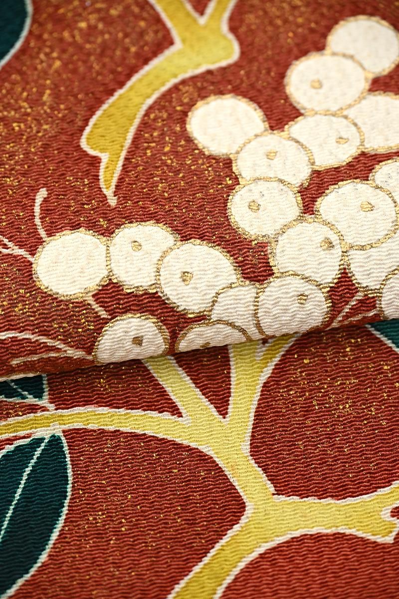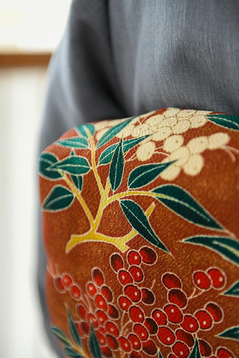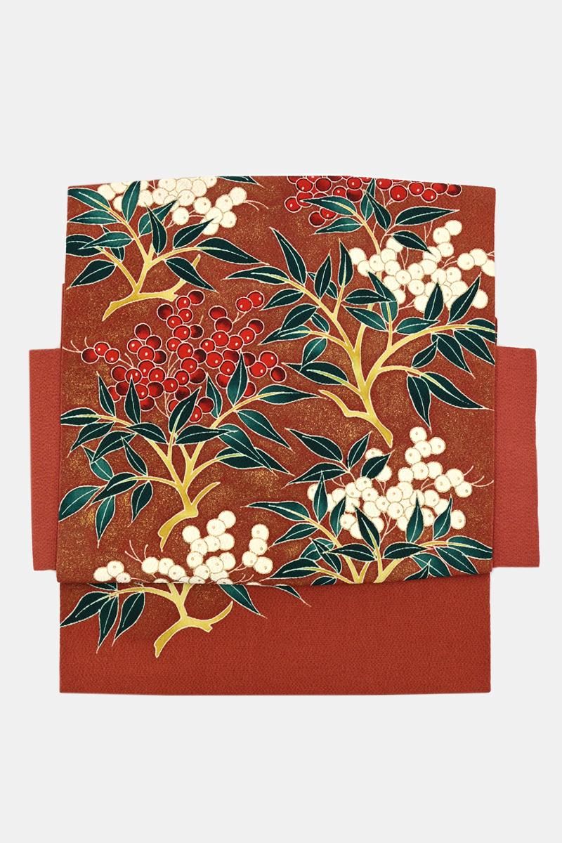 全体に金彩を散りばめた茶色の縮緬地に、紅白の実をつけた南天の枝が描かれた染めの名古屋帯です。深く暗い赤の色とやや黄みを帯びた白、そして深い高麗納戸色の葉、それぞれ微かな濃淡を置いた重みのある彩りが、ほっそりと金彩に縁取られてくっきりと浮かび上がるお品。寒中の静かな世界に鮮やかな色を添える南天の姿が力強く、存在感豊かに表現されていますね。確かな筆が象るおおらかな冬景色は、どのような着物もしっかりと受け止め、装いに季節の風情を運んでくれることと思います。こちらは自然なかたちでお太鼓が作られた二部式の仕立て。旅行先の着付けなどにも重宝にお使いいただけそうです。落款等はございませんが、作り手の高度な技量が光る迫力ある一点、上質な紬や小紋、色無地などの装いにいかがでしょうか。
