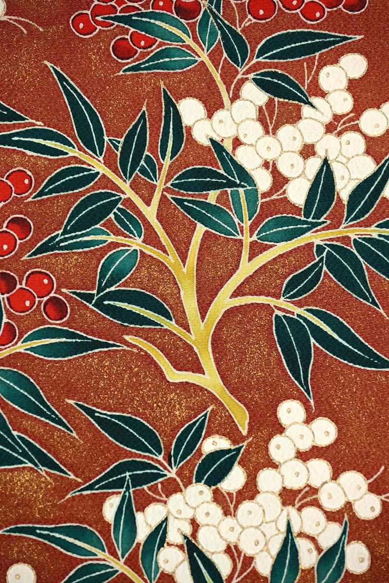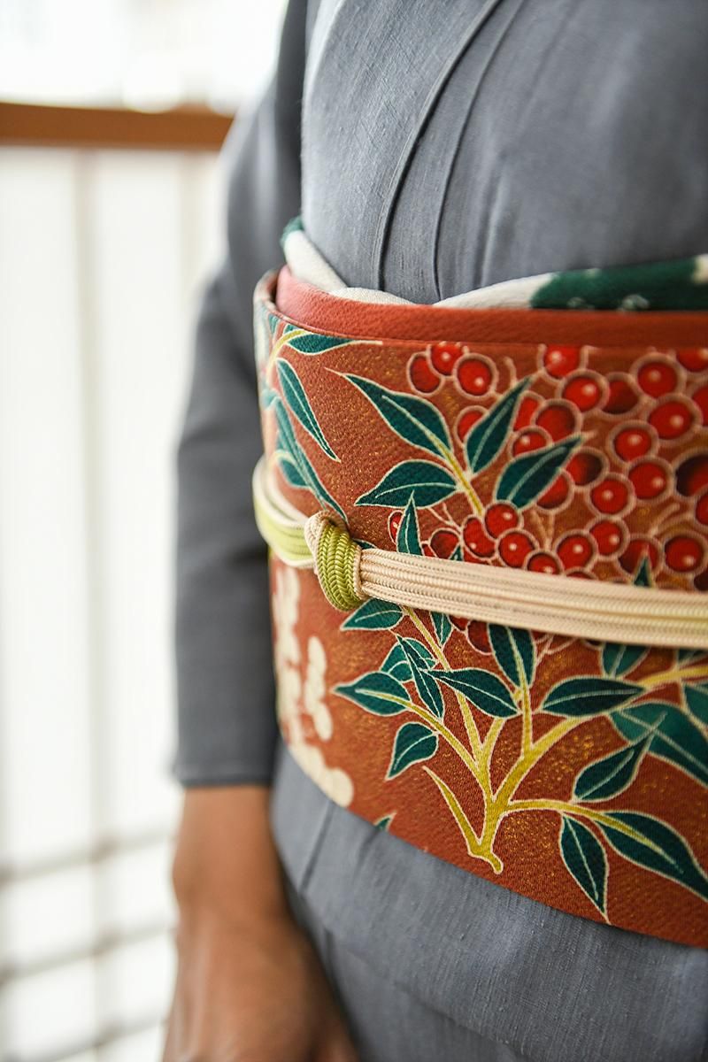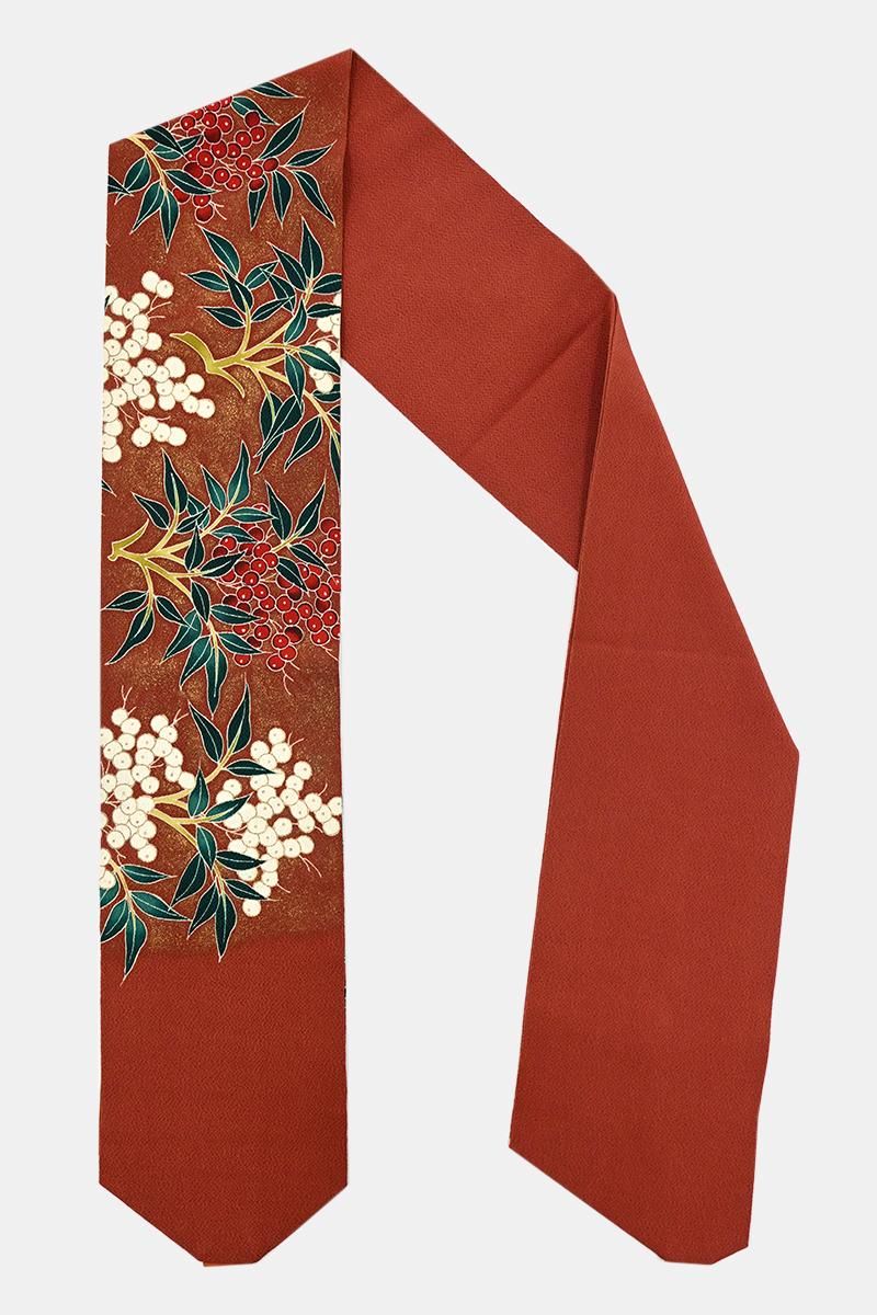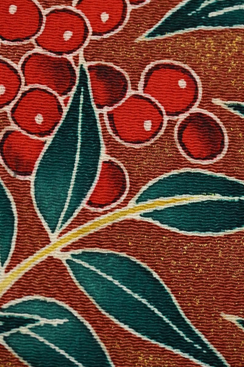 全体に金彩を散りばめた茶色の縮緬地に、紅白の実をつけた南天の枝が描かれた染めの名古屋帯です。深く暗い赤の色とやや黄みを帯びた白、そして深い高麗納戸色の葉、それぞれ微かな濃淡を置いた重みのある彩りが、ほっそりと金彩に縁取られてくっきりと浮かび上がるお品。寒中の静かな世界に鮮やかな色を添える南天の姿が力強く、存在感豊かに表現されていますね。確かな筆が象るおおらかな冬景色は、どのような着物もしっかりと受け止め、装いに季節の風情を運んでくれることと思います。こちらは自然なかたちでお太鼓が作られた二部式の仕立て。旅行先の着付けなどにも重宝にお使いいただけそうです。落款等はございませんが、作り手の高度な技量が光る迫力ある一点、上質な紬や小紋、色無地などの装いにいかがでしょうか。