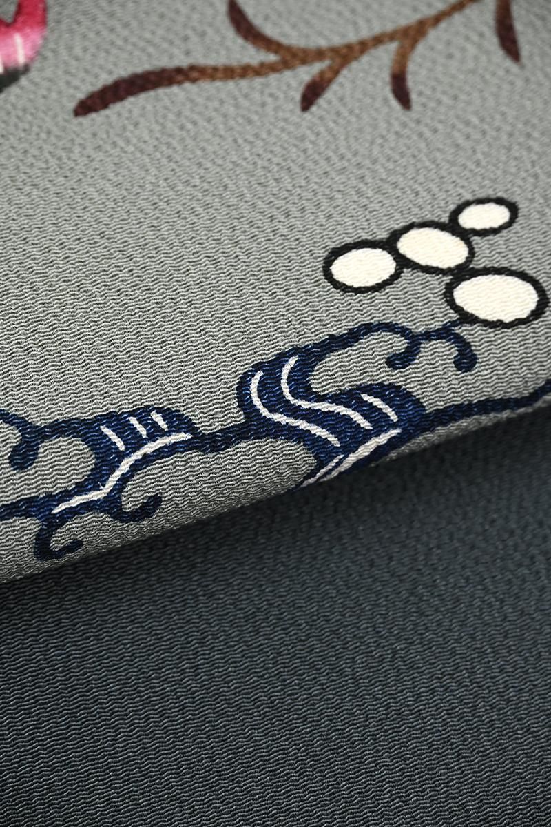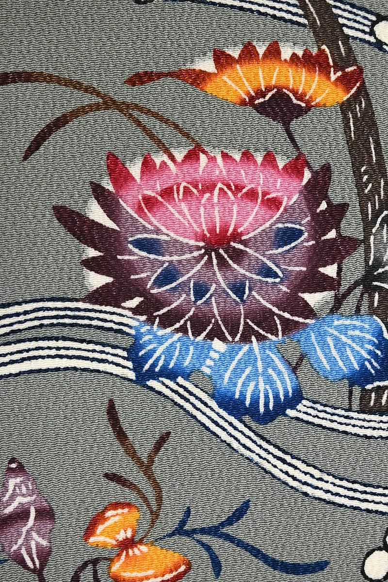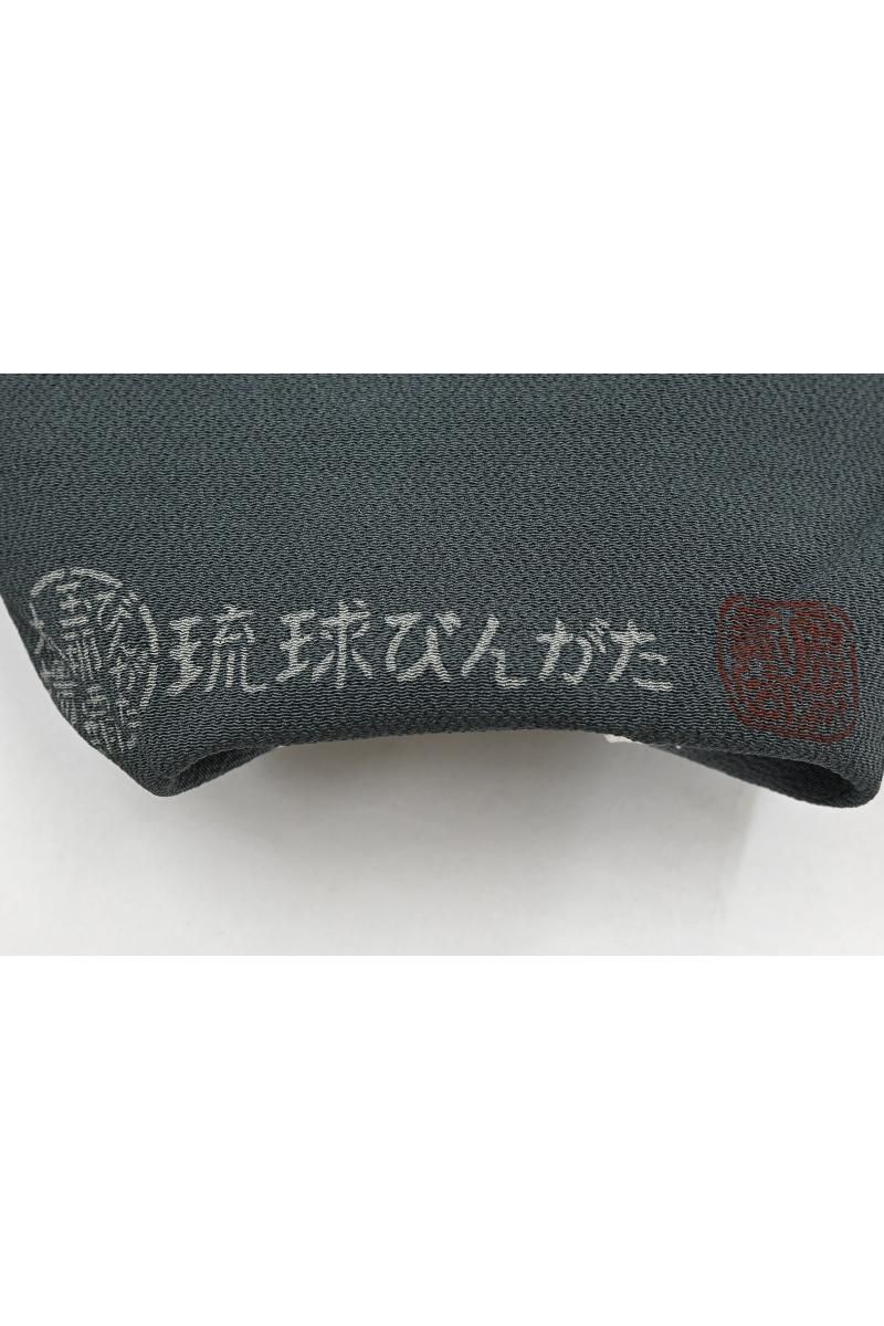 さらに灰みを強めた山鳩色が近いでしょうか。僅かに緑みを帯びた鈍いグレイ系の縮緬の地に藍鉄色、媚茶色、葡萄鼠色や黄土色に退紅色などの濃淡を細やかに使い分け、流水に菊花や桜、飛び交う小鳥たちや貝藻など伝統的なモチーフが流れるように配された本紅型の名古屋帯です。こちらは人間国宝 玉那覇有公さんの作。玉那覇さんは城間栄喜さんに師事し紅型の技法を習得、熟練の技術と優れた意匠力によって現代に生きる紅型をつくり続けておられます。連続する精緻な幾何文様など洗練された作品群を連想させる作り手さんですが、こちらは愛らしい花鳥やどこか微笑ましい貝たちが織りなす穏やかな風景の一点。45cmほどの長さにまとめられ、ひと色抑えたシックな配色で表現された優美なモチーフにほっと心癒されますね。伝統的な紅型らしさをきちんと残しつつ、この方らしいモダンな個性が生きる風趣豊かな優品。紬や小紋の装いにいかがでしょうか。