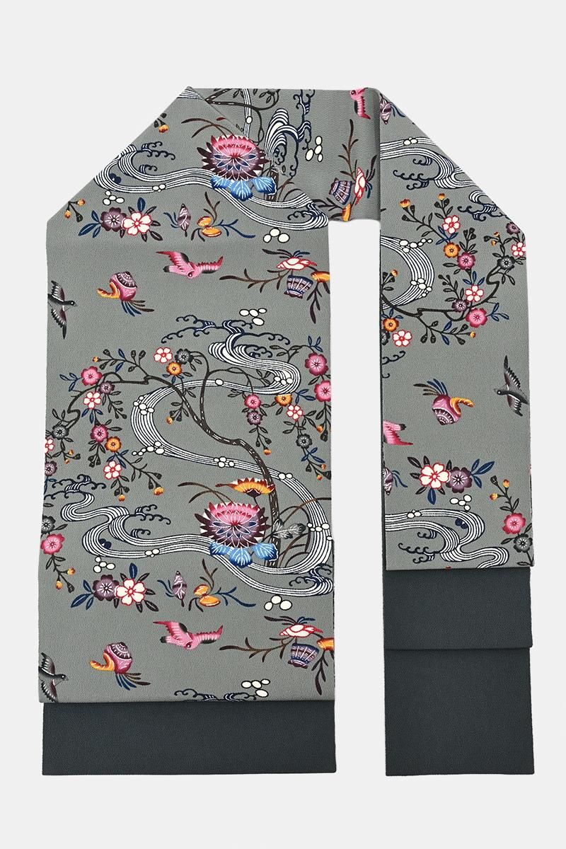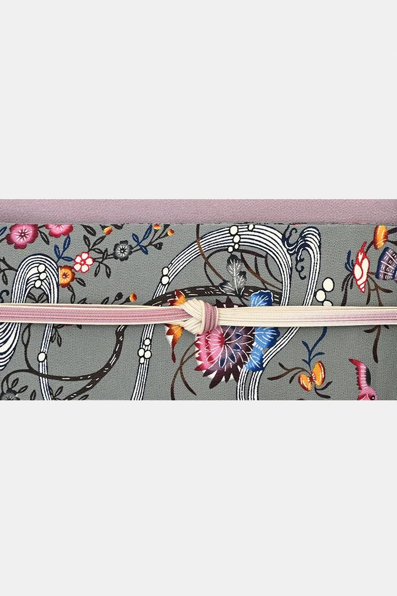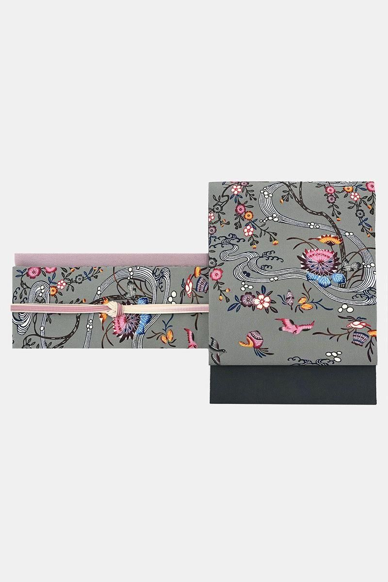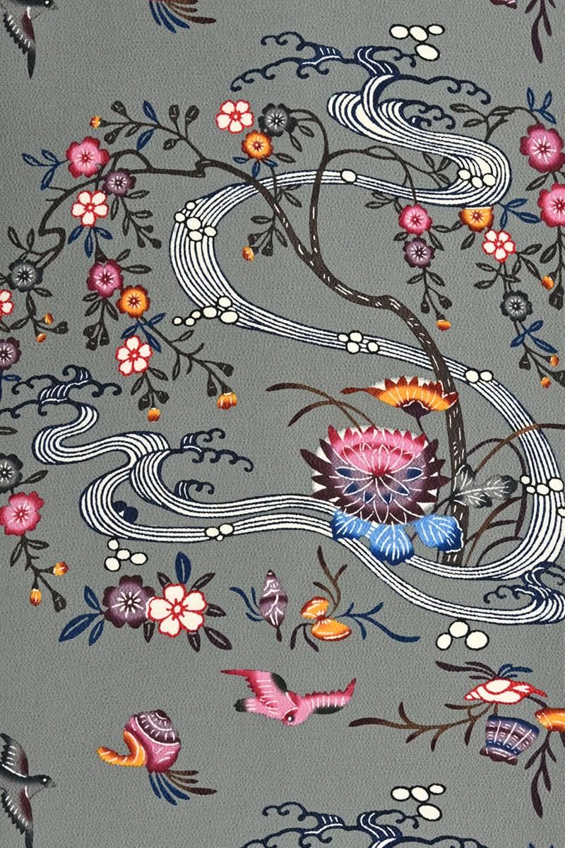 さらに灰みを強めた山鳩色が近いでしょうか。僅かに緑みを帯びた鈍いグレイ系の縮緬の地に藍鉄色、媚茶色、葡萄鼠色や黄土色に退紅色などの濃淡を細やかに使い分け、流水に菊花や桜、飛び交う小鳥たちや貝藻など伝統的なモチーフが流れるように配された本紅型の名古屋帯です。こちらは人間国宝 玉那覇有公さんの作。玉那覇さんは城間栄喜さんに師事し紅型の技法を習得、熟練の技術と優れた意匠力によって現代に生きる紅型をつくり続けておられます。連続する精緻な幾何文様など洗練された作品群を連想させる作り手さんですが、こちらは愛らしい花鳥やどこか微笑ましい貝たちが織りなす穏やかな風景の一点。45cmほどの長さにまとめられ、ひと色抑えたシックな配色で表現された優美なモチーフにほっと心癒されますね。伝統的な紅型らしさをきちんと残しつつ、この方らしいモダンな個性が生きる風趣豊かな優品。紬や小紋の装いにいかがでしょうか。