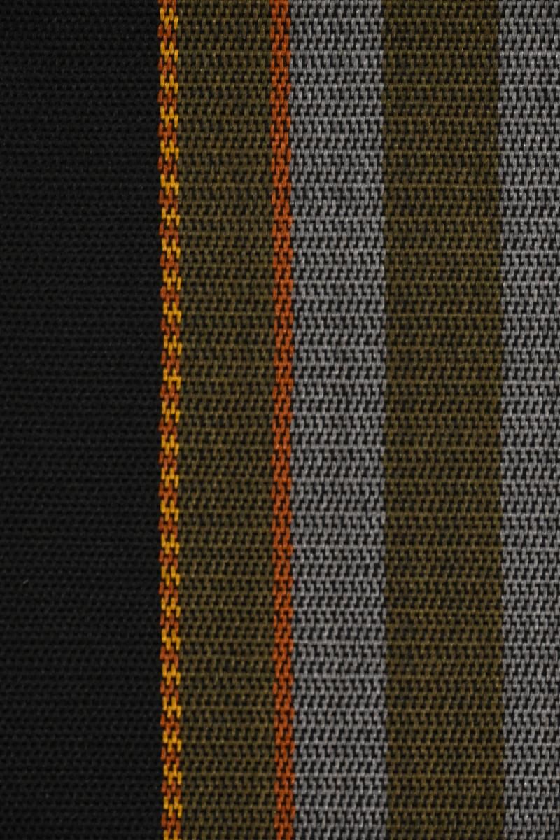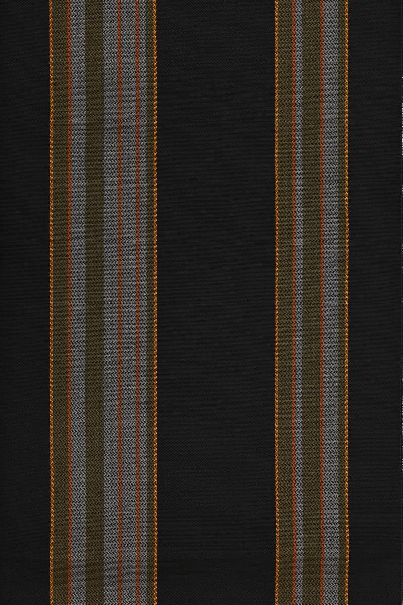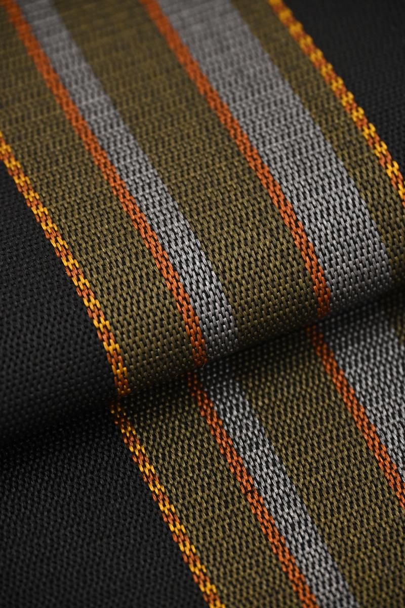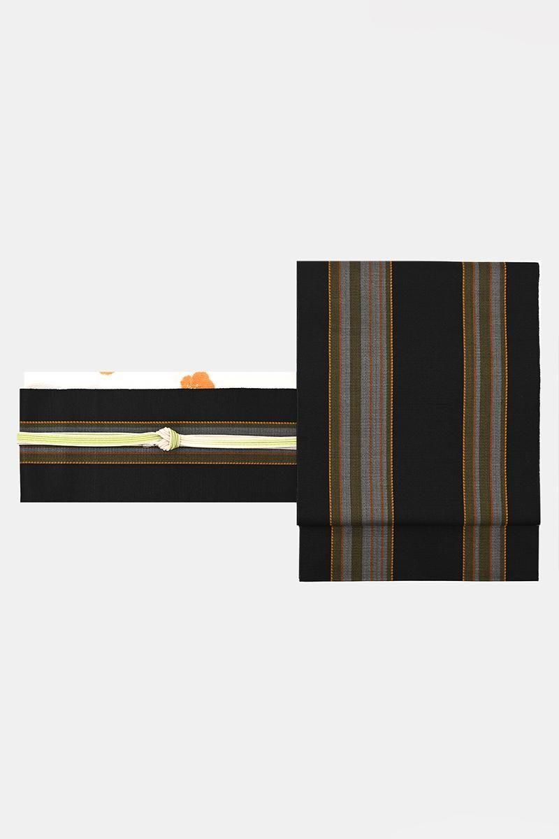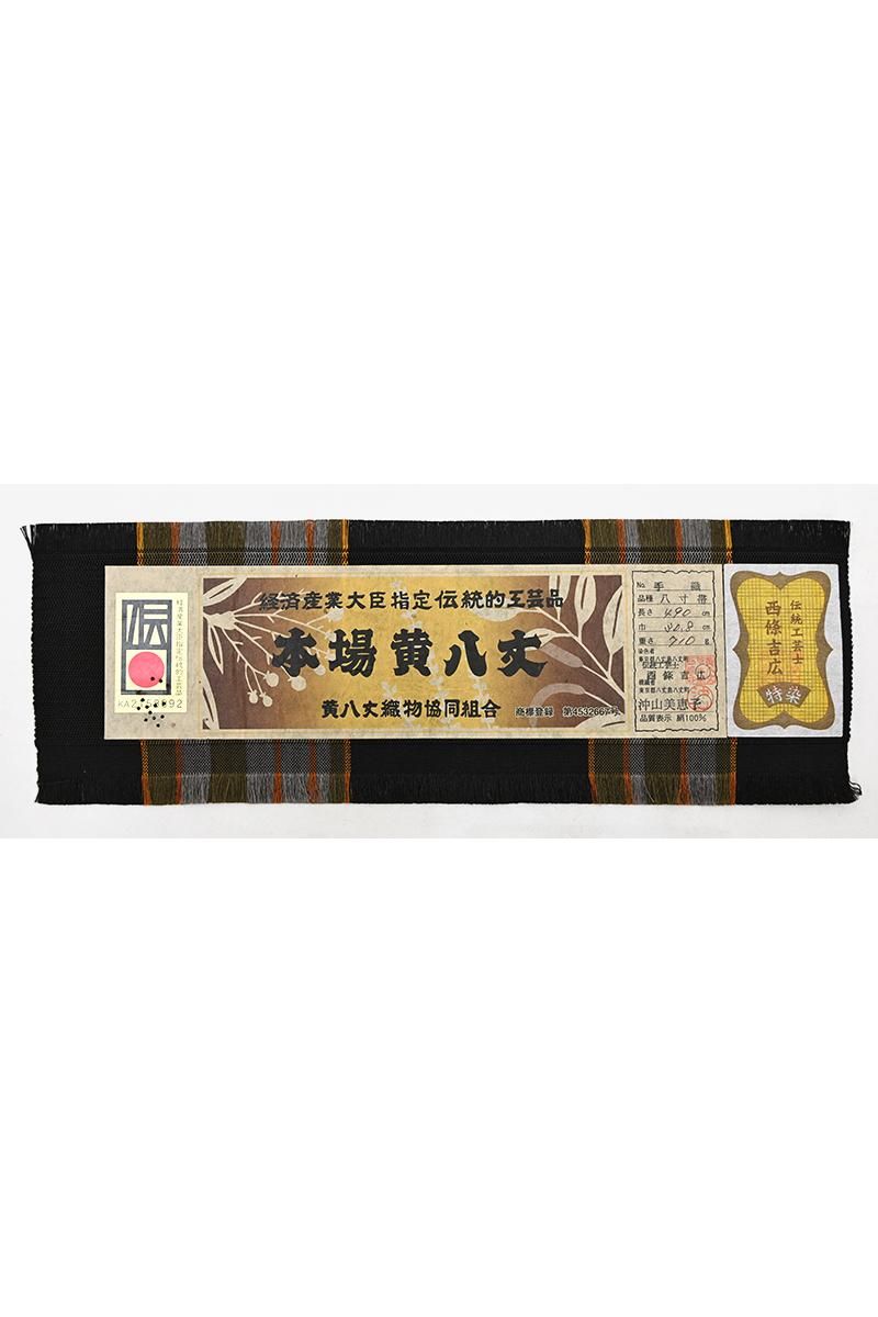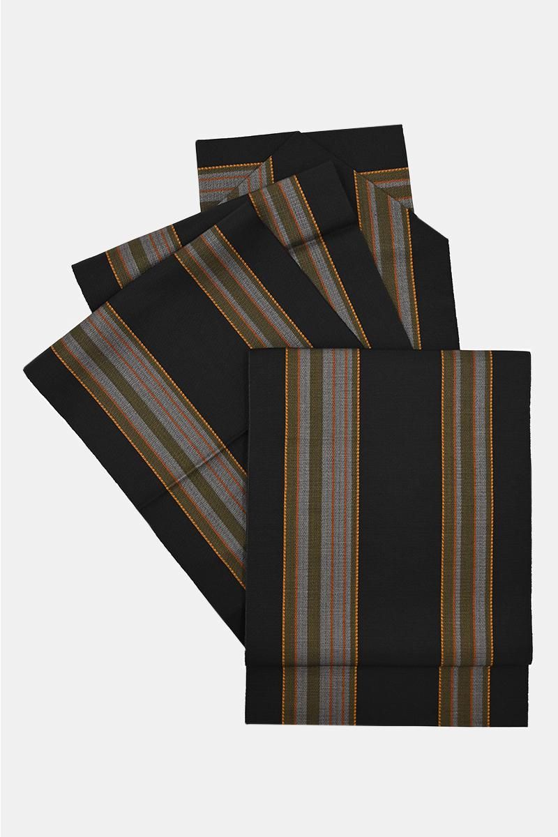 八丈島に伝わる黄八丈は、島に自生する八丈刈安、マダミ、そして椎と泥染めから得た金茶、鳶、黒の3色の糸を用い、手機で織り上げられる上質な絹織物です。上記を材として、多大な手間と体力を要する作業を20回から40回も繰り返すという難儀な仕事を重ねて染め上げられた美しく堅牢な色は、どのお色目も眩しいほどの艶やかさを備えており、その輝きをそのまま映し出した織りの景色には、他にはない個性が感じられます。こちらはその三色のバリエーションから選ばれた彩りを用いて、力強い縞を表現した八寸名古屋帯。緯糸には深々とした黒を、経糸には金茶と鳶に加えてブロンズ系やグレイ系の鈍い中間色の糸を組み合わせることで、渋みのある落ち着いた縞の景色が生まれていますね。輝くような光沢と深みある色が確かな存在感を見せてくれる黄八丈の帯。上質な絹糸を手機で丹念に織り上げたお品はとてもしなやかで扱い易く、締め心地の良さにも定評があります。紬や小紋に合わせて、気軽なお出かけにいかがでしょうか。