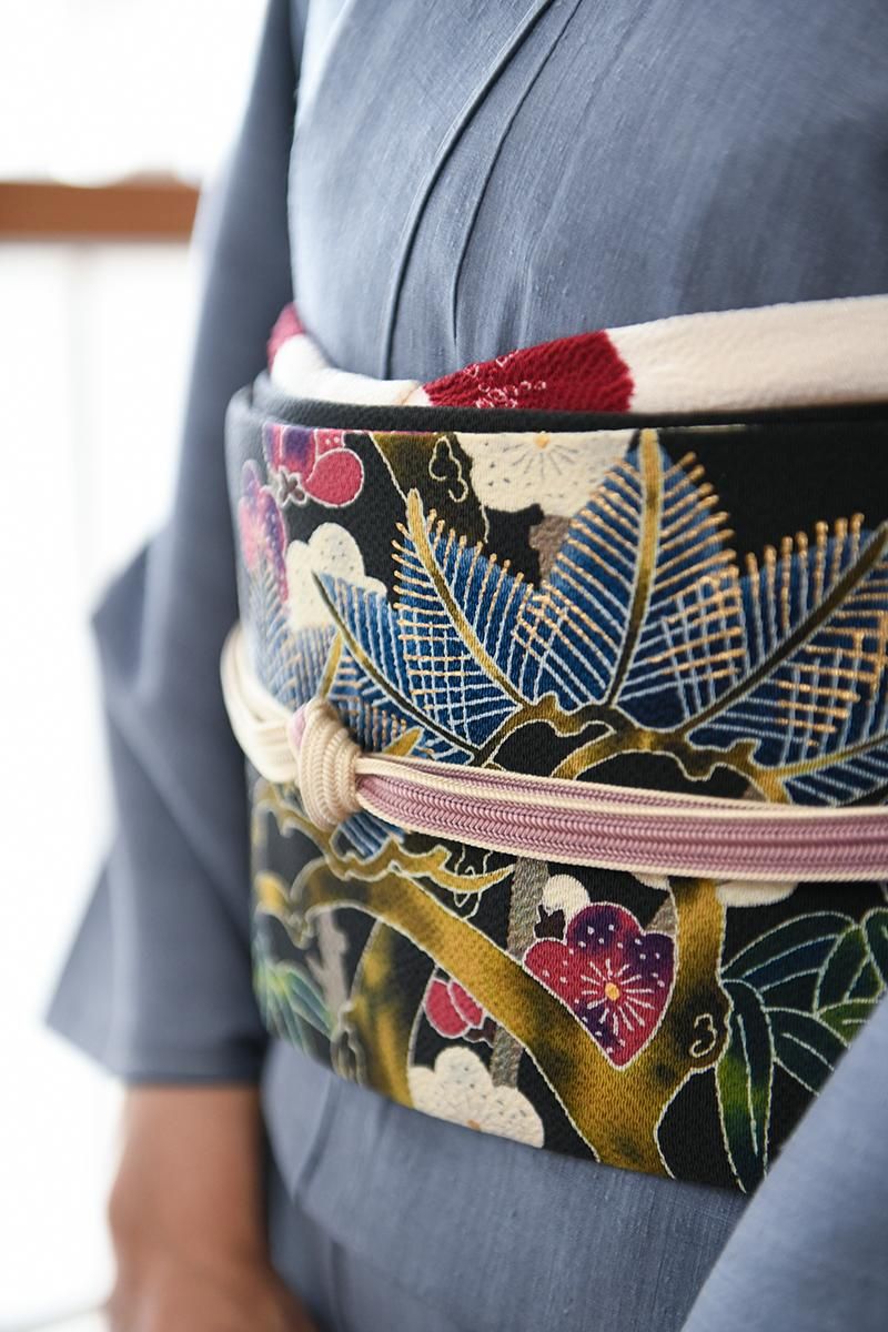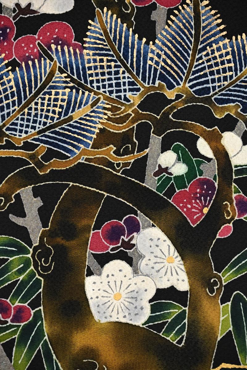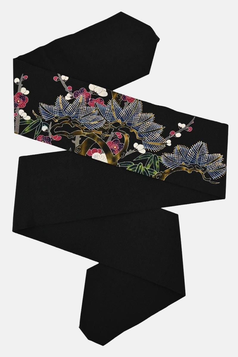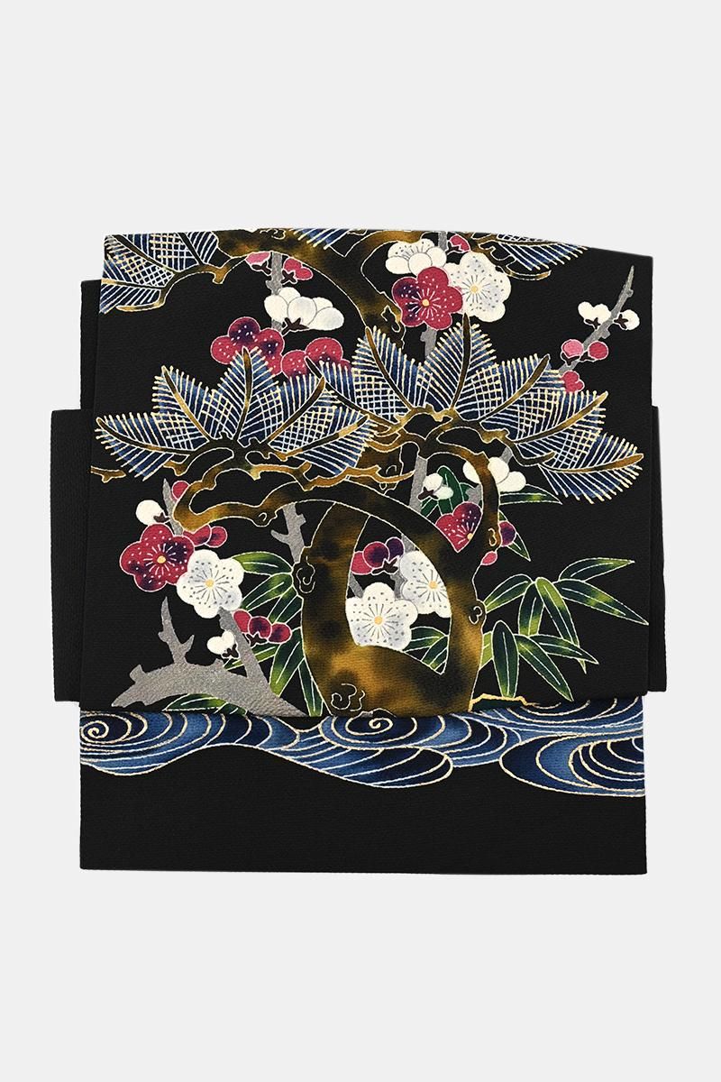 日本各地の紬織から紅型や藍染め、そして手描友禅等々幅広い技法への理解をもとに、極上の素材と丹念な手仕事による贅沢な着物や帯を遺された染織家・浦野理一さんの作品から、黒の縮緬地に華やかな松竹梅図が描かれた二部式の染名古屋帯です。渦巻く流水には藍の濃淡を、力強い枝振りの老松の幹枝には黄唐茶色に黒色、葉には金彩と呉須色を乗せ、竹には深緑色の濃淡を、梅花には蘇芳色と白色を置いたお品。全体に配したたらし込みのような暈かしがとても印象的で、迫力ある景色に一層の存在感を与えていますね。花木のあふれんばかりの生命力が見事に映し出された染帯の優品。この方の手描友禅のお品は小袖を思わせる華麗な訪問着に代表されますが、こちらのような作品を手に取りますと、帯という小さな面積の中にもその圧倒的な個性がしっかりと息づいていることを実感します。染め帯ながら少し改まった装いにも通用する晴れやかな格調を備えており、上質な織りの着物から格高小紋、付下げなどの装いに合わせて、様々なお席で活躍してくれることと思います。自然なかたちでお太鼓が作られた二部式の仕立て。旅行先の着付けなどにも重宝にお使いいただけそうですね。ぜひこの機会にお手に取ってご覧くださいませ。