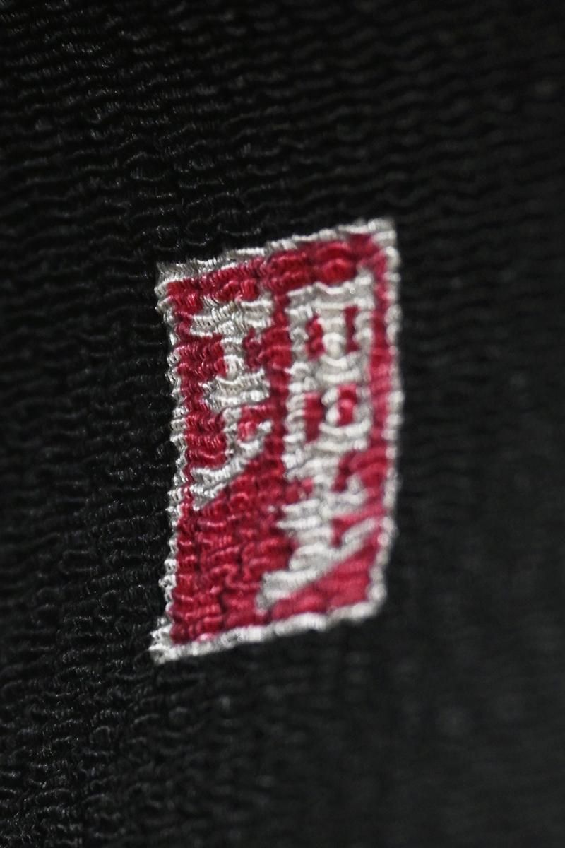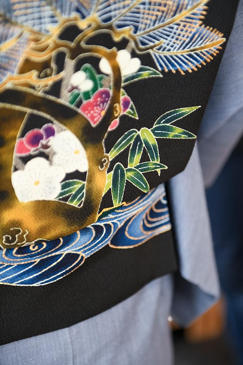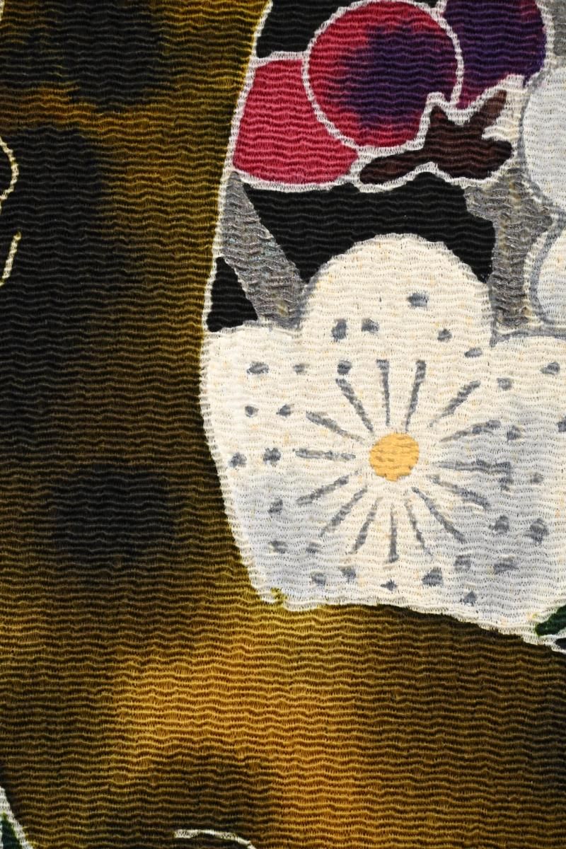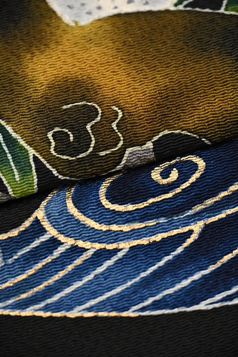 日本各地の紬織から紅型や藍染め、そして手描友禅等々幅広い技法への理解をもとに、極上の素材と丹念な手仕事による贅沢な着物や帯を遺された染織家・浦野理一さんの作品から、黒の縮緬地に華やかな松竹梅図が描かれた二部式の染名古屋帯です。渦巻く流水には藍の濃淡を、力強い枝振りの老松の幹枝には黄唐茶色に黒色、葉には金彩と呉須色を乗せ、竹には深緑色の濃淡を、梅花には蘇芳色と白色を置いたお品。全体に配したたらし込みのような暈かしがとても印象的で、迫力ある景色に一層の存在感を与えていますね。花木のあふれんばかりの生命力が見事に映し出された染帯の優品。この方の手描友禅のお品は小袖を思わせる華麗な訪問着に代表されますが、こちらのような作品を手に取りますと、帯という小さな面積の中にもその圧倒的な個性がしっかりと息づいていることを実感します。染め帯ながら少し改まった装いにも通用する晴れやかな格調を備えており、上質な織りの着物から格高小紋、付下げなどの装いに合わせて、様々なお席で活躍してくれることと思います。自然なかたちでお太鼓が作られた二部式の仕立て。旅行先の着付けなどにも重宝にお使いいただけそうですね。ぜひこの機会にお手に取ってご覧くださいませ。