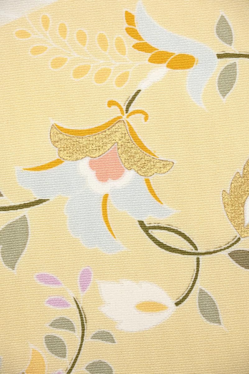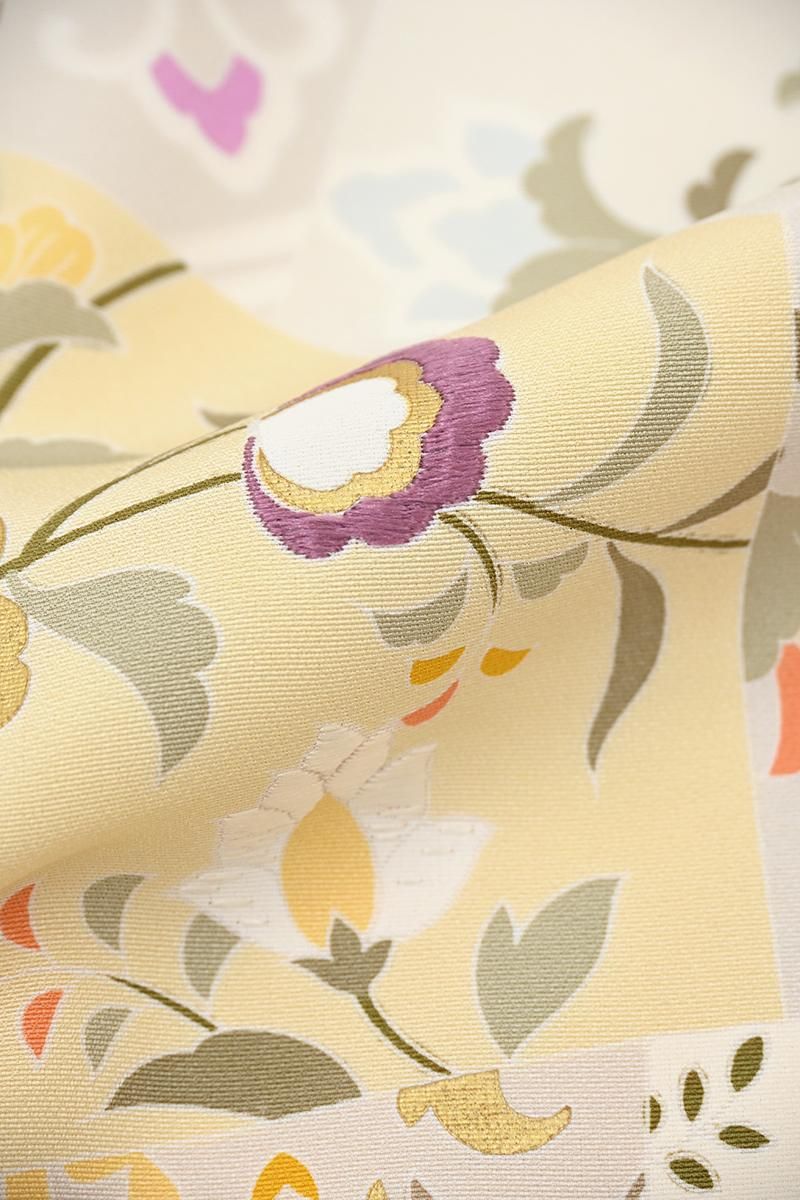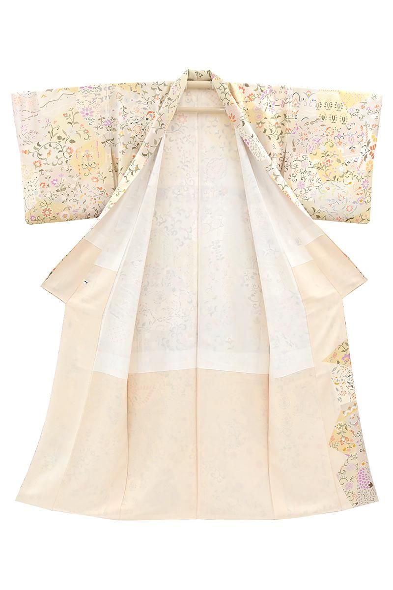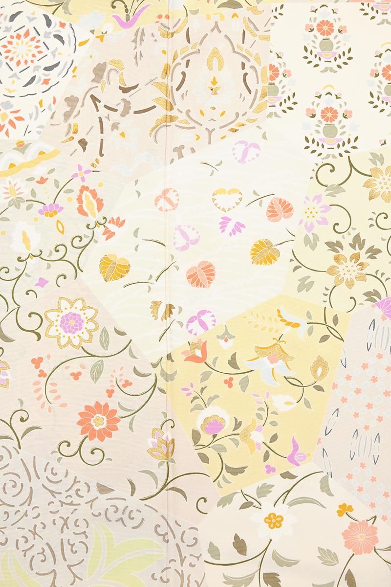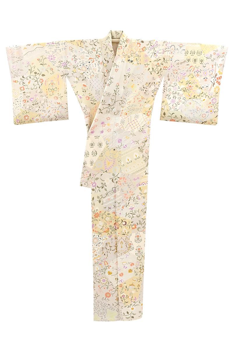 淡い亜麻色、麹色に灰白色、白練色など柔らかなグレージュ系の様々なお色目で氷割れのような不規則な形に場を分け、それぞれに花唐草や笹蔓、更紗花など様々なモチーフを散りばめた着物です。小紋かと思わせるような細やかな総柄ですが、複雑な構成は全て繋がっており、また一部には精緻な刺繍も施されたお品。背景の優しい彩りに綺麗に映える若紫色、朱華色などの優しい華のある彩りに金彩を添えた景色は、統一感のある美しいトーンがとても印象的ですね。柔らかものの着物ならではの心弾む華やぎを、様々な場面で楽しんでいただけそうです。上品で軽やかな社交着は、ちょっとしたお出かけからパーティ、少し改まったお席まで、現代の着物シーンでは活躍の機会が多いことと思います。ほんのりとした甘さのある明るい表情のお品、ぜひお手に取ってご覧くださいませ。