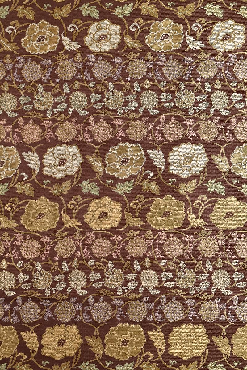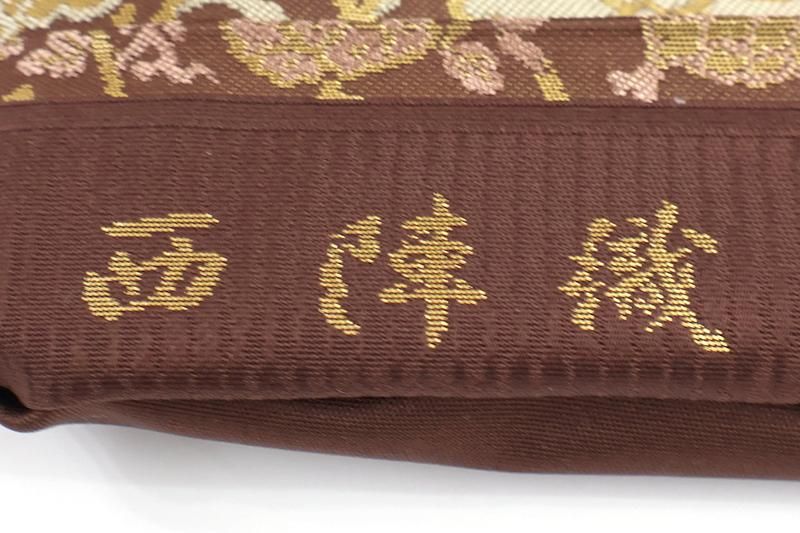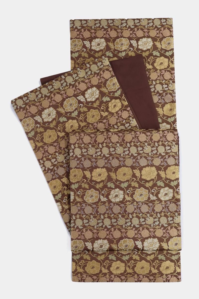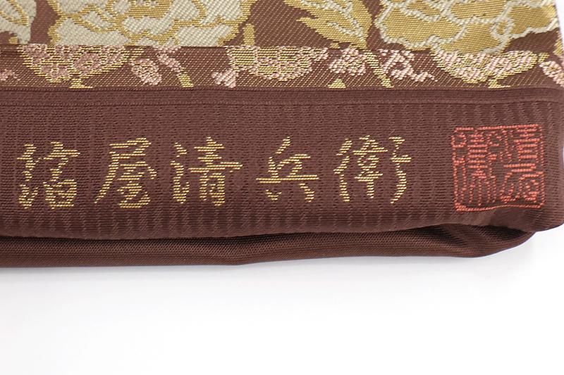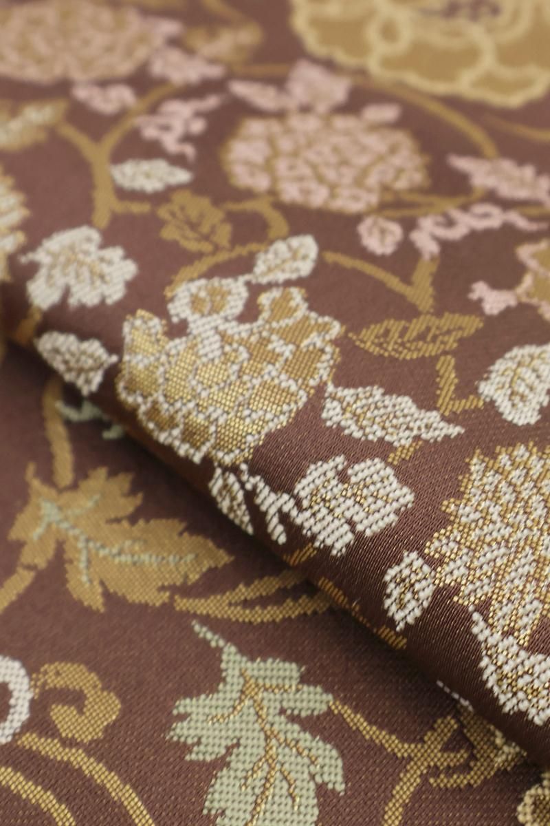 西陣 陰山織物製・箔屋清兵衛ブランドの袋帯です。こちらは煤竹色が近いでしょうか、やや赤みを帯びた、こっくりとした茶色の地に柔らかなピンクや紫などの色彩で蔓牡丹唐草文を織り出したお品。抑えたお色目が優しく気品豊かな表情を創り出していますね。色無地や江戸小紋などに合わせてお茶席などの改まった場面にいかがでしょうか。