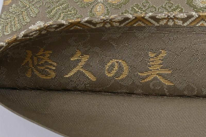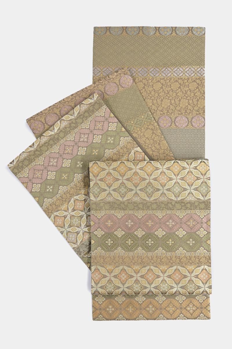 西陣 陰山織物製・箔屋清兵衛ブランドの袋帯です。こちらは肥後煤竹色が近いでしょうか、僅かに緑みを含んだくすんだ茶系の地に横段に様々な七宝の有職文を配したお品、穏やかに煌めく古典文様の端正な表情が装いを格調高く引き締めてくれることと思います。色無地や江戸小紋などに合わせて、お茶席などの改まった場面にいかがでしょうか。