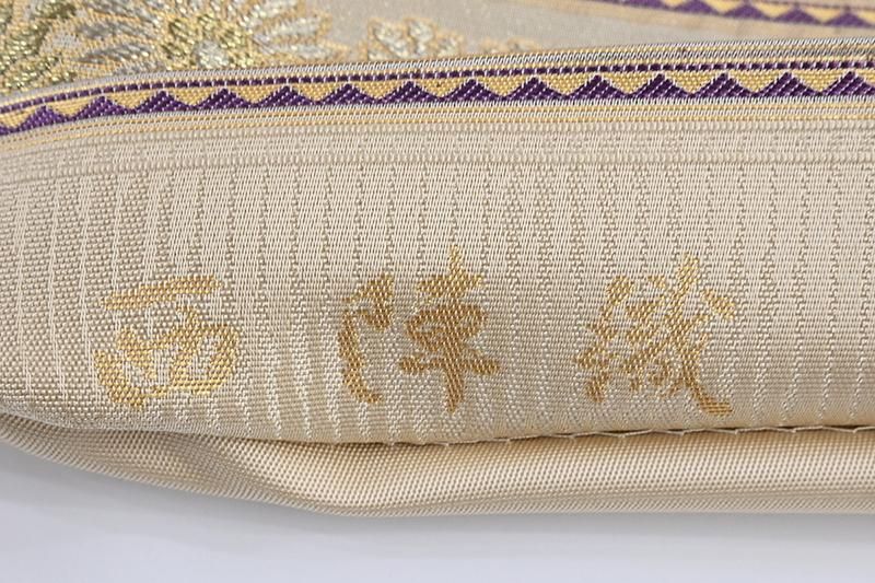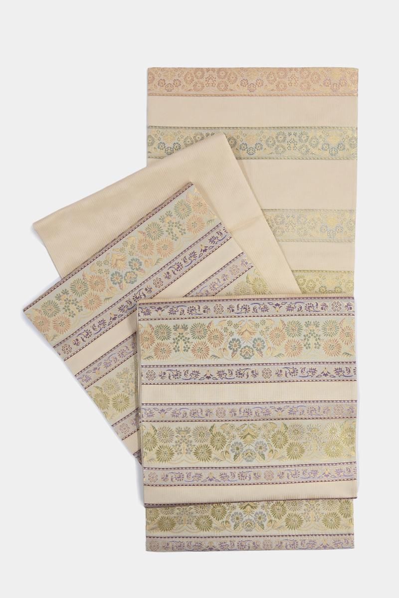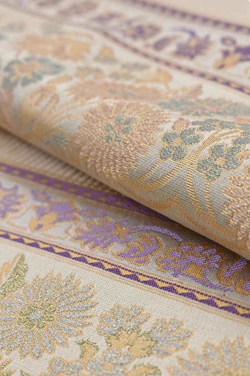 西陣 陰山織物製・箔屋清兵衛ブランドの袋帯です。こちらの地の色は練色が近いでしょうか、まろやかなクリームベージュの地に穏やかなパステルカラーを用いて様々な花葉を横段に配したお品、優しい彩りと金糸の煌めきで表された細やかな意匠に落ち着いた気品が漂いますね。色無地や江戸小紋、付下げなどに合わせてお出かけや改まったお席での装いにいかがでしょうか。