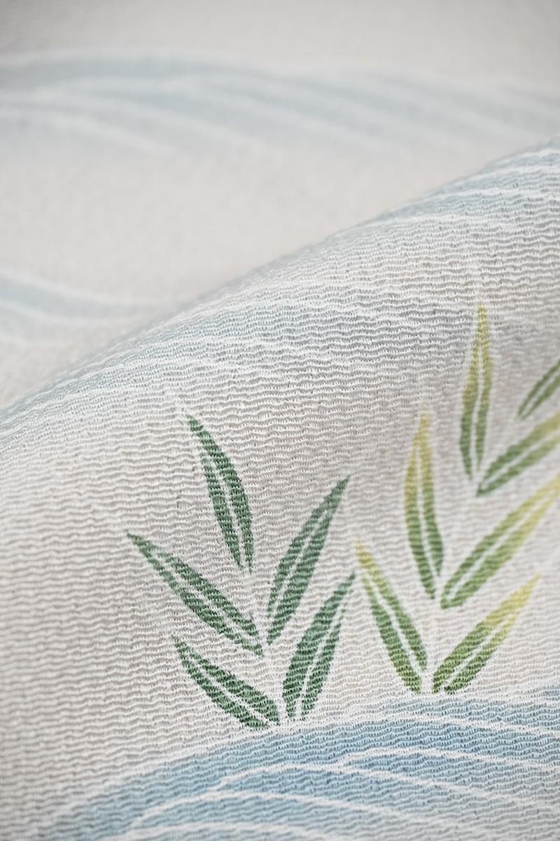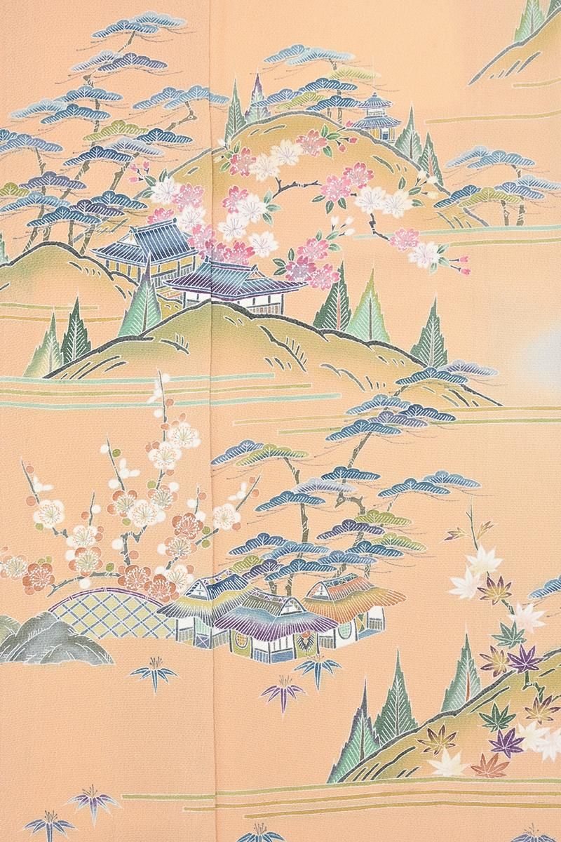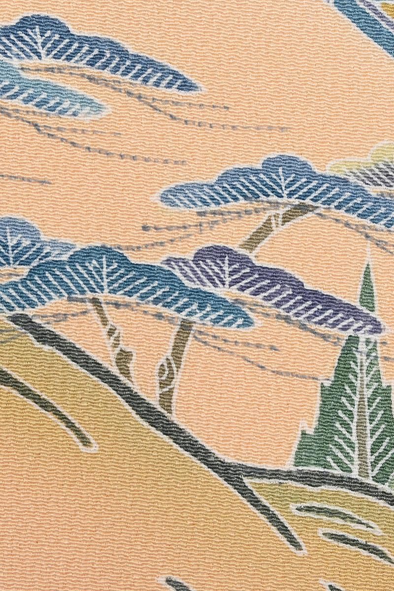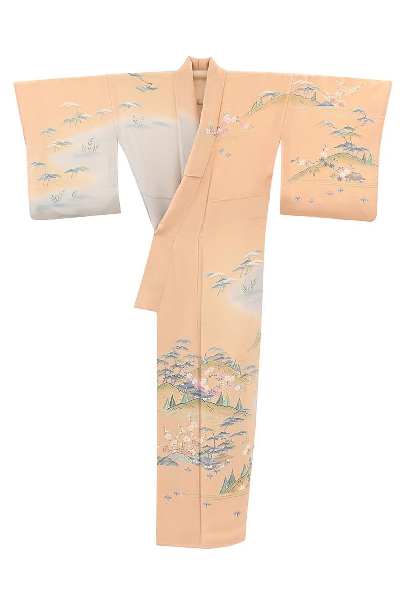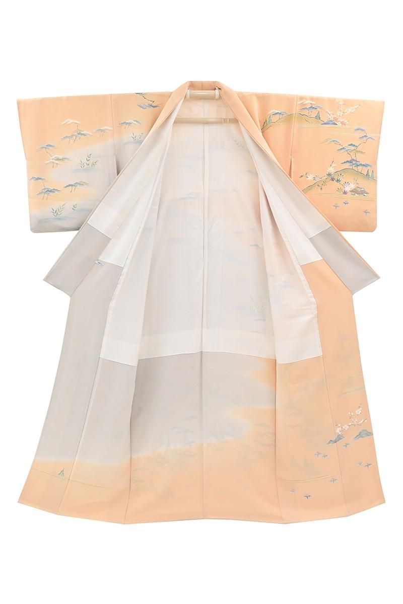 淡香色と灰白色が近いでしょうか。やや灰黄みを含んだ淡く柔らかな橙系の色と同じく灰黄みを帯びたオフホワイトの二色で地をわけ、縹色の濃淡色や葡萄鼠色、伽羅色 利休色など落ち着いた淡彩を添えて、松竹梅に楓や桜など折々の花木と共に水辺の里の風景が、繊細な筆で丹念に描き上げられた静かな趣きの訪問着です。こちらは友禅の世界で初の人間国宝に認定された故 上野為二さんの優美な作風を受け継ぐ京加賀友禅の工房 清染居さんの作。上野家ならではの極細い糸目の美しさが冴える手描友禅の贅沢な存在感を備えながらも、市井の人々の平和でのどかな暮らしを思わせる風景や、折々の花の楚々とした華やぎが、見る人の心も温かく和ませてくれますね。工房を主宰するのは為二さんの次男・清二さんに嫁がれた上野街子さん。上野家の伝統である精緻な古典意匠の高い格調に加え、仄かに滲む品の良い女性らしさは、この方が育て上げた清染居の個性ですね。さらりと手からこぼれ落ちる上質な縮緬の風合いと共に古典美の本道をお楽しみ頂ける、気品香る一点。ぜひお手に取ってご覧くださいませ。