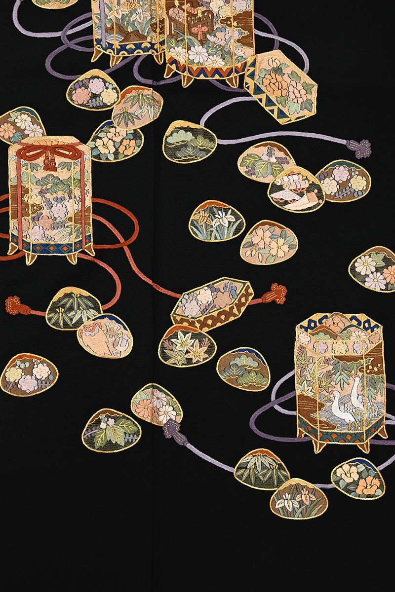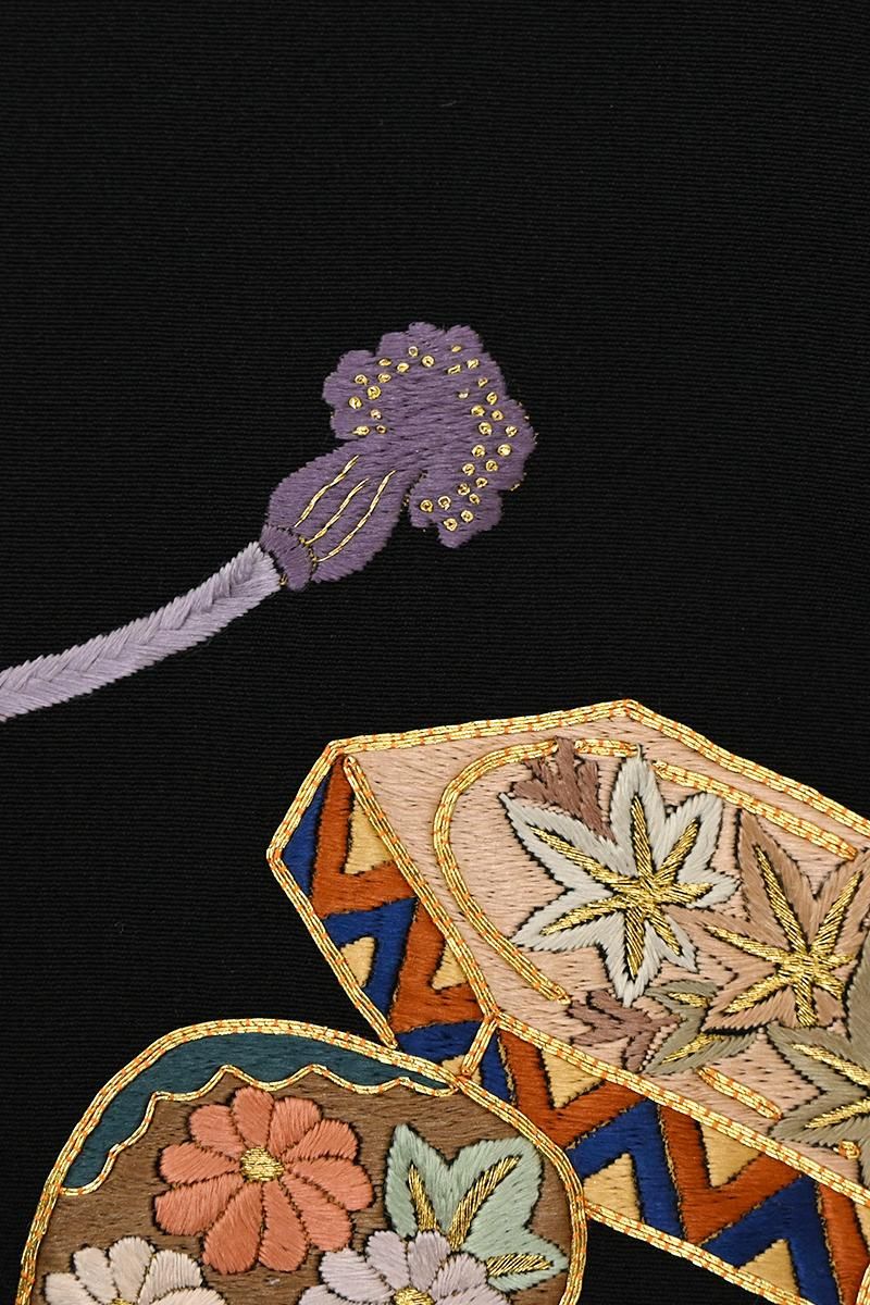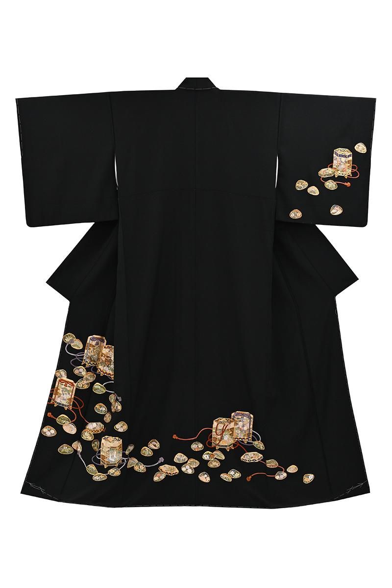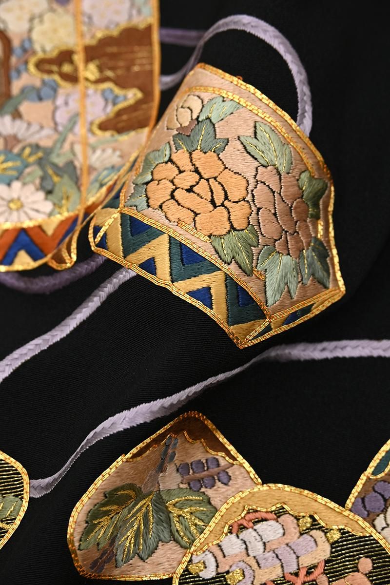 深い黒色の地に、精緻な繍いによって貝桶文が散らされた訪問着です。雲取りに丹頂鶴、松竹梅に御所車などを配した貝桶、宝尽くしに桜、牡丹や椿、楓に杜若など折々の花木などを置いた貝等々、数え切れないほどの様々な意匠が丹念に縫い取られ、肩袖、裾を華やかに彩っていますね。一歩控えた落ち着いた色と静かに輝く金糸が創る、まさに贅を極めた世界。絹糸の柔らかな光沢と共にふっくらと浮かび上がる、刺繍による表現ならではの迫力そして重厚な存在感が、着る人を晴れやかに引き立ててくれることと思います。どのような場面でも安心してお召しいただける、高い格調と祝意に満ちた正統派古典意匠の美しい社交着を、ぜひこの機会にお手に取ってご覧くださいませ。