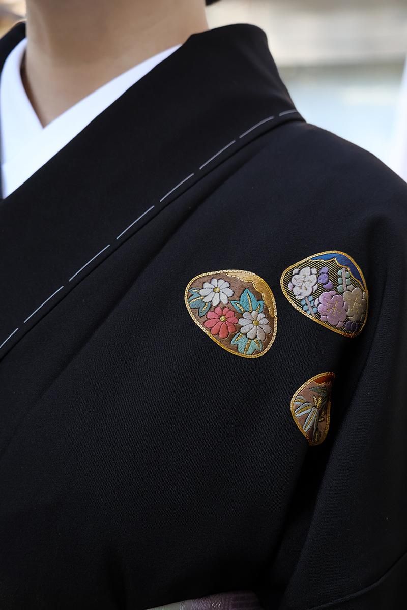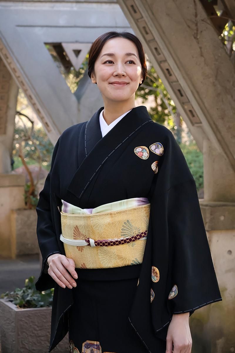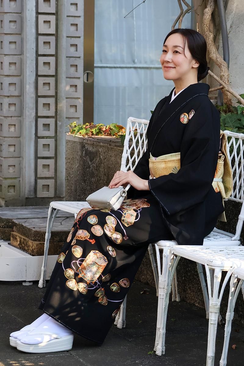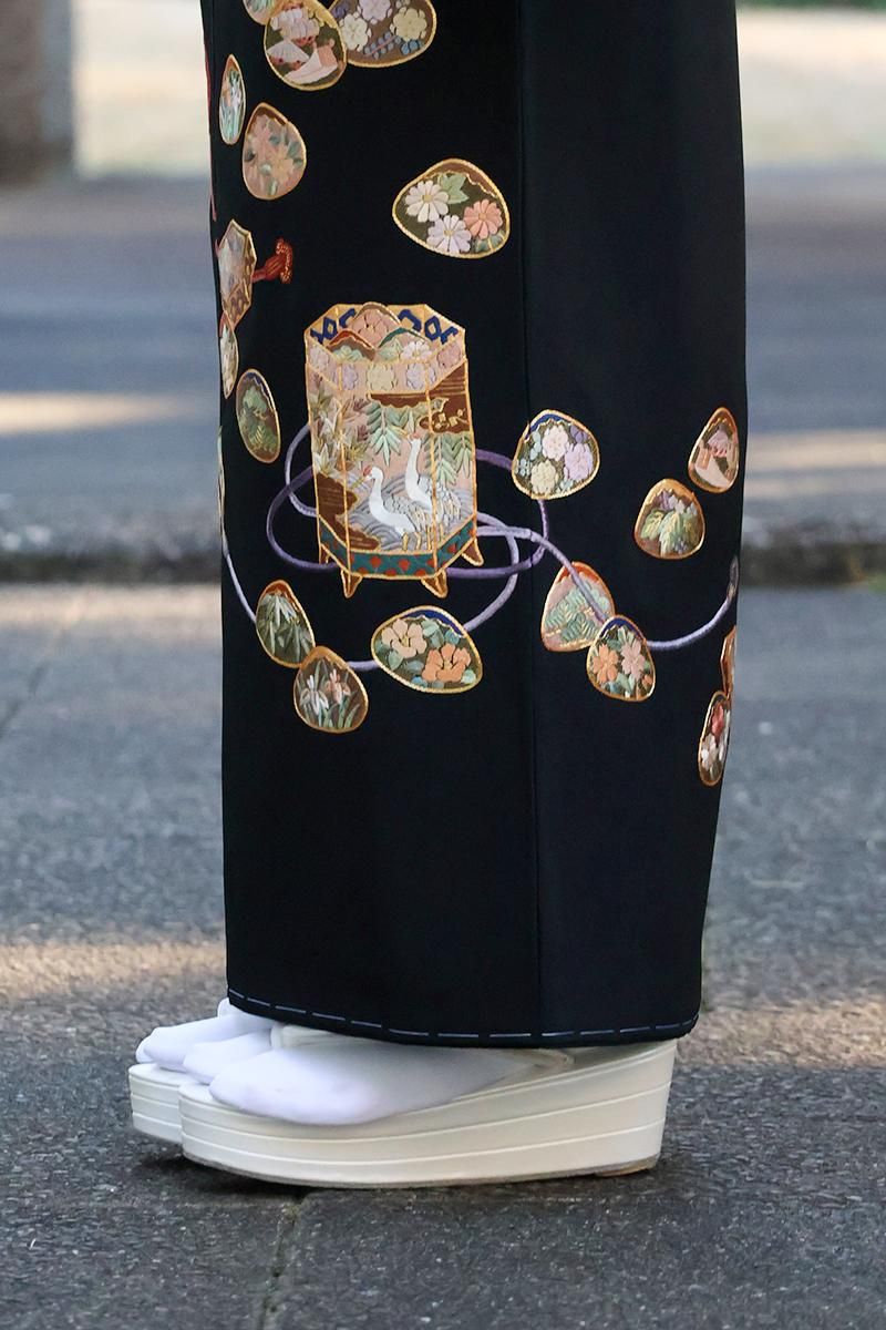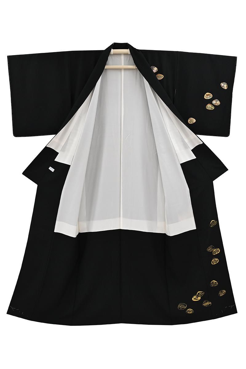 深い黒色の地に、精緻な繍いによって貝桶文が散らされた訪問着です。雲取りに丹頂鶴、松竹梅に御所車などを配した貝桶、宝尽くしに桜、牡丹や椿、楓に杜若など折々の花木などを置いた貝等々、数え切れないほどの様々な意匠が丹念に縫い取られ、肩袖、裾を華やかに彩っていますね。一歩控えた落ち着いた色と静かに輝く金糸が創る、まさに贅を極めた世界。絹糸の柔らかな光沢と共にふっくらと浮かび上がる、刺繍による表現ならではの迫力そして重厚な存在感が、着る人を晴れやかに引き立ててくれることと思います。どのような場面でも安心してお召しいただける、高い格調と祝意に満ちた正統派古典意匠の美しい社交着を、ぜひこの機会にお手に取ってご覧くださいませ。