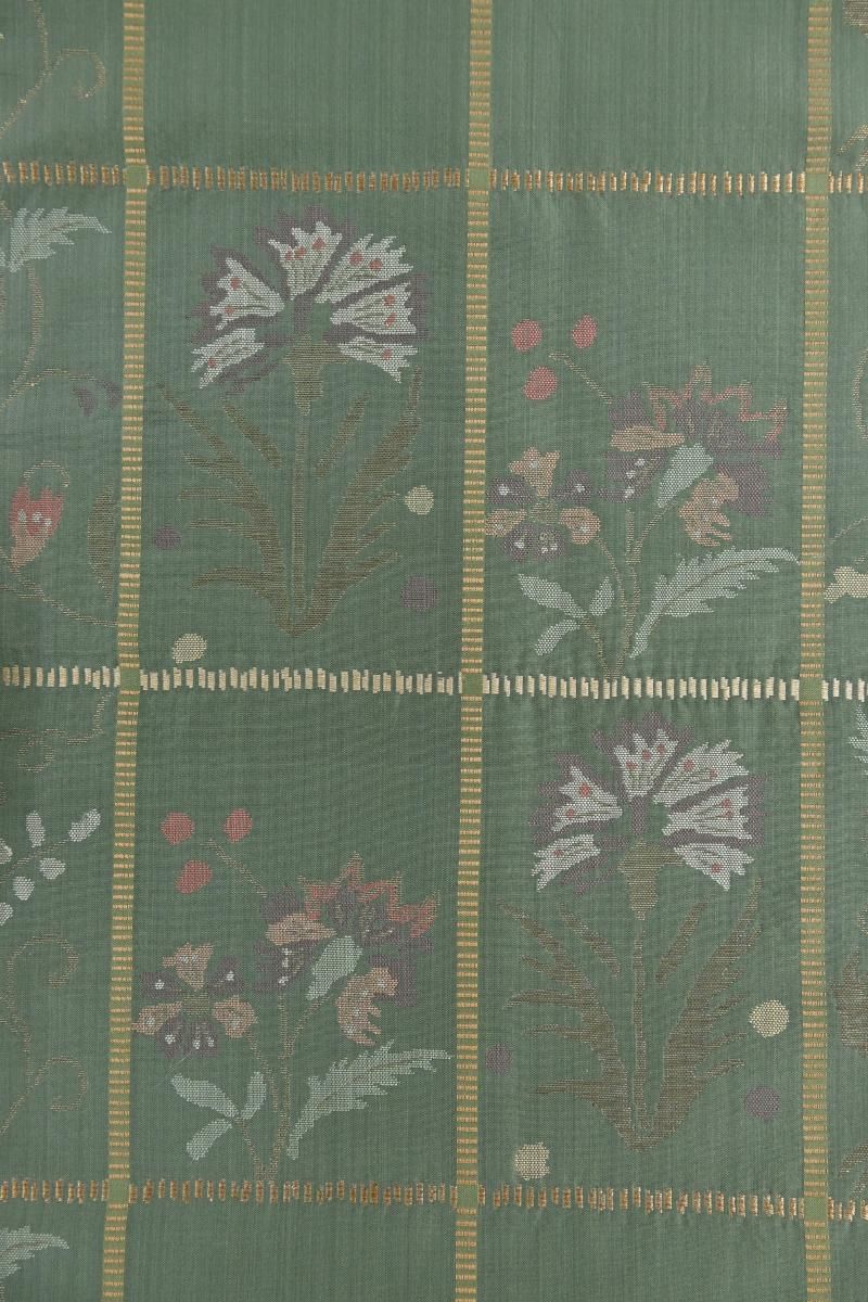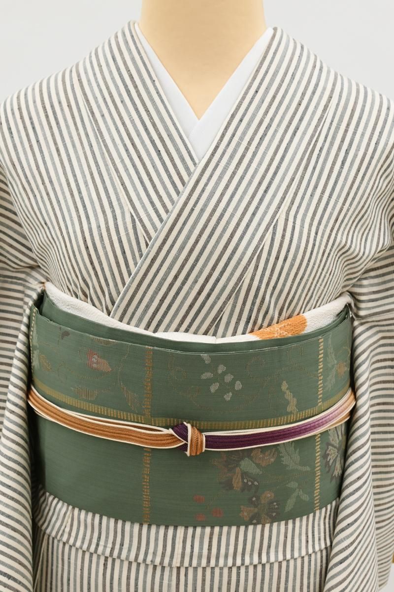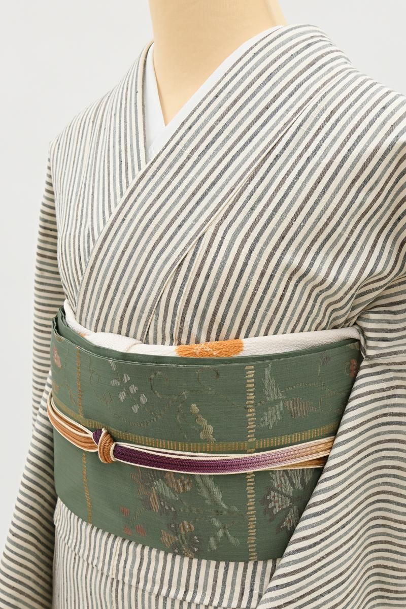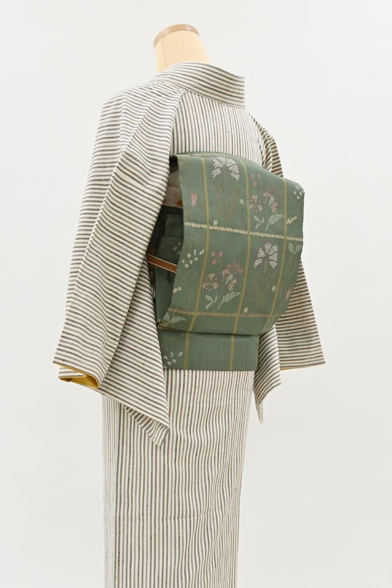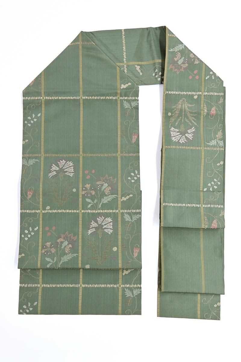 古今東西から集められた膨大な資料を基に生まれる個性豊かな意匠を、西陣の老舗機屋の手で織り上げられる工芸帯地。着物を識る方の間でもとりわけ人気の高い洛風林さんの名古屋帯です。こちらはぐっと色を深めた青白橡色が近いでしょうか、灰みの強い緑系の地に格子に唐花や花唐草を配した織名古屋帯です。つややかな地風に端正に織り出されたエキゾティックな意匠に、洛風林さんらしい存在感が感じられますね。紬や小紋などに合わせて洗練された装いをお楽しみくださいませ。