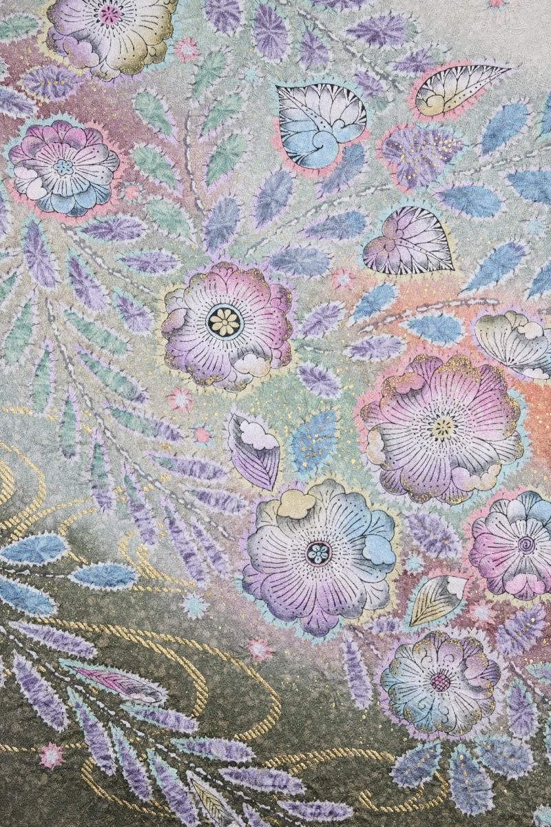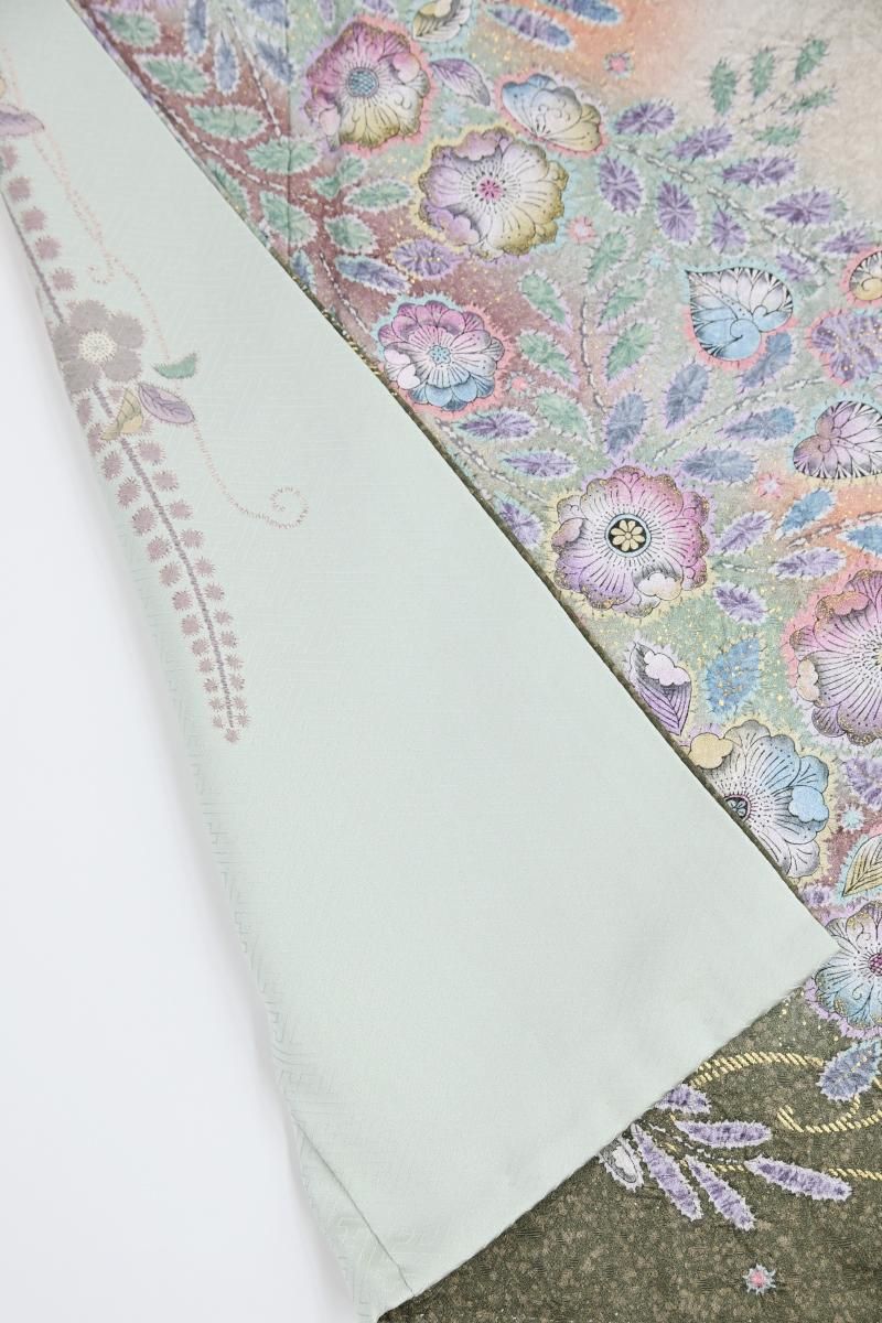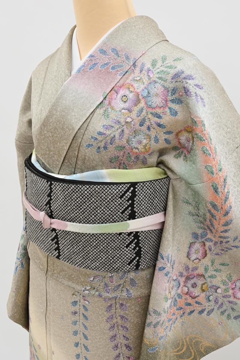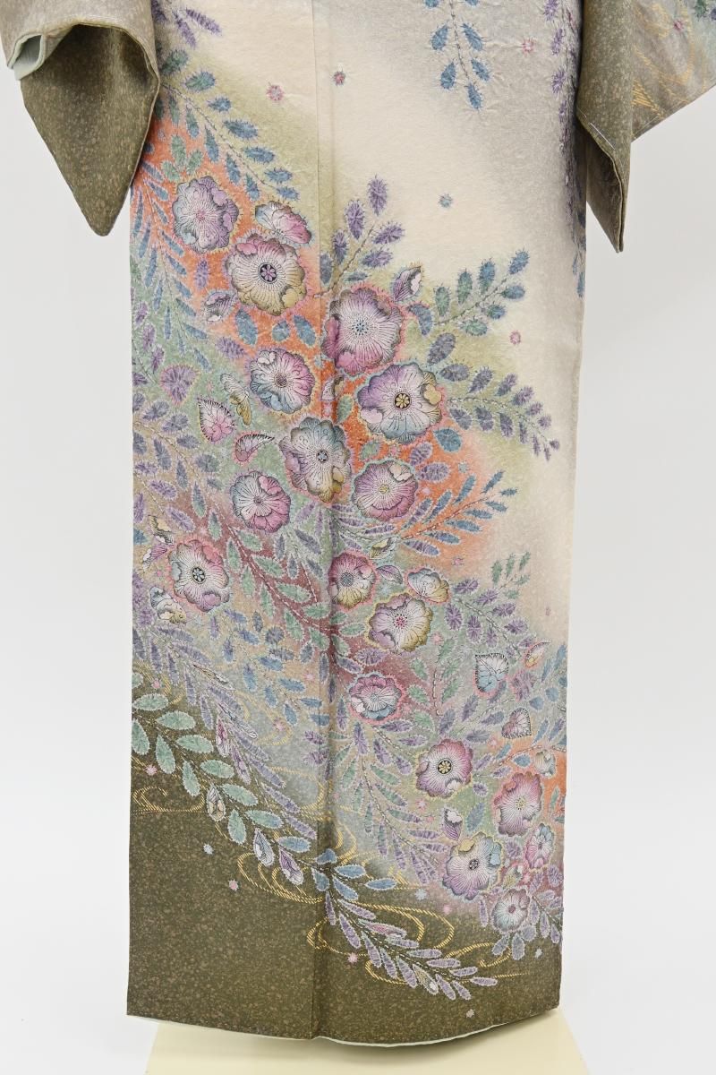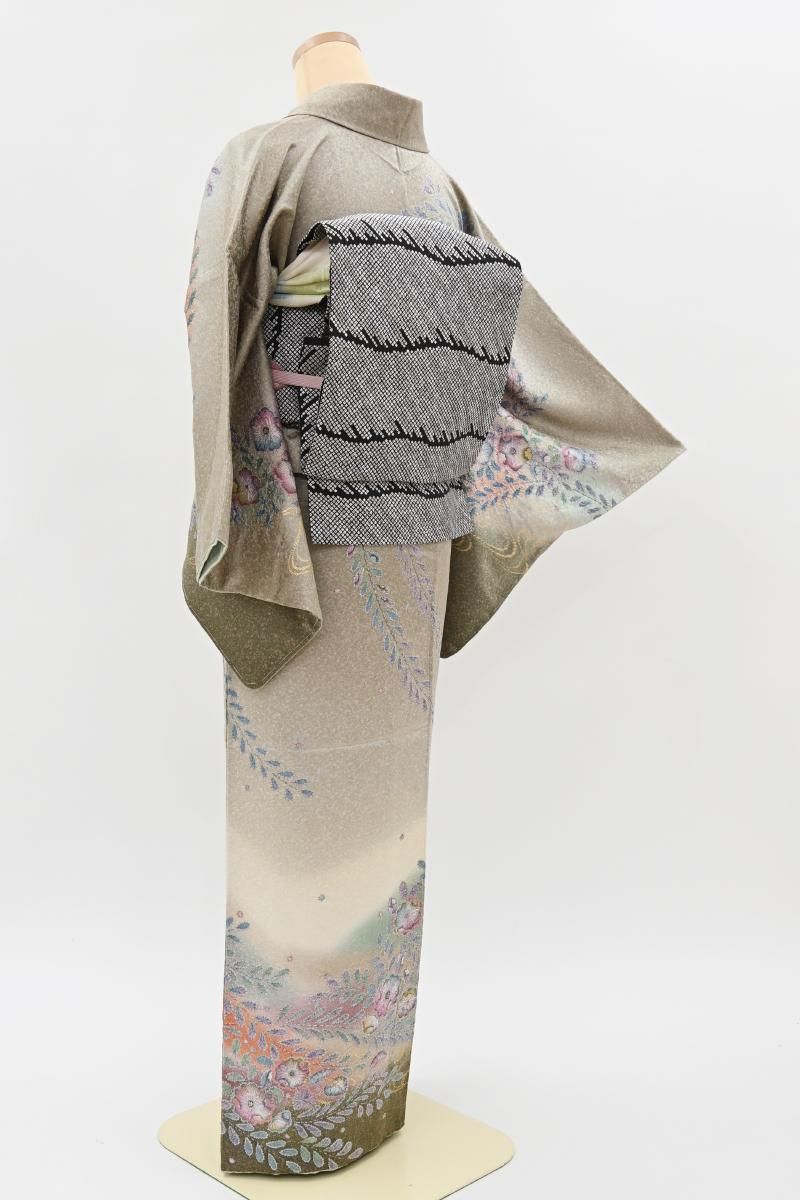 全体の印象としては肥後煤竹色が近いでしょうか、撒糊散らしを施した緑みの薄茶色系の地に、多彩な暈かしに重ねて絞り染めで辻ヶ花文をあしらった訪問着です。光の加減で花唐草の地紋が浮かぶ程よい光沢のある地風に、ゆったりと配された意匠が幻想的な景色を創るお品、しっとりとした女性らしい優雅さで着姿を引き立ててくれることと思います。様々な帯合わせで、お祝いのお席やパーティなどにいかがでしょうか。