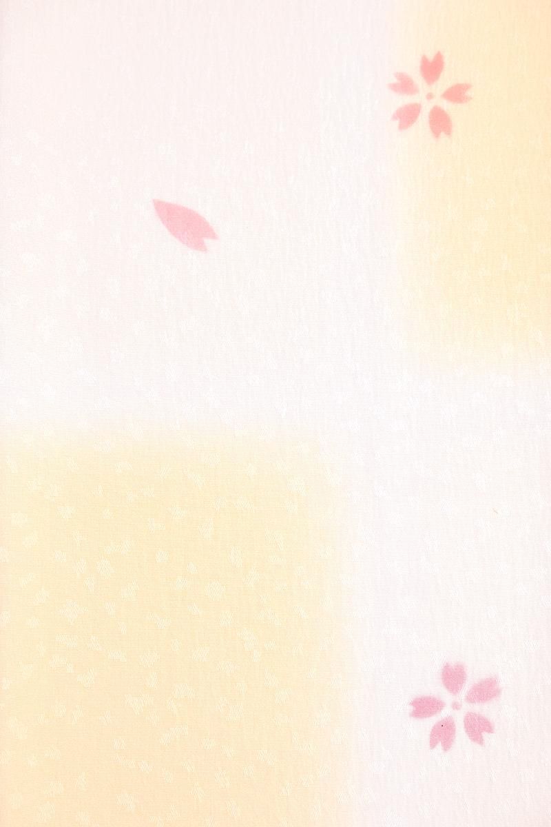 細かい紙吹雪のような地紋が浮かぶ白と薄黄色の市松暈かしの地に、ピンクや緑、紫の小ぶりな桜花の文様を散らした長襦袢です。