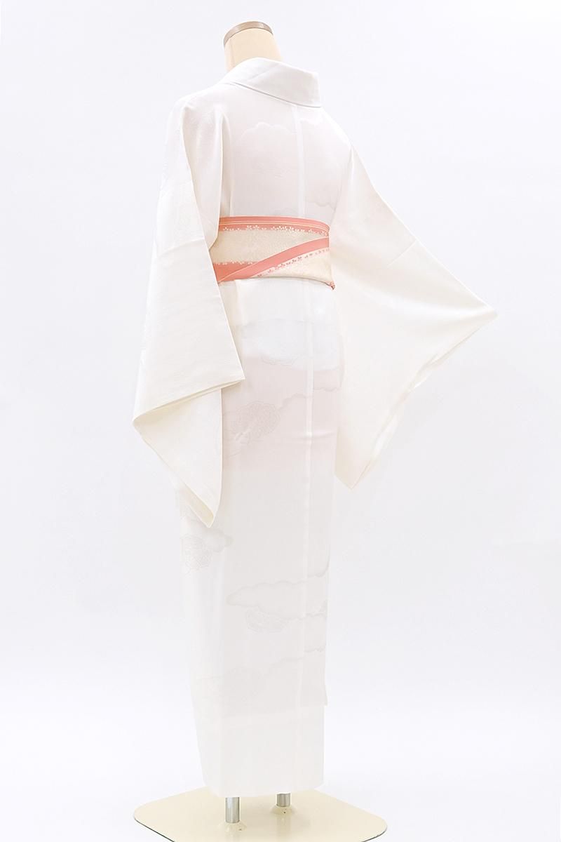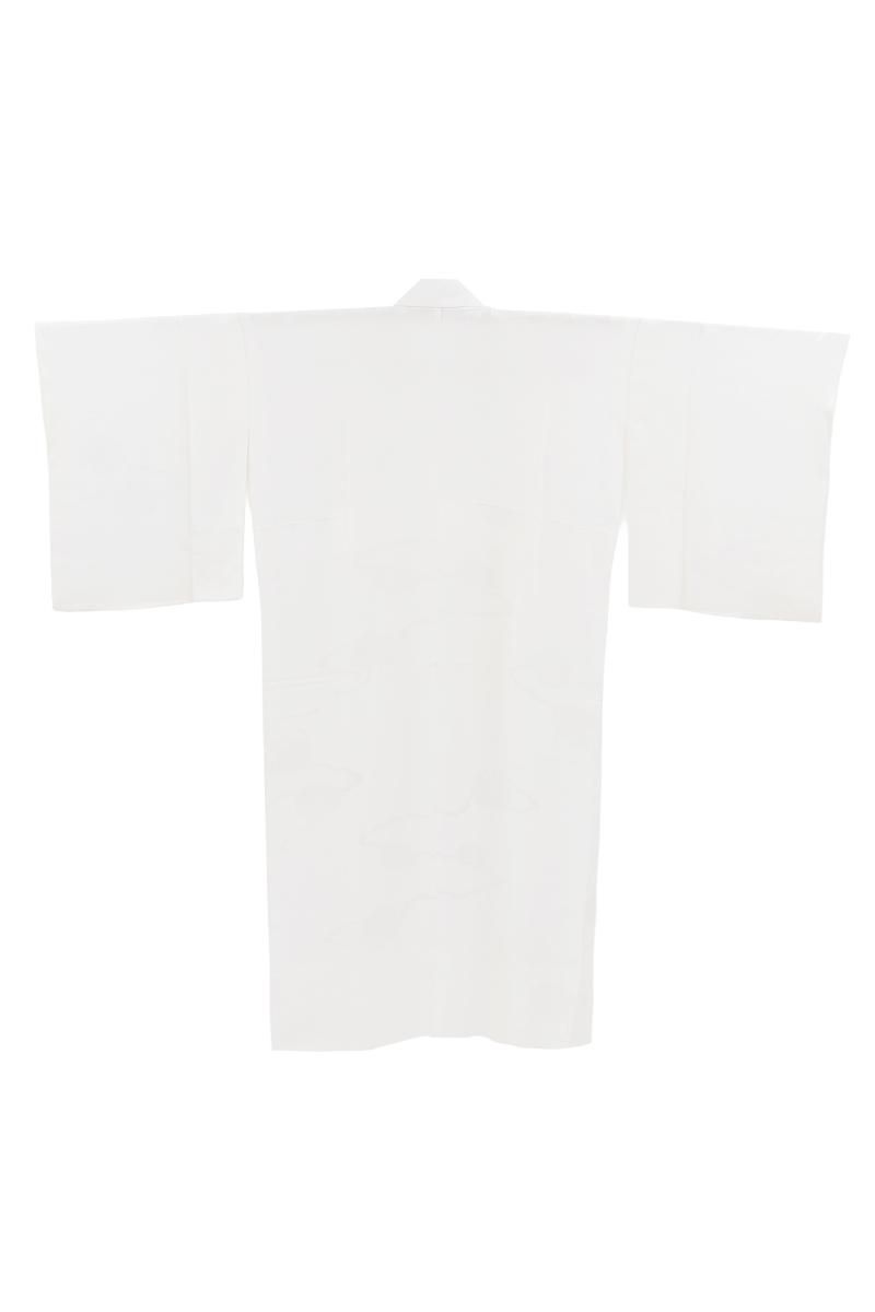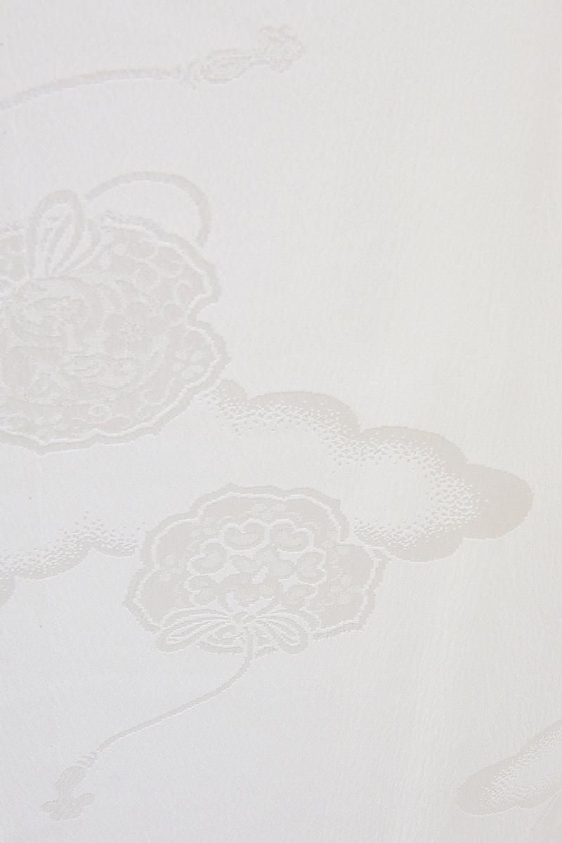 穏やかな竪しぼを帯びた白色の地に、雲と飾り紐を付けた古鏡の地紋が浮かぶ袖無双の長襦袢です。