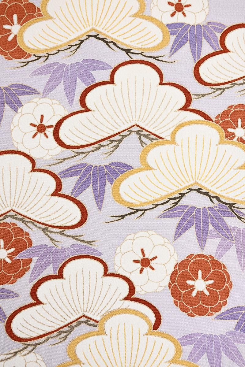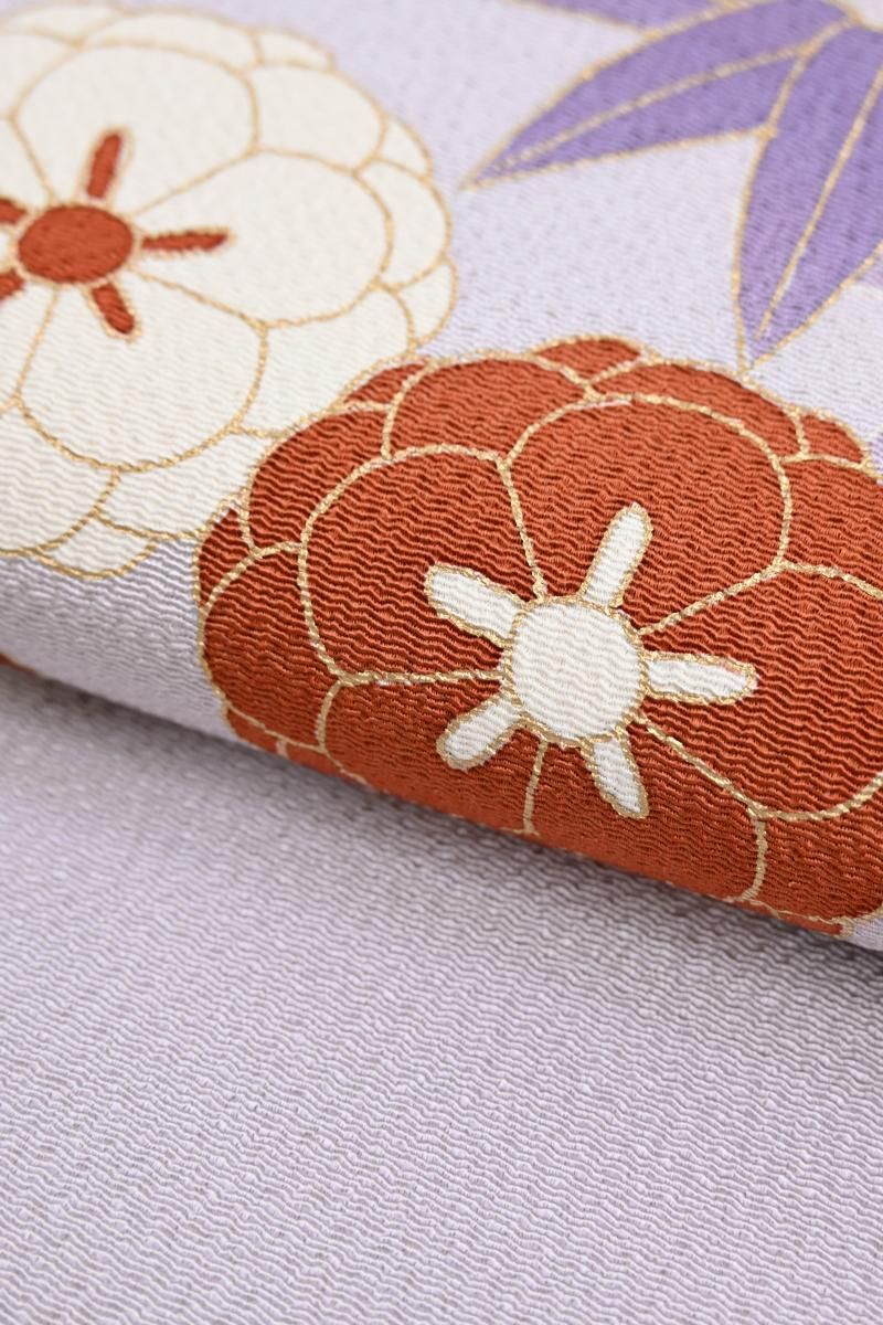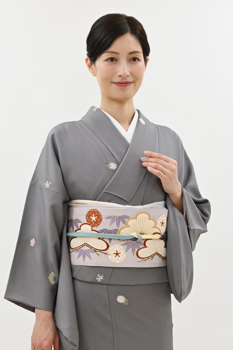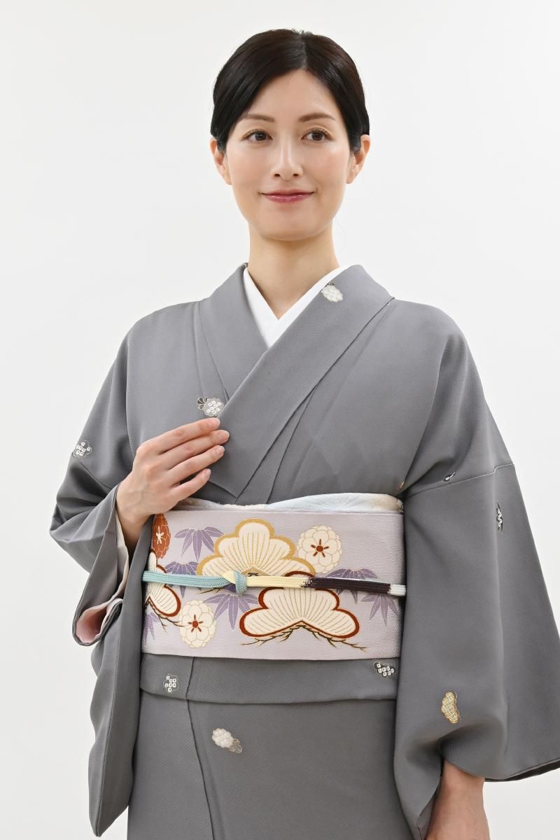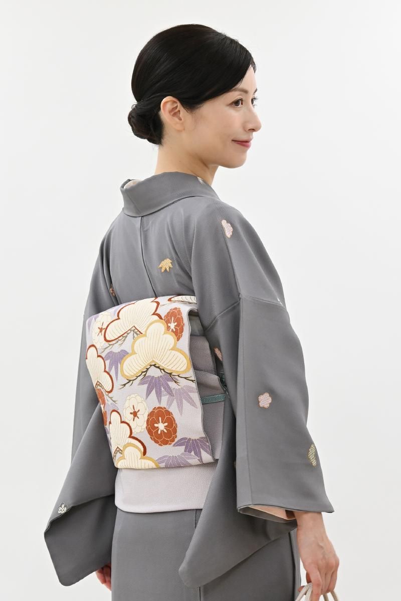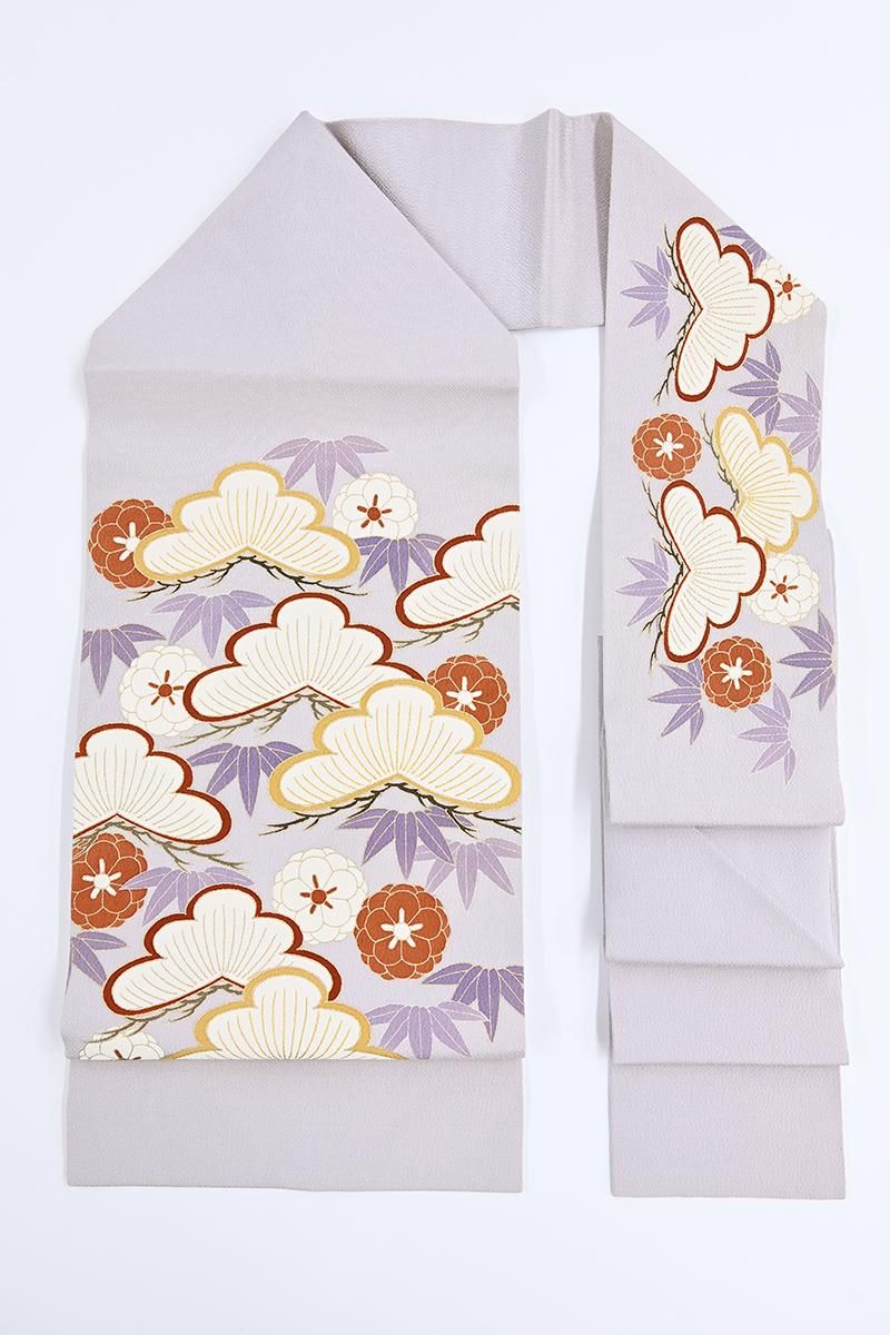 牡丹鼠色が近いでしょうか、灰みの強い薄紫色の縮緬地に、ごくおおらかな松竹梅の図を描いた名古屋帯です。ふっくらとしぼを帯びた地風に、縁起の良い松竹梅が華やかに映えるお品、装いにお正月らしい晴れやかな祝意を添えて引き立ててくれることと思います。紬や小紋などに合わせて、心弾む装いをいかがでしょうか。