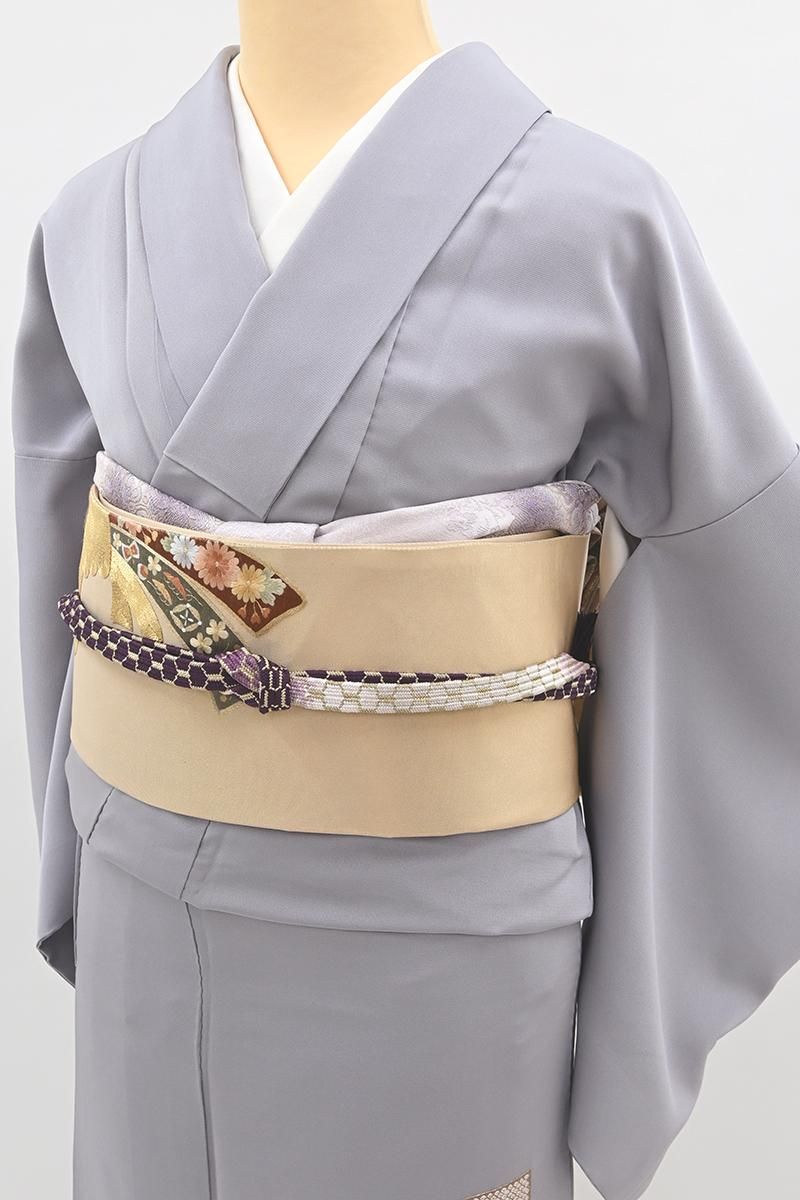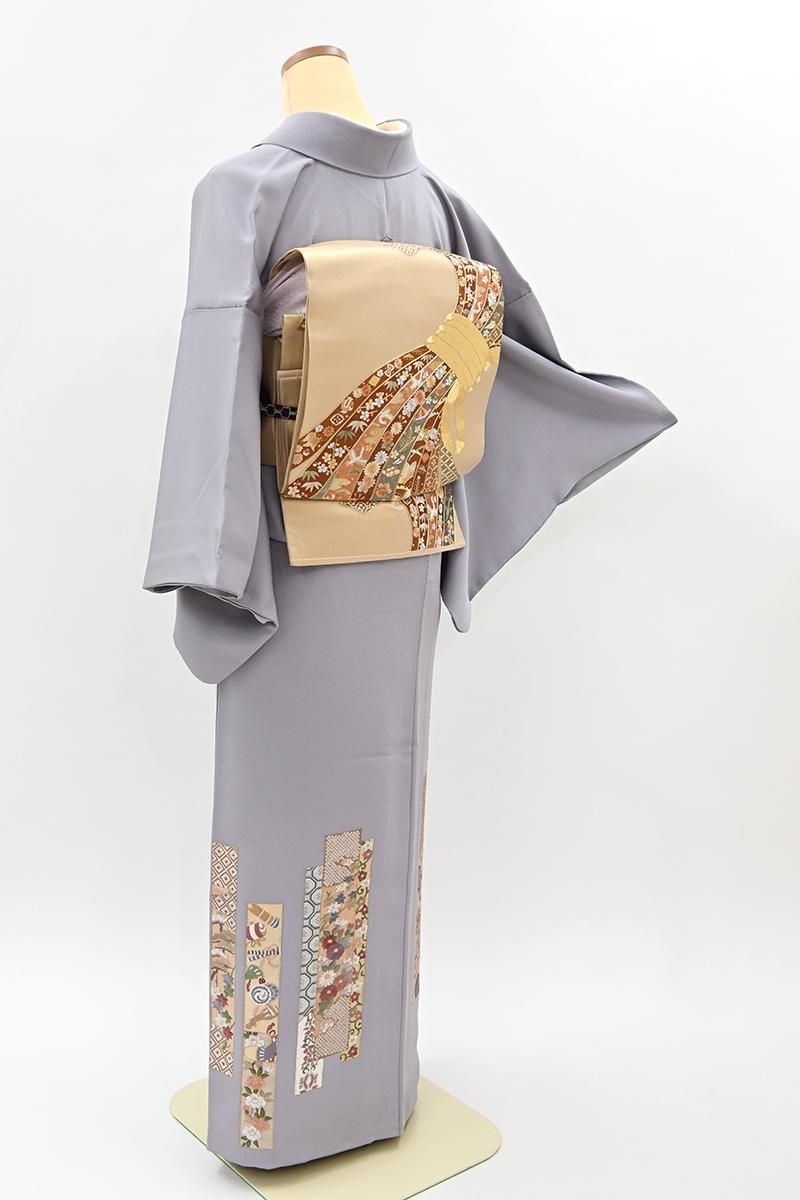 霞色が近いでしょうか、紫みの薄グレーの地に、精緻な刺繍で短冊に様々な吉祥文をあしらった色留袖です。程よく落ち着いたお色目に、優美な色遣いで表現された意匠がしっとりと上品な趣のお品、絹糸の豊かな光沢を生かしたふっくらとした繡いには贅沢な華があり、手仕事ならではの重厚な存在感を生み出してくれますね。晴れやかで格調高い雰囲気のこちらは色留袖のかたちですが、繍の一ッ紋付きですので、訪問着感覚で着用の機会も幅広くお召し頂けることと思います。この機会にいかがでしょうか。