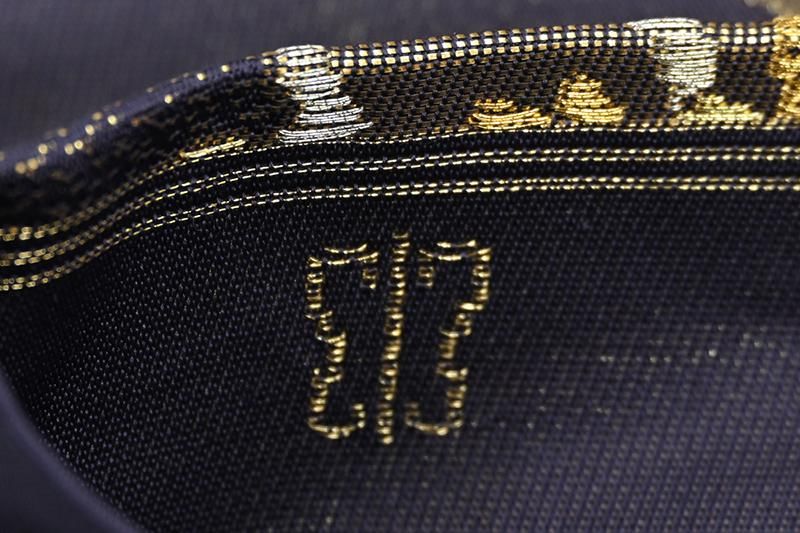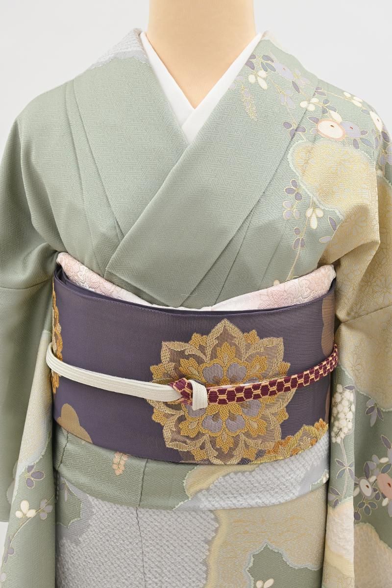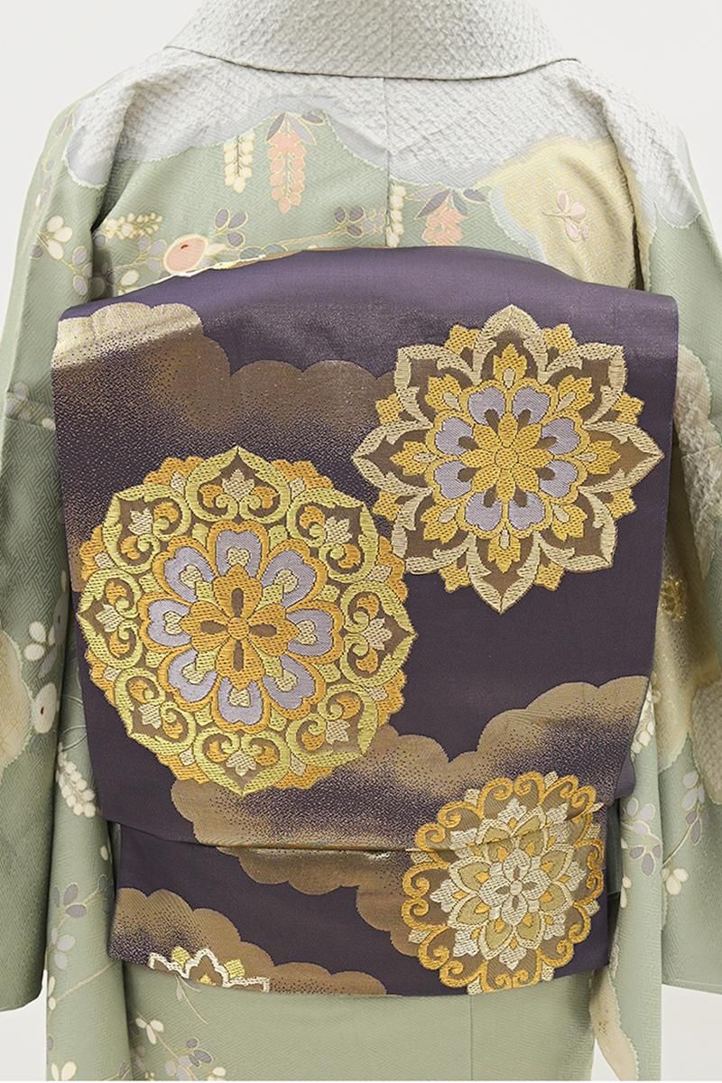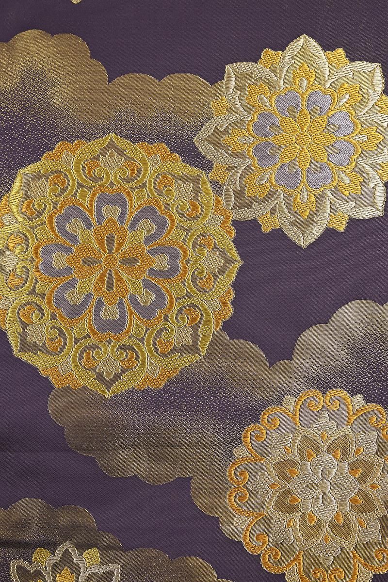 深紫色が近いでしょうか、ごく細やかな金糸を通した深い紫色の地に、雲に華文を織りだした本袋帯です。こちらは重厚感のあるモチーフを金糸を基調とした色遣いで表現した気品あふれるお品、和のお席はもちろん、ホテルなどの洋の間でも晴れやかに映えそうですね。どのようなお席にも安心してお使いいただける格調、そして緻密な織りが創るしなやかな締め心地はやはり西陣を代表する老舗・川島織物さんならではのもの。お太鼓のかたちの美しさでも定評がありますね。季節を選ばない帯ですので折々のお呼ばれに重宝頂けることと思います。ぜひこの機会にお手に取ってご覧くださいませ。