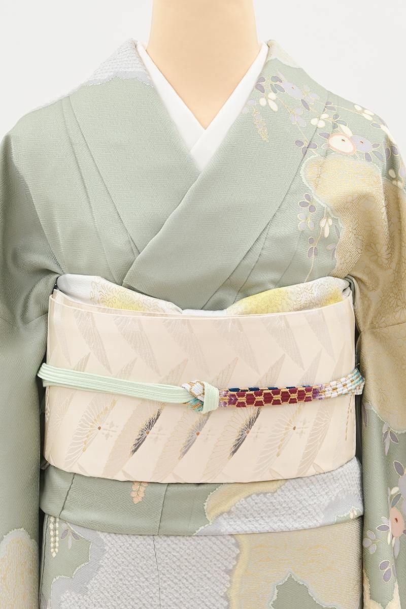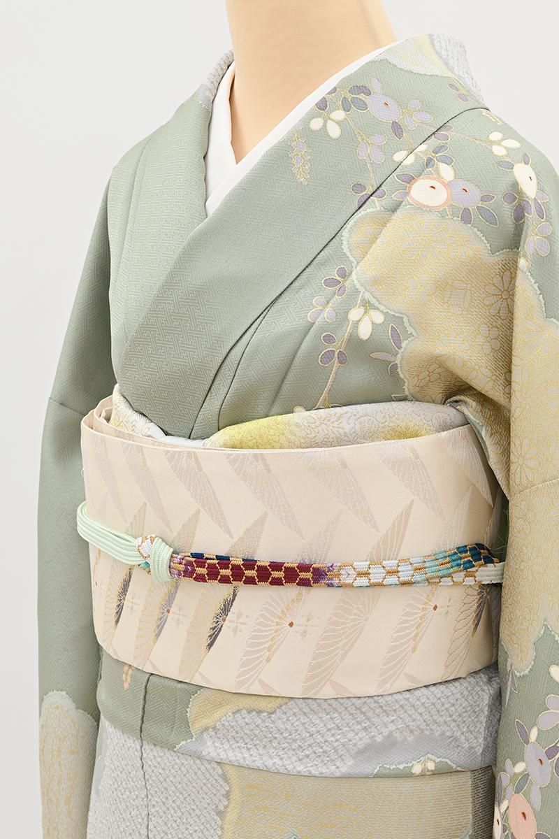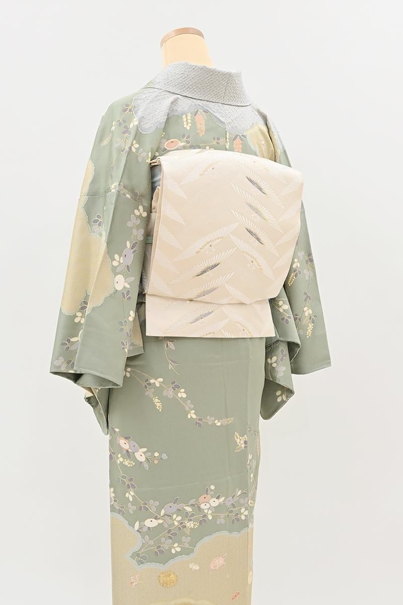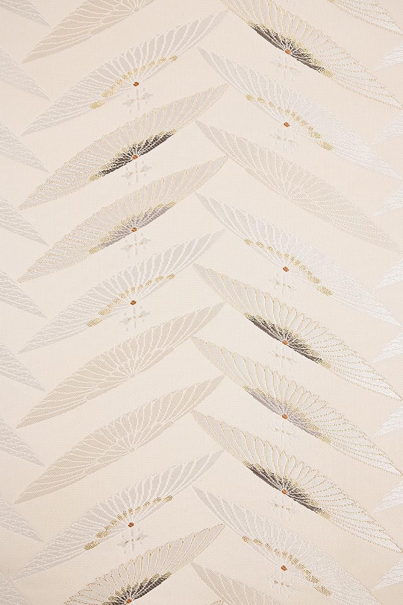 こちらはしなやかな地風に菊の花でしょうか、花の図が整然と並び、大人の気品溢れるお品、シンプルな色柄ですので合わせる着物の色柄も幅広く、すっきりとした装いで引き締めてくれることと思います。ドレッシーな小紋や色無地、付下げなどに合わせてエレガントな装いをお楽しみくださいませ。