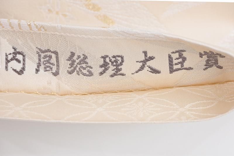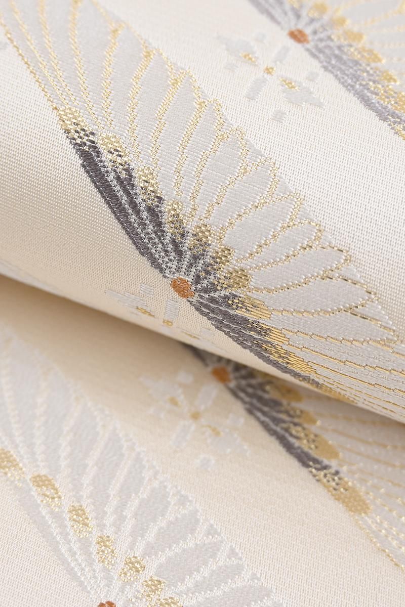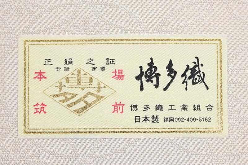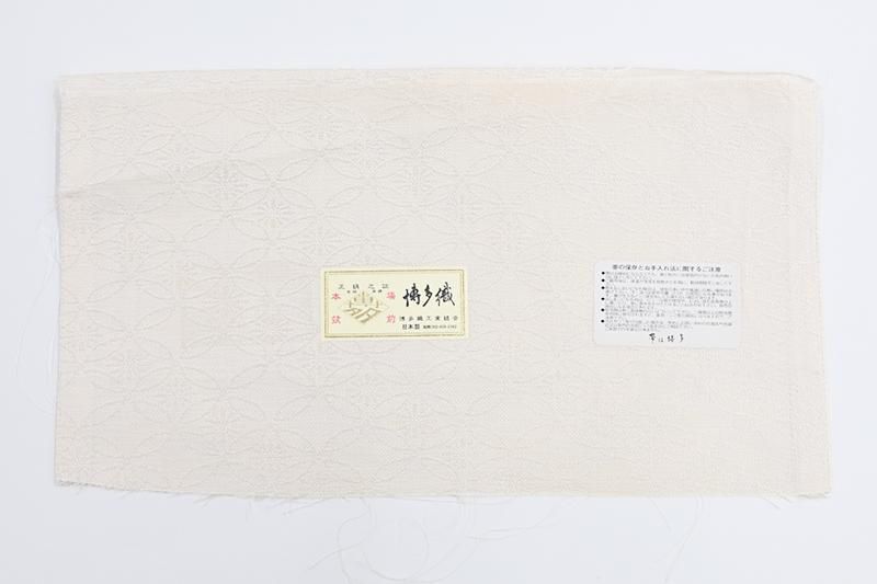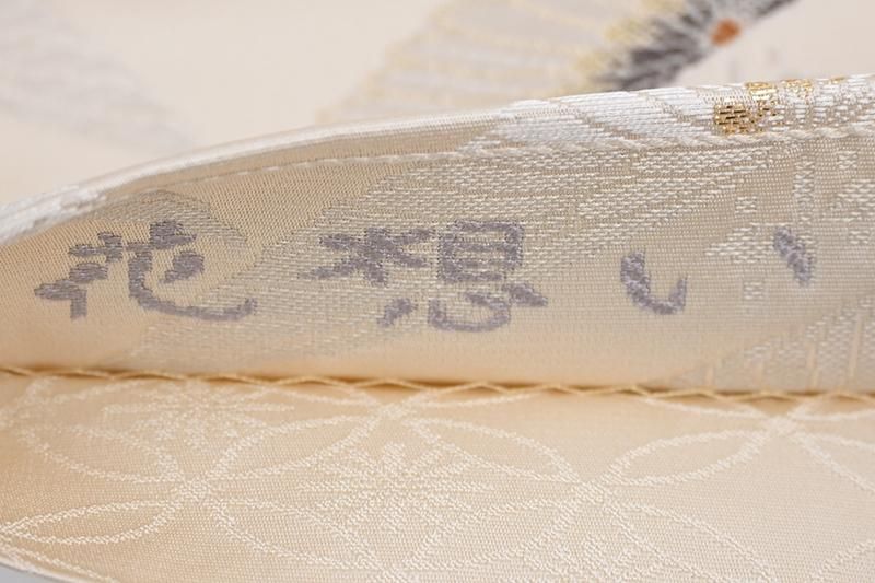 生成色が近いでしょうか、白色系の地に、「花想い」と銘された本場筑前博多織の袋帯です。
