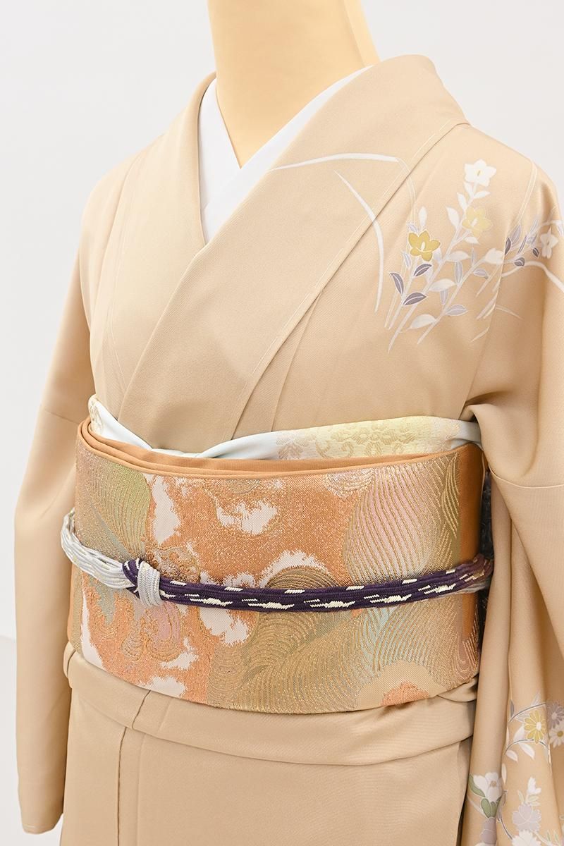 こちらは金茶色が近いでしょうか、わずかに灰みを含んだ橙色系を背景に、華麗な煌めきを見せる金銀糸をふんだんに用いたお品、繊細な織によって渦を巻き、激しくぶつかり合う波の様子が躍動感豊かに表現されていますね。モチーフは荒ぶる自然の姿でありながらも、あくまでも優雅に表現された龍村さんならではの景色が、フォーマルなお席や晴れやかなパーティなどの装いを重厚に引き立ててくれることと思います。この機会にぜひお手元にてご覧くださいませ。