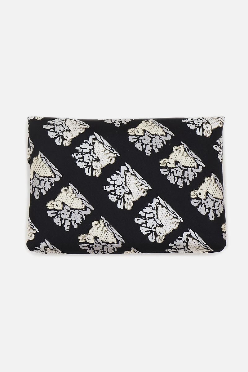 上質な帯地から仕立てた数寄屋袋です。こちらはこっくりと深い黒色の地に白とグレーの濃淡の糸で愛らしい花兎文が織り出されたお品。モチーフを象る金糸の煌めきも穏やかで、ベーシックな名物裂文らしい気品が感じられますね。お太鼓の中にすっと入れられますので和装の場合にはとりわけ重宝なものです。この機会にぜひお手に取ってご覧くださいませ。