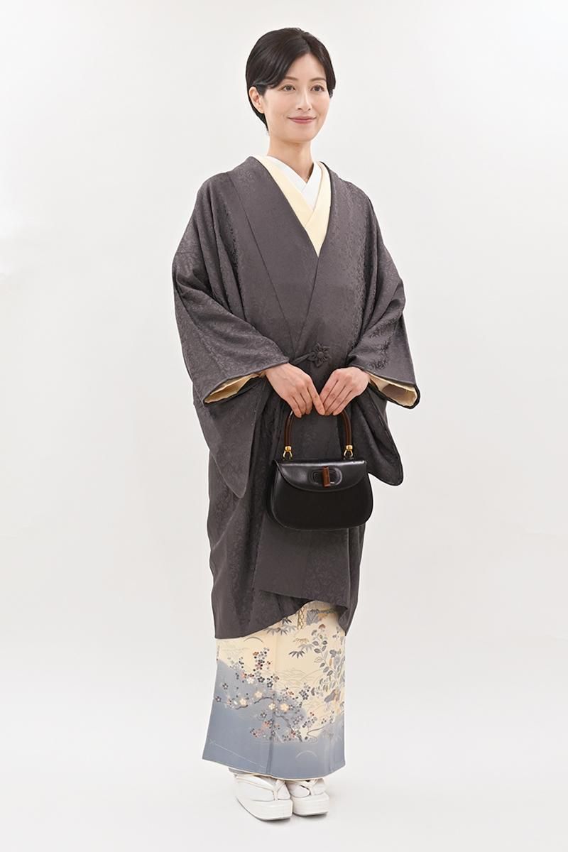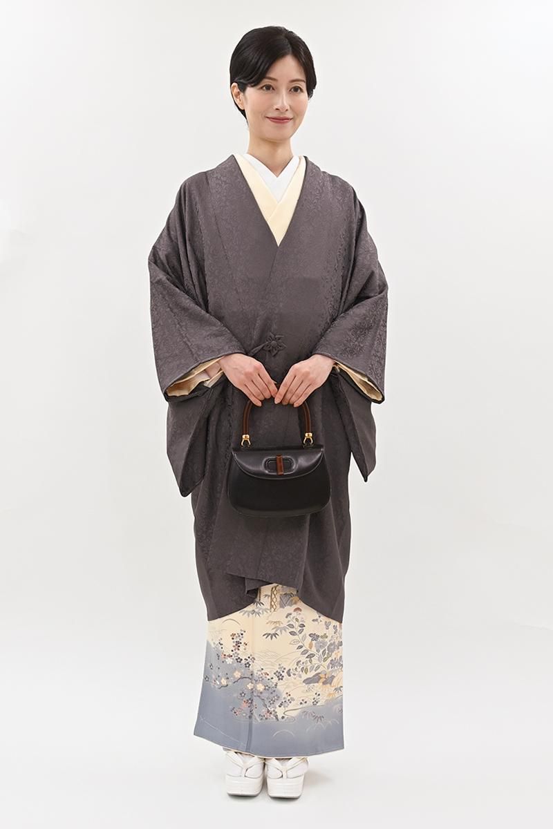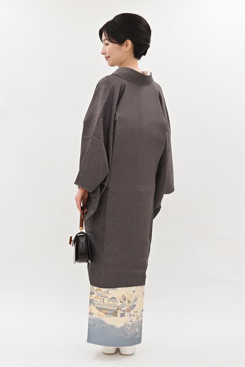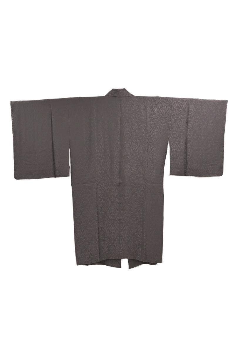 紅消鼠色が近いでしょうか、僅かに紫みを含んだ深いグレーの地に、光の加減で装飾文の地紋の浮かぶ道中着です。こちらは柔らかな光沢を帯びた地風が気品豊かなお品、シックでモダンな印象の無地の一枚は様々な色柄の着物に合わせやすく、エレガントな表情をお楽しみいただけることと思います。防寒や塵除けとしてこれからの季節のお出かけに必須のコート。ぜひこの機会にいかがでしょうか。