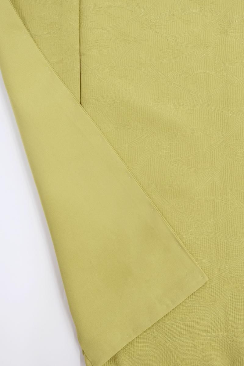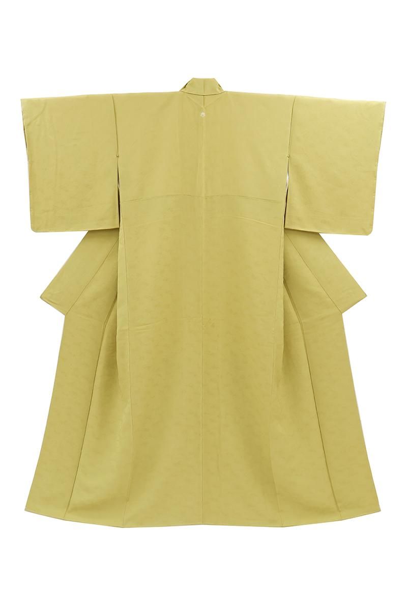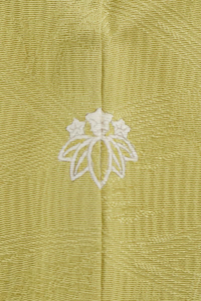 色をぐっと深めた木蘭色が近いでしょうか、緑みを帯びた黄色系の地に、植物の地紋が浮かぶ色無地です。光の角度により浮かび上がる地紋は稲でしょうか、穏やかな光沢を帯びた地風と女性らしい優美な彩りが気品豊かな表情ですね。染の一ッ紋が付いておりますのでお茶席などの改まった場面にも安心してお召しいただけることと思います。この機会にいかがでしょうか。
