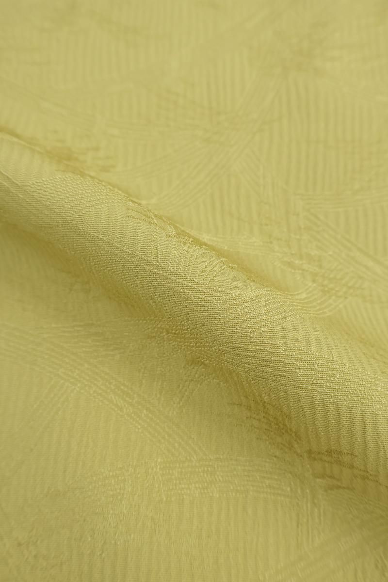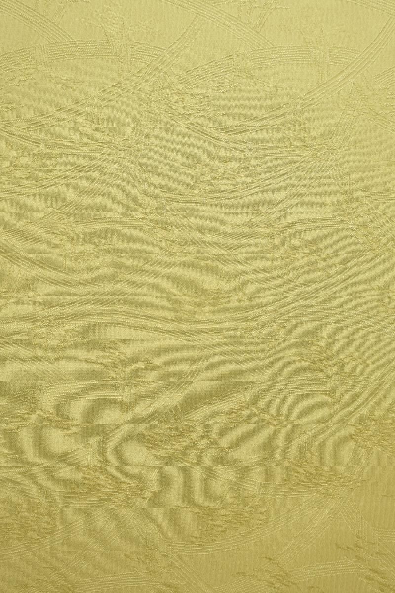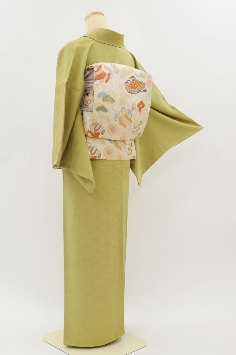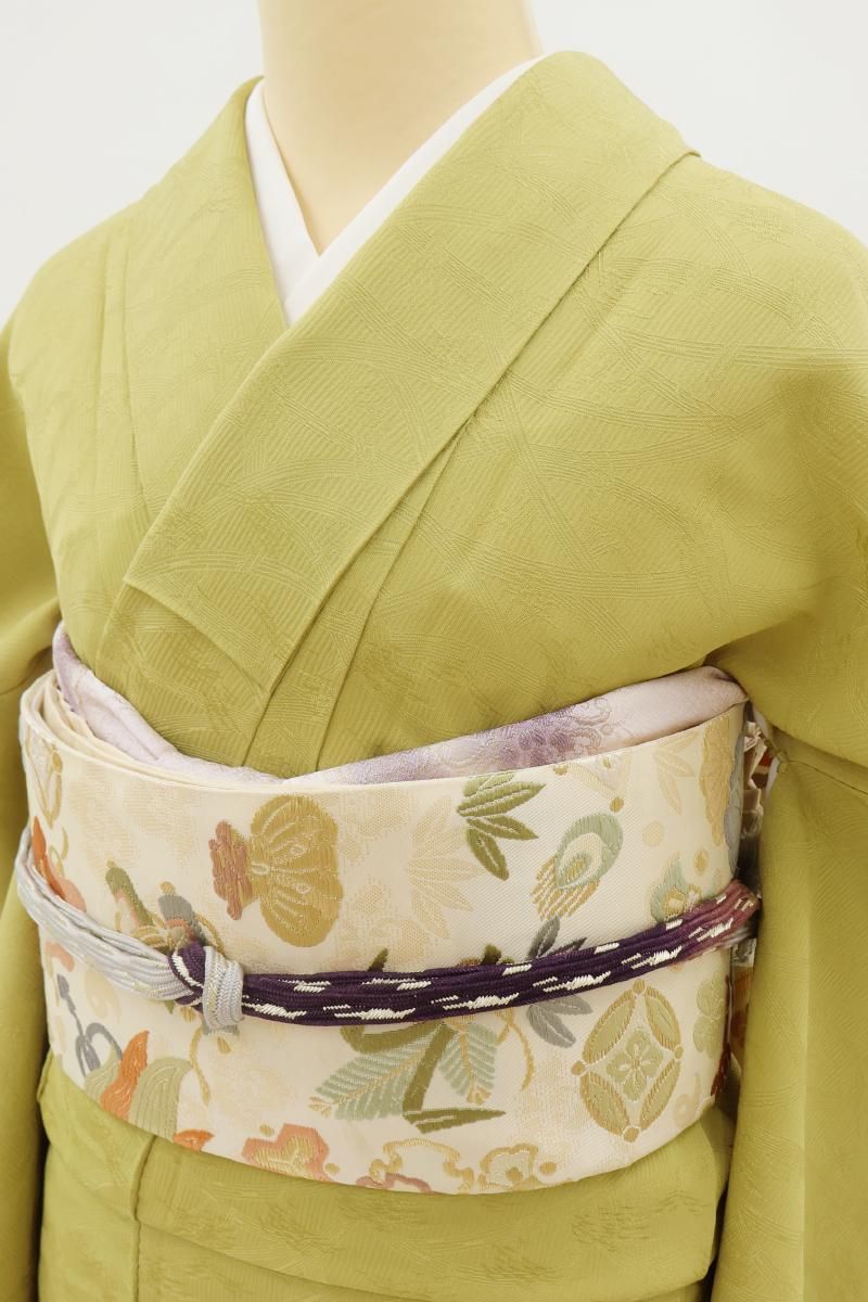 色をぐっと深めた木蘭色が近いでしょうか、緑みを帯びた黄色系の地に、植物の地紋が浮かぶ色無地です。光の角度により浮かび上がる地紋は稲でしょうか、穏やかな光沢を帯びた地風と女性らしい優美な彩りが気品豊かな表情ですね。染の一ッ紋が付いておりますのでお茶席などの改まった場面にも安心してお召しいただけることと思います。この機会にいかがでしょうか。