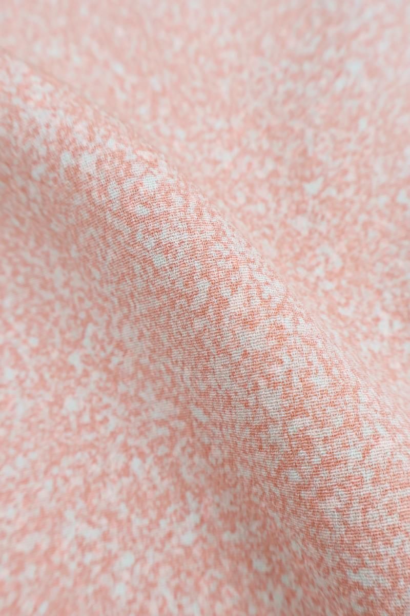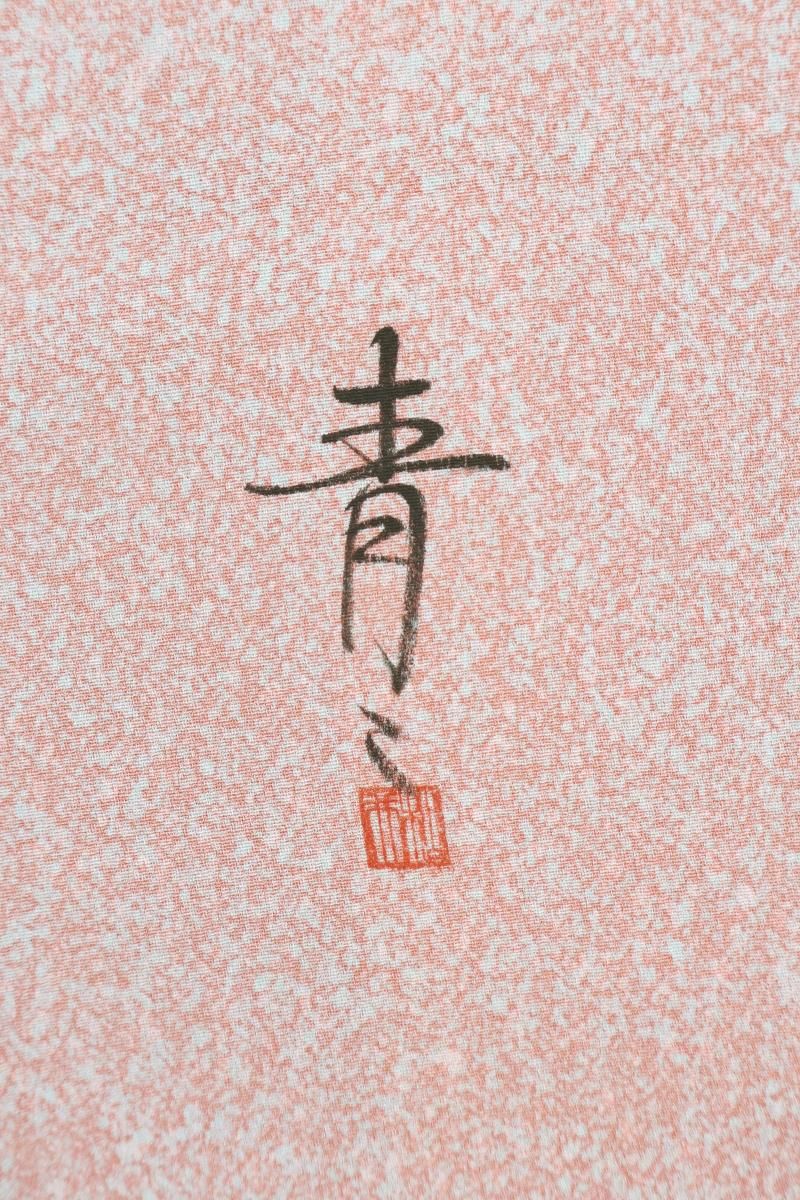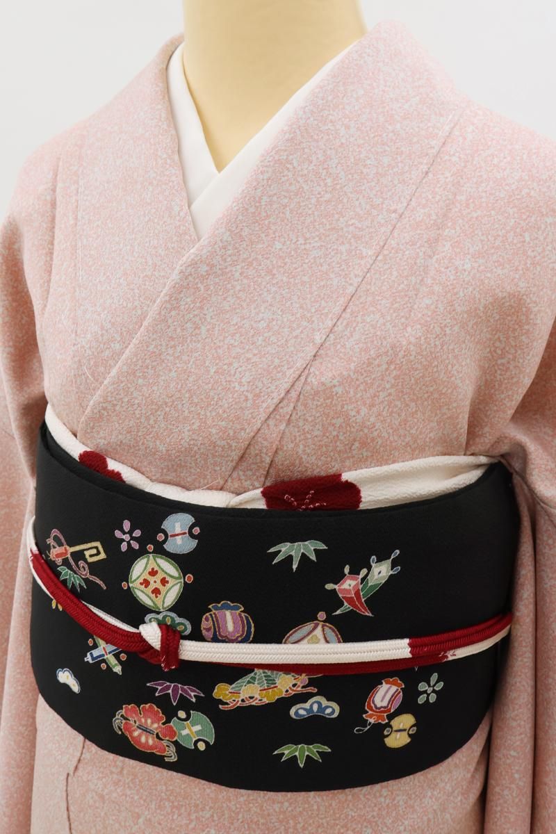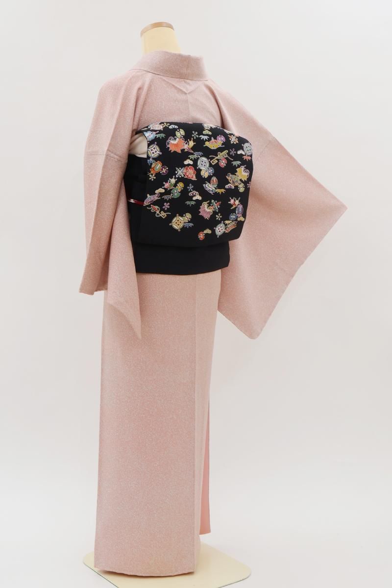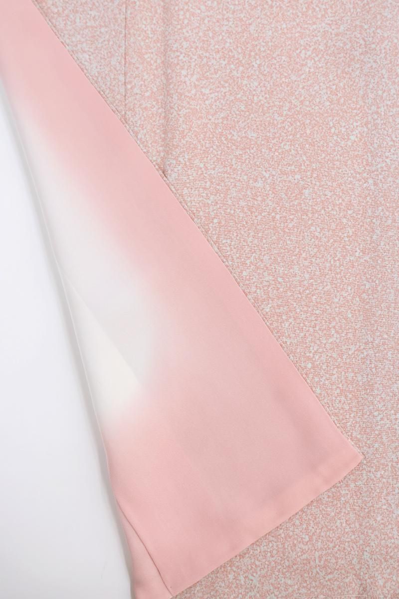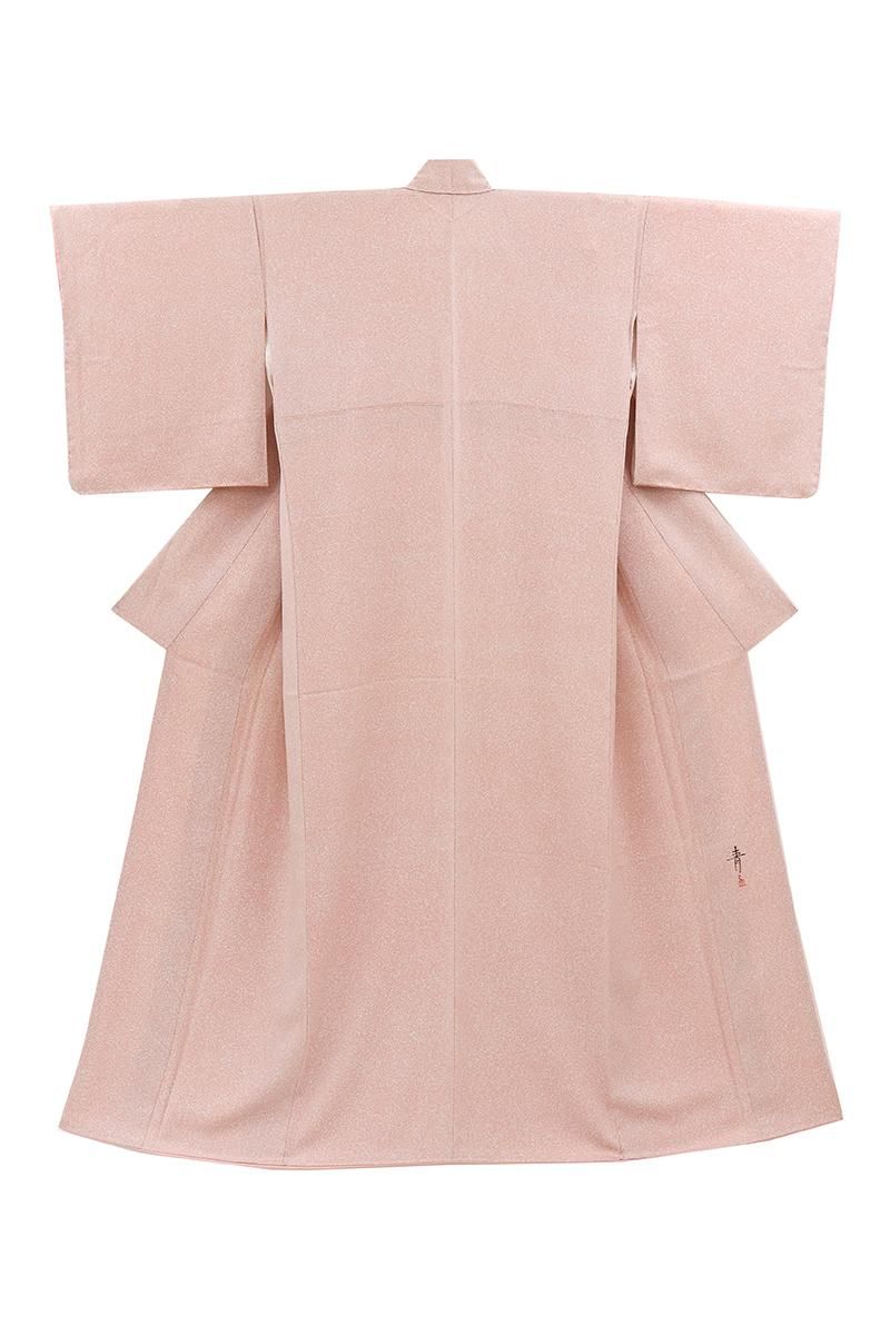全体の印象としては乙女色が近いでしょうか、僅かに黄みを含んだピンクの濃淡や淡い水色で全体に蝋叩き染めを施した小紋です。こちらは華やかな友禅の世界でとりわけ贅沢な作風で知られる松井青々さんの作、色や質感に独特のニュアンスを与える繊細なたたき染めに、この方ならではの洗練が香りますね。柔らかな女性らしいお色柄ではんなりと優美な着姿をお楽しみくださいませ。