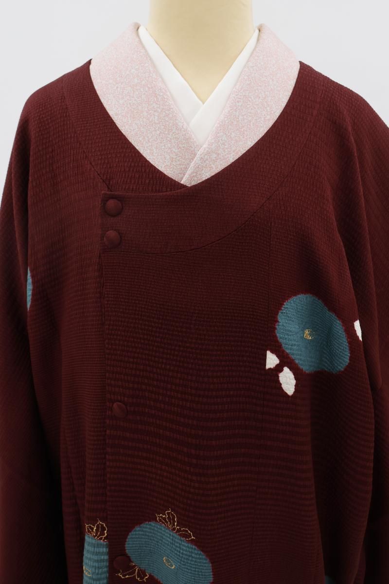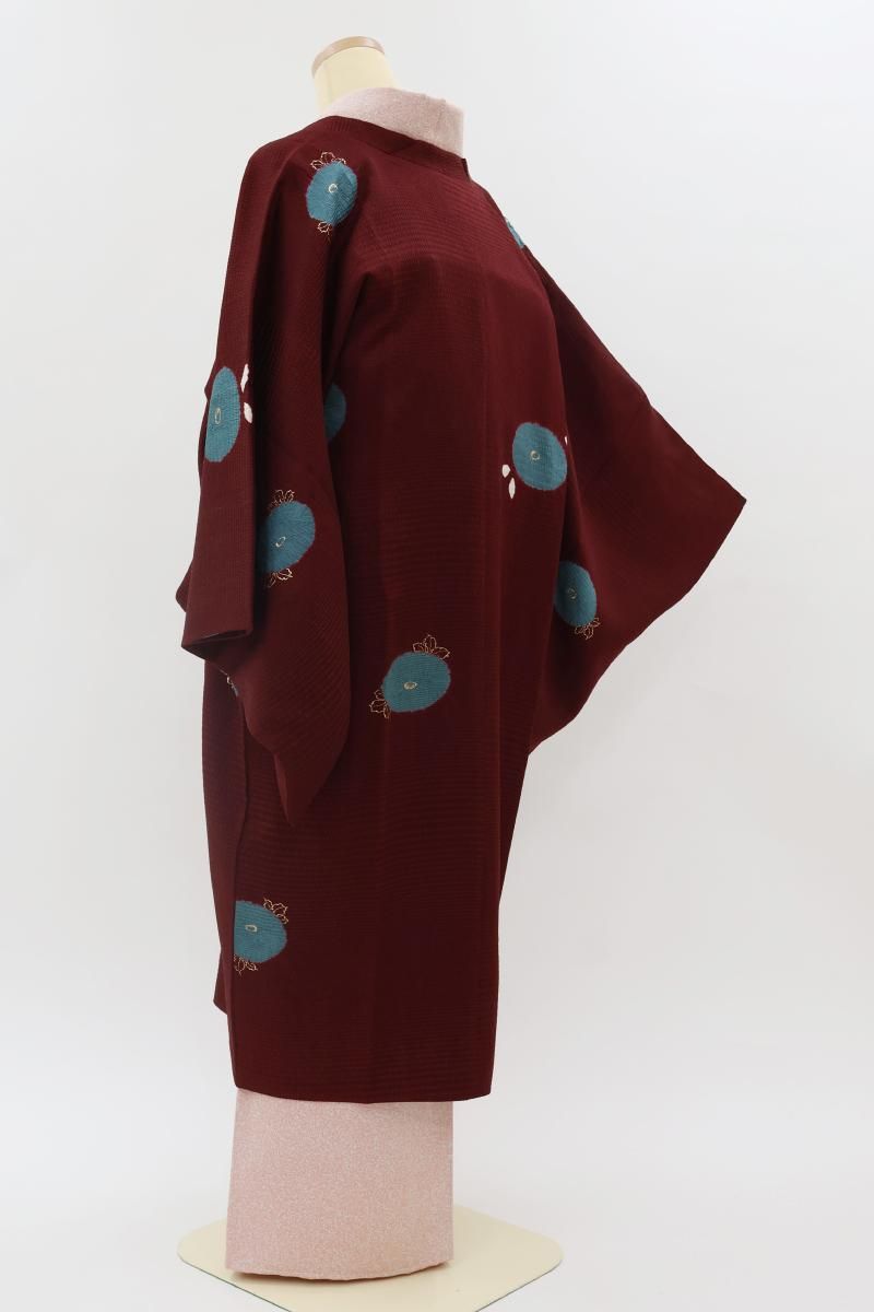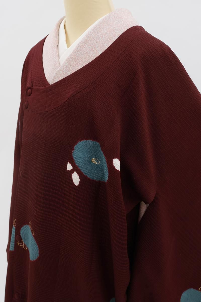 やや色を深めた深蘇芳色が近いでしょうか、ほんのり紫がかったワインレッドの地に、絞り染めで万寿菊をあしらった和装コートです。横段の地紋が浮かぶこっくりとしたお色目に、おおらかに意匠化された文様が愛らしく映えるお品、モダンな色遣いの羽織ものは合わせるお着物も幅広く、しっとりと着姿をまとめ上げてくれますね。お出かけの装いを趣味性ゆたかに彩るコート、この機会にいかがでしょうか。