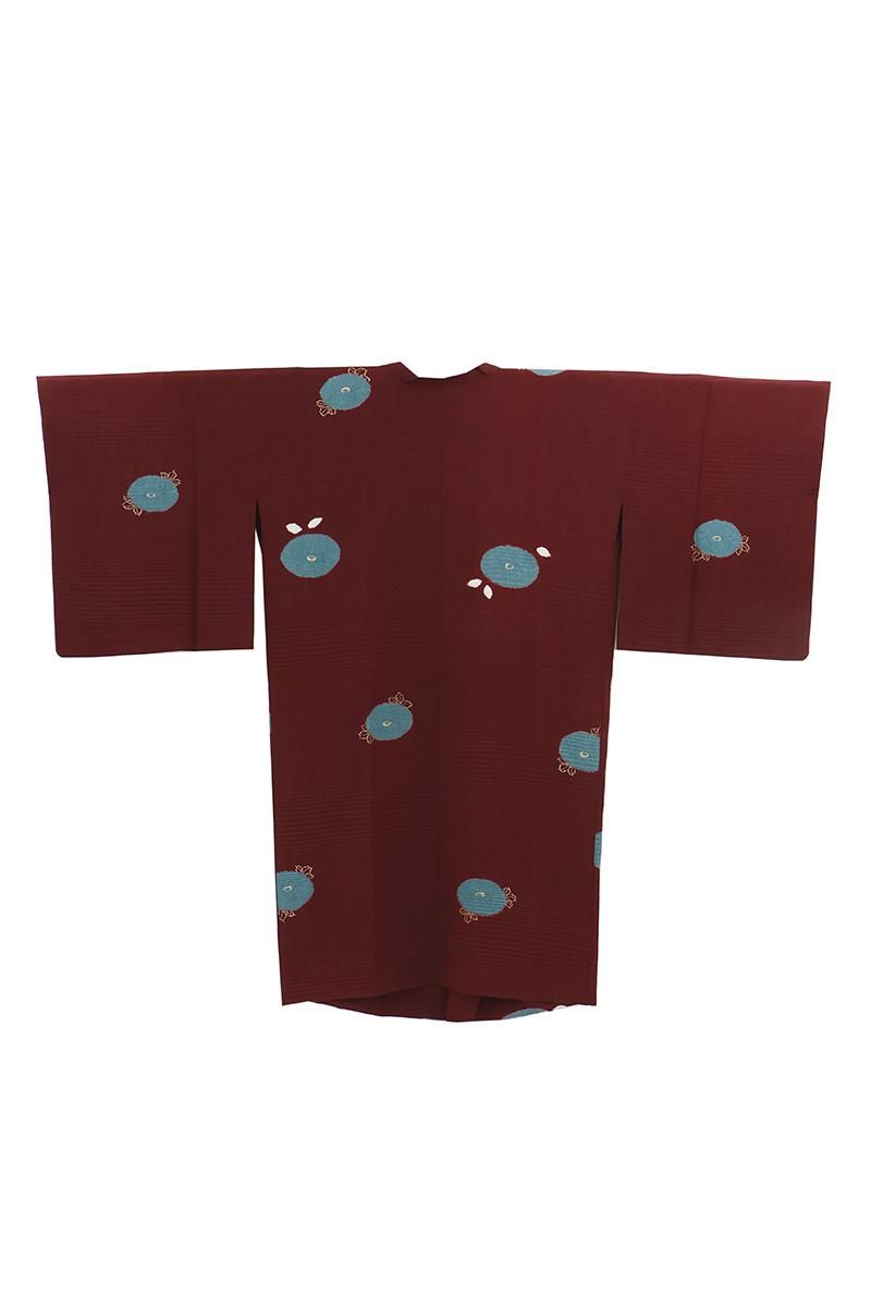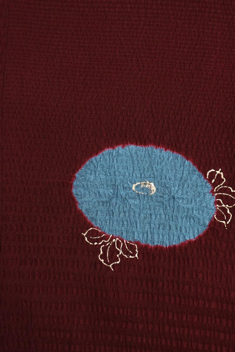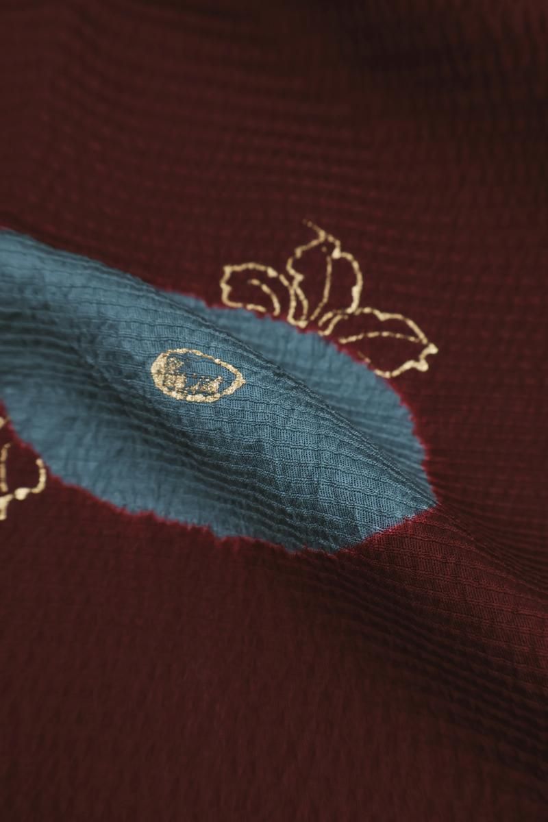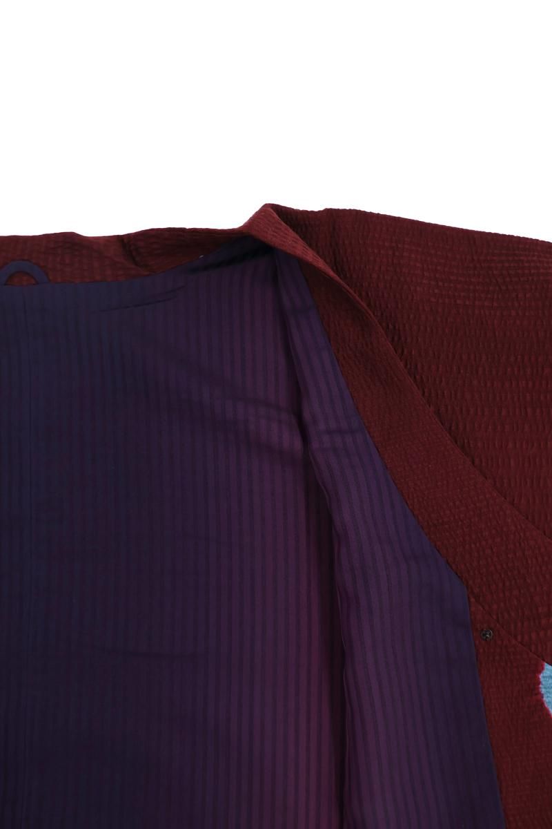 やや色を深めた深蘇芳色が近いでしょうか、ほんのり紫がかったワインレッドの地に、絞り染めで万寿菊をあしらった和装コートです。横段の地紋が浮かぶこっくりとしたお色目に、おおらかに意匠化された文様が愛らしく映えるお品、モダンな色遣いの羽織ものは合わせるお着物も幅広く、しっとりと着姿をまとめ上げてくれますね。お出かけの装いを趣味性ゆたかに彩るコート、この機会にいかがでしょうか。