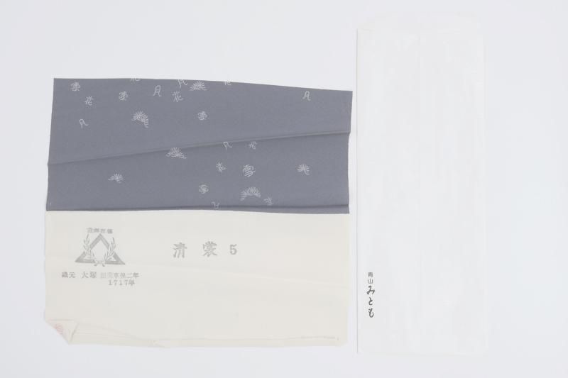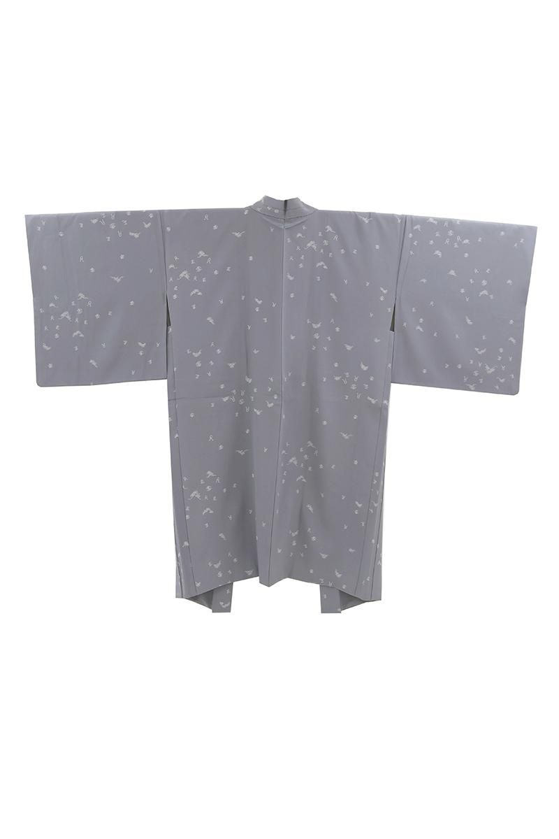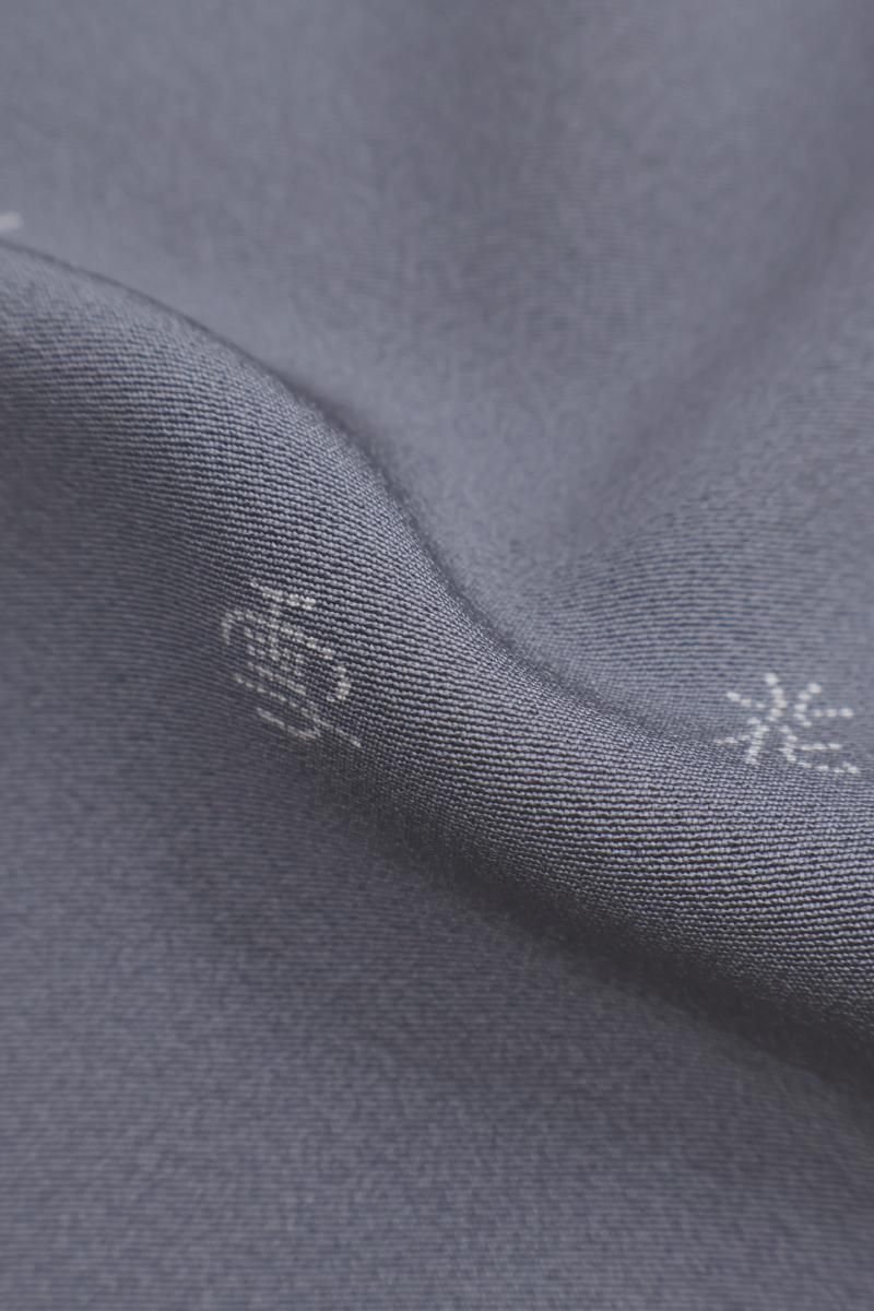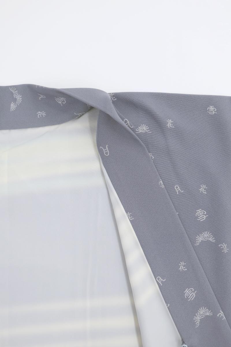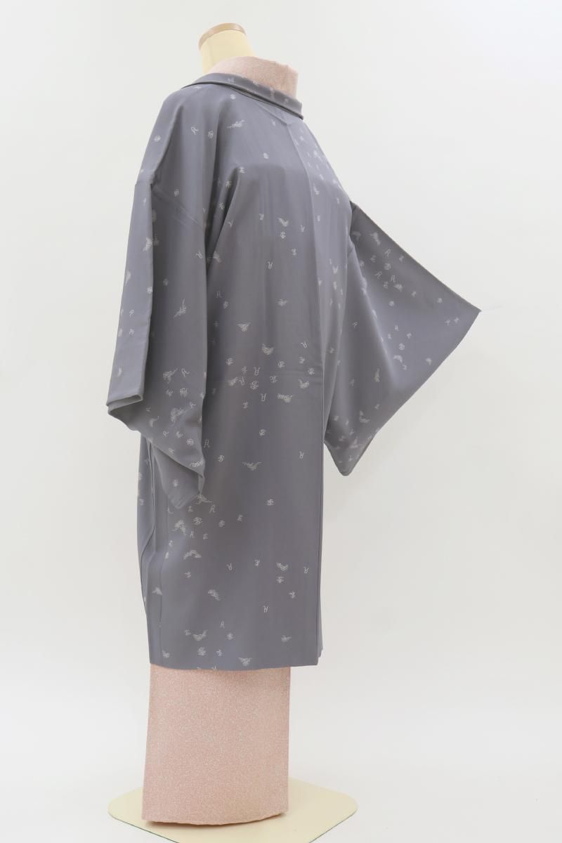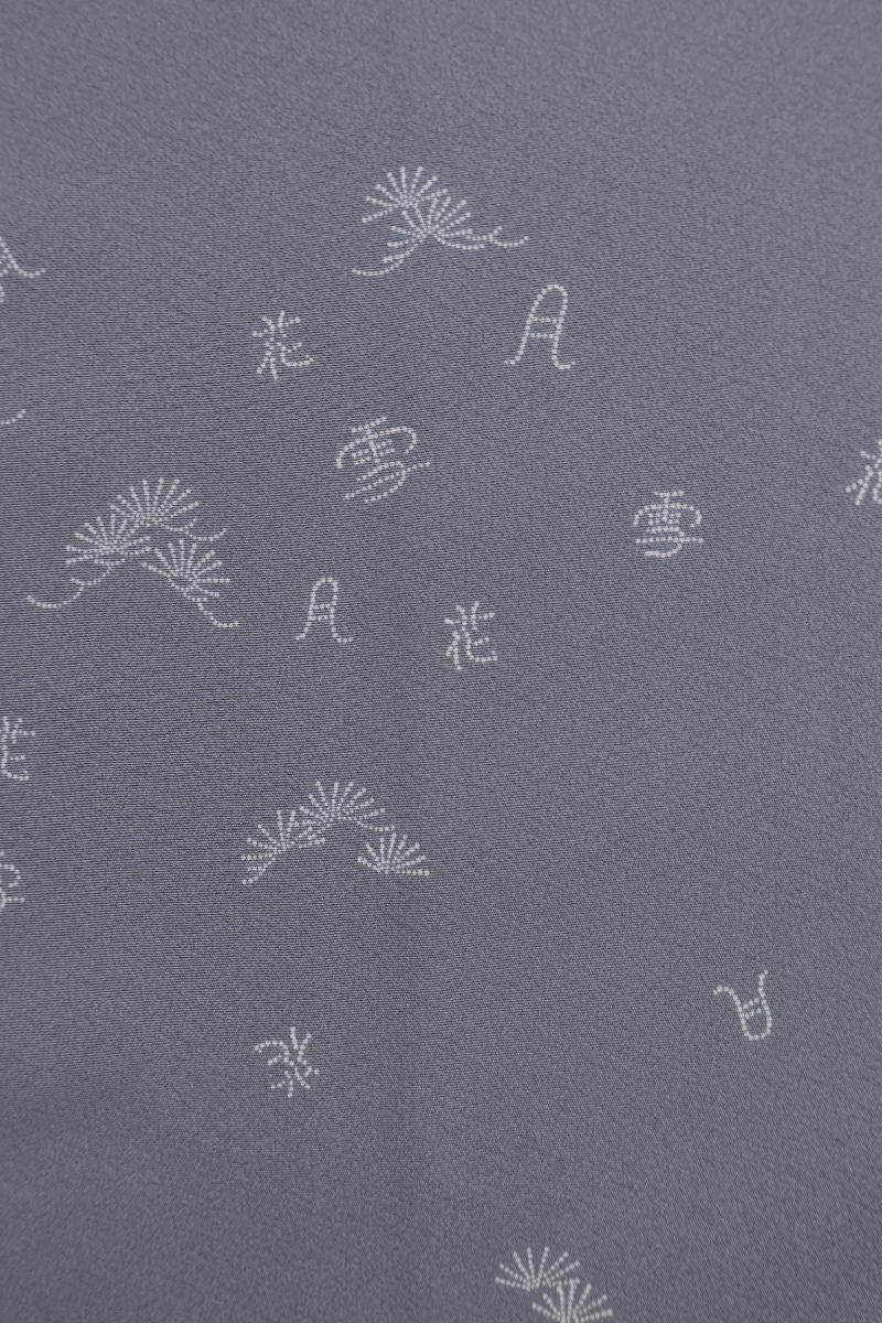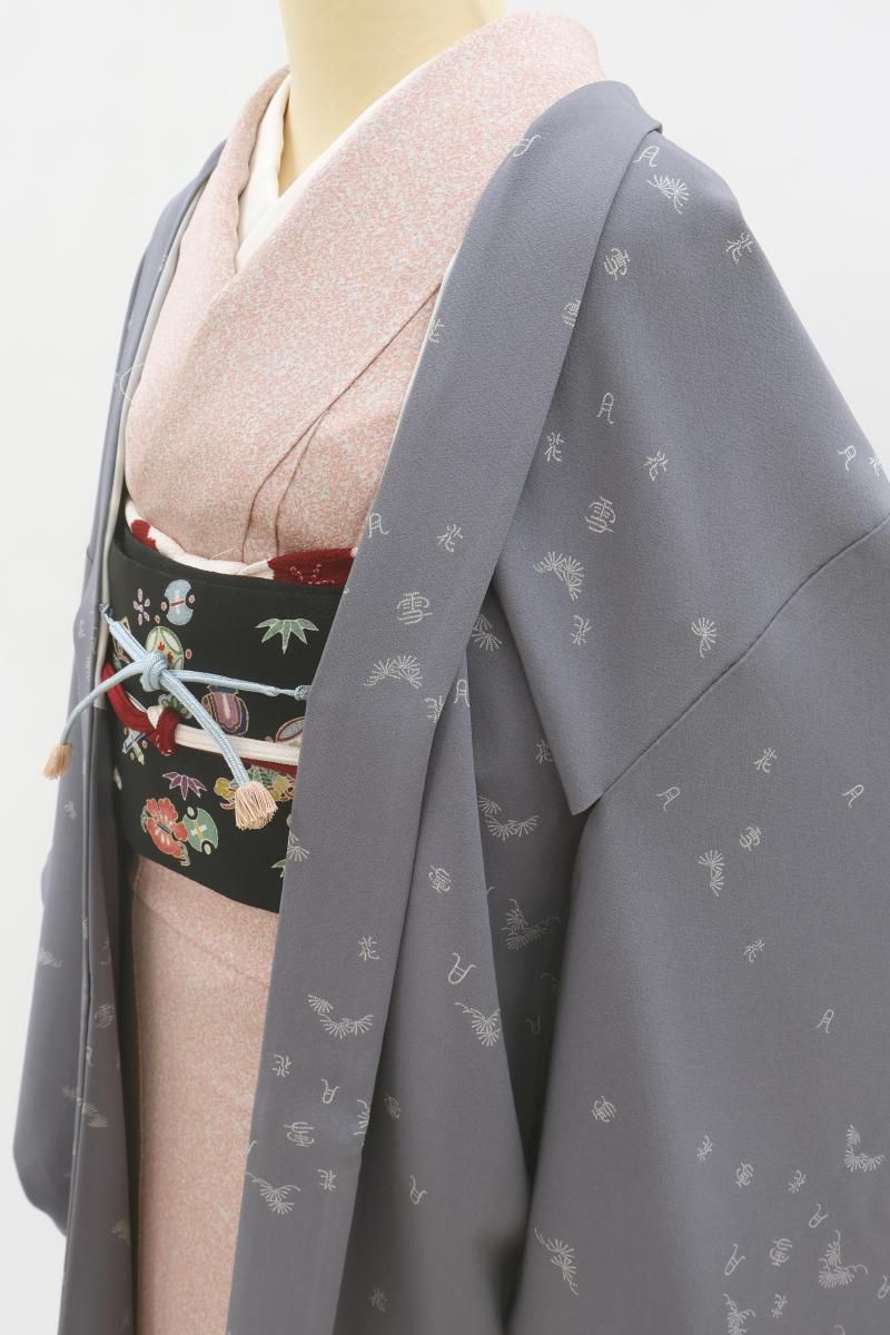彩度を落とした二藍色が近いでしょうか、灰みの青紫色の地に雪月花の文字や松葉を小さな粒で表した羽織です。細かなシボを帯びたさらりとした縮緬地がすっきりと身に添うお品、さりげない遊び心を備えたシンプルな色柄ゆきは幅広い着物に合わせやすく、重宝にお使いいただけそうですね。ちょっとした防寒はもちろん、塵除けとしても必須の羽織もの、紬や小紋などの装いに合わせて、気軽な街歩きにいかがでしょうか。