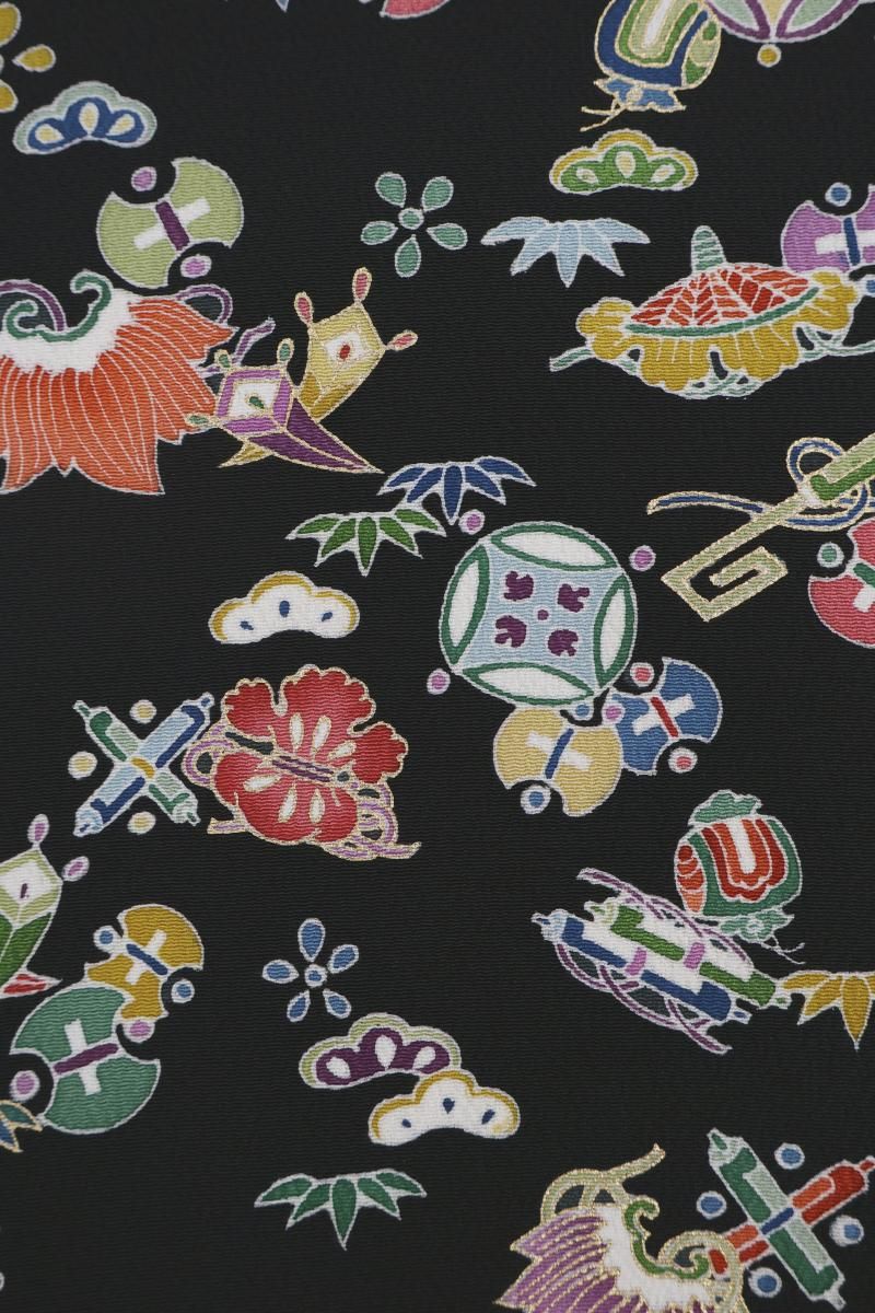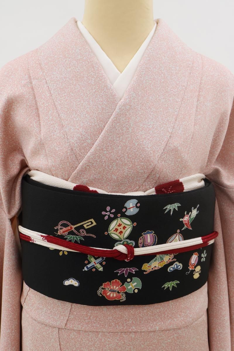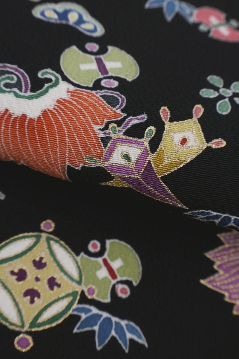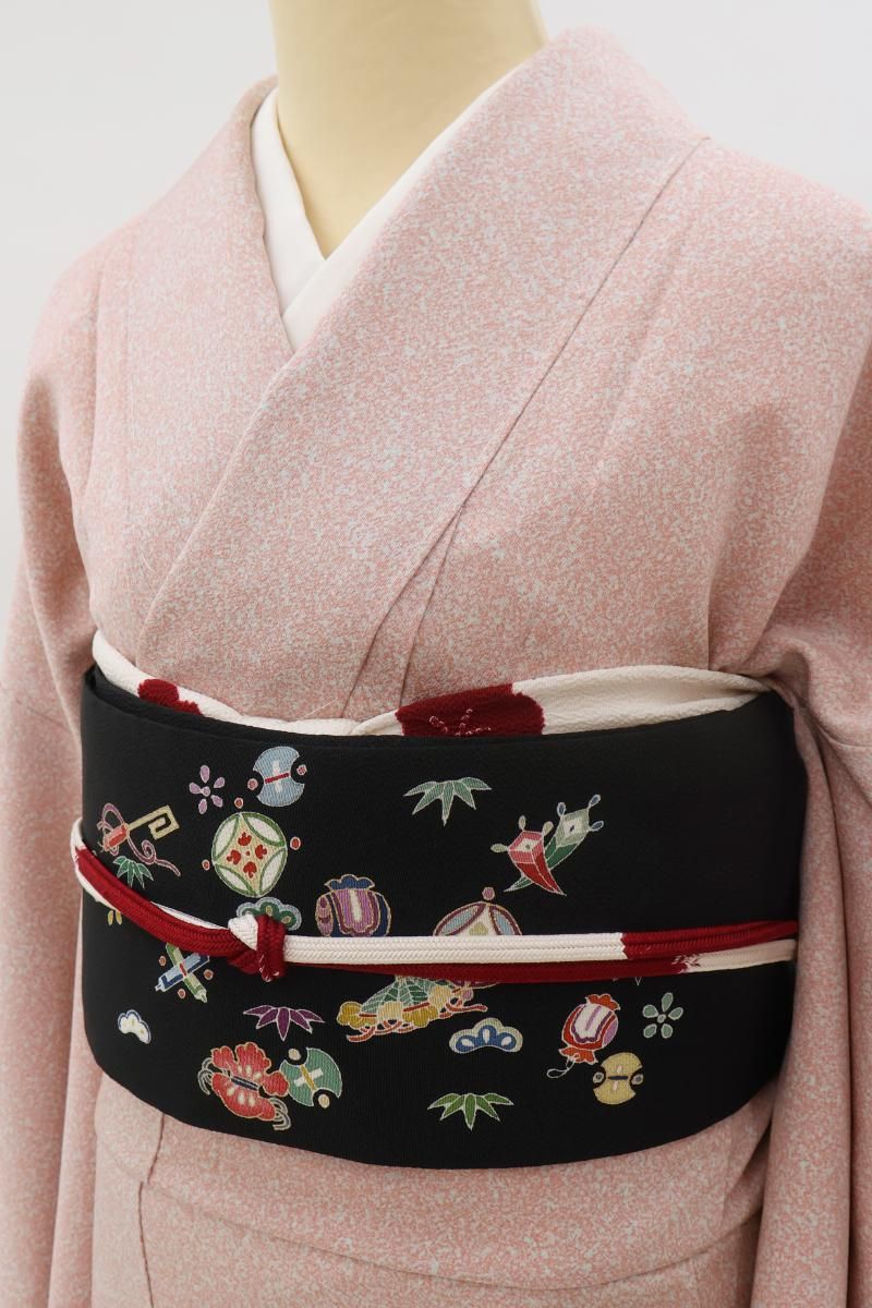 ふっくらとシボを帯びた地風の深いお色目に、金彩の縁取りを添えた鮮やかな彩りが美しく映えるお品、福徳を呼ぶと言われる宝尽くしのおめでたさが、新年のお出かけにもぴったりですね。紬や小紋、紋なしの色無地などに合わせてお友達とのお出かけやちょっとした集まりなどにいかがでしょうか。