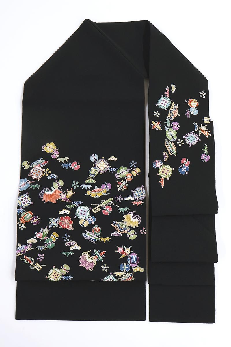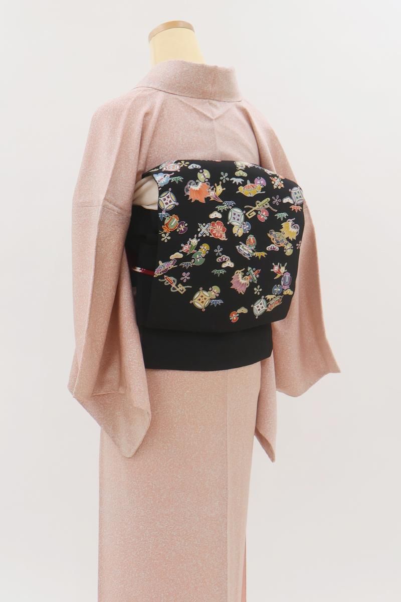 墨色が近いでしょうか、ややまろやかな黒系の地に色とりどりの宝尽くし文を配した名古屋帯です。