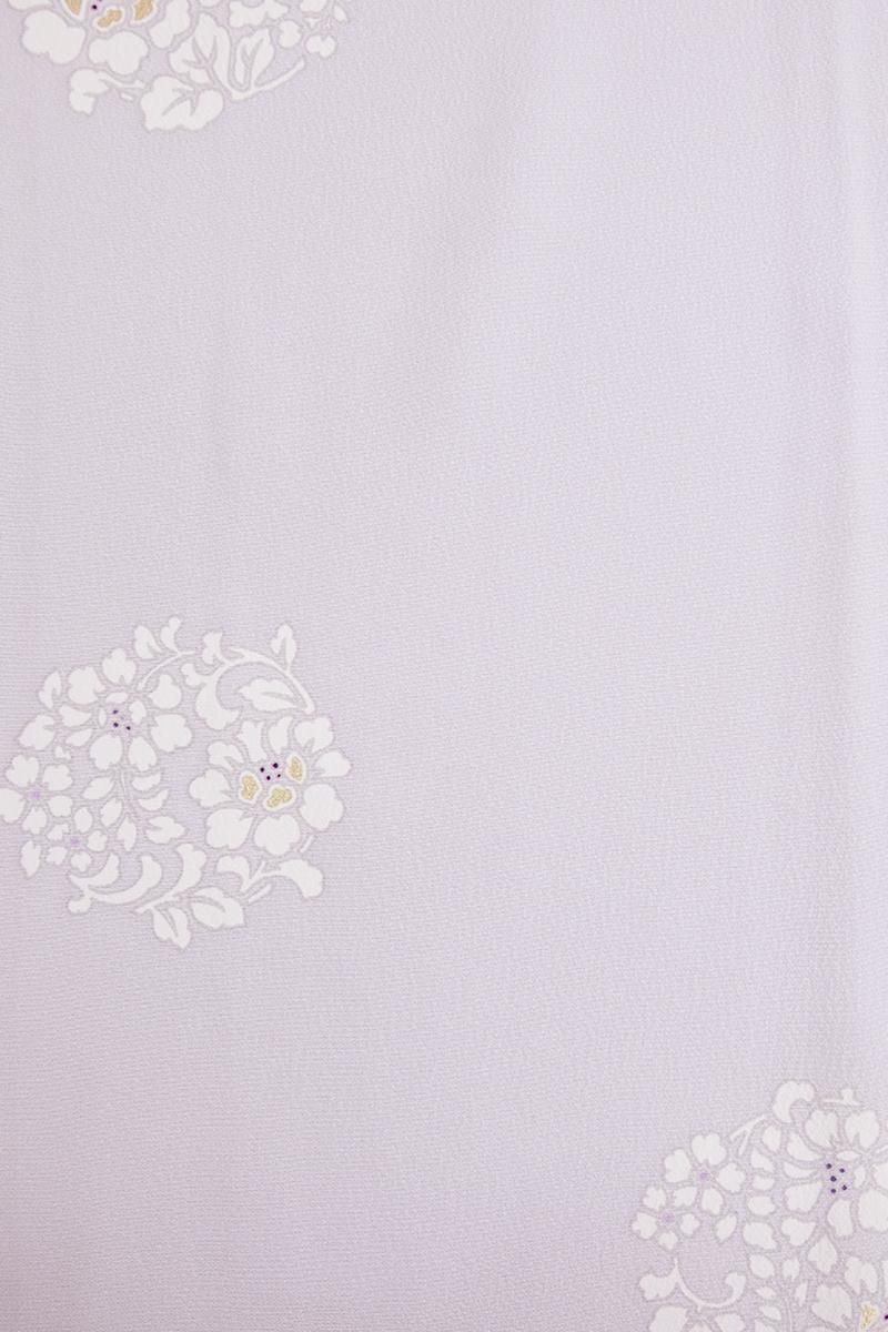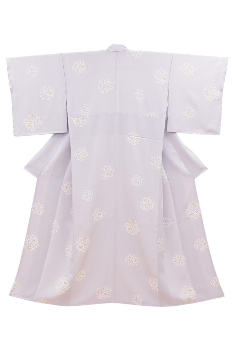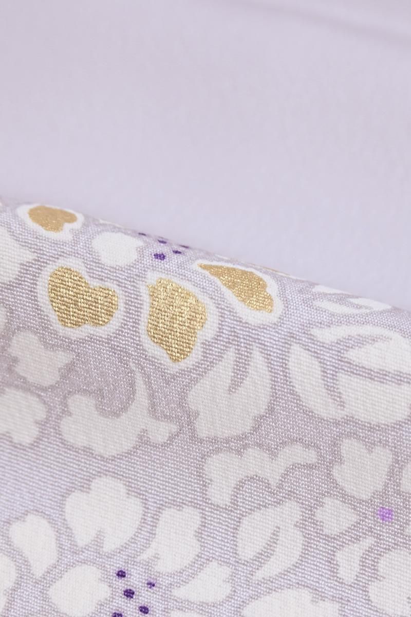 色を深めた白梅鼠色が近いでしょうか、灰みの強い薄紫色の地に、唐花の丸を配した小紋です。