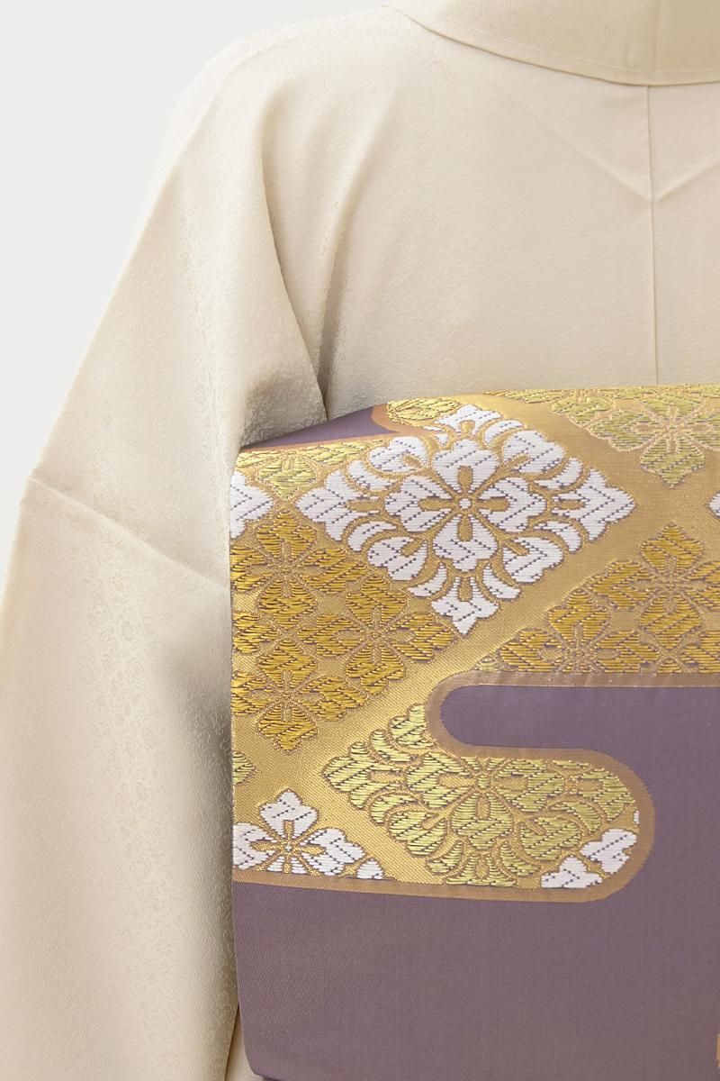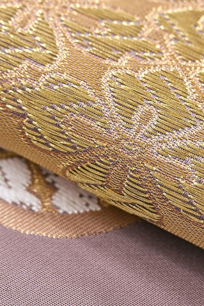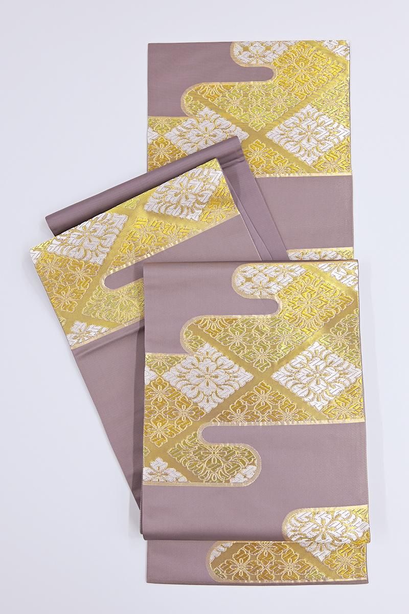 こちらは半色が近いでしょうか、細やかな金糸を通した灰みの紫色の地に、おおらかな霞取りに花菱文を織りだしたお品、金糸をふんだんに用いた重厚感のある景色がフォーマルな装いを格調高く引き立ててくれることと思います。洗練された意匠としなやかな締め心地はやはり川島さんならでは、合わせる着物の幅も広く、どのような場面にも安心してお使いいただけそうですね。この機会にぜひお手元にてご覧くださいませ。