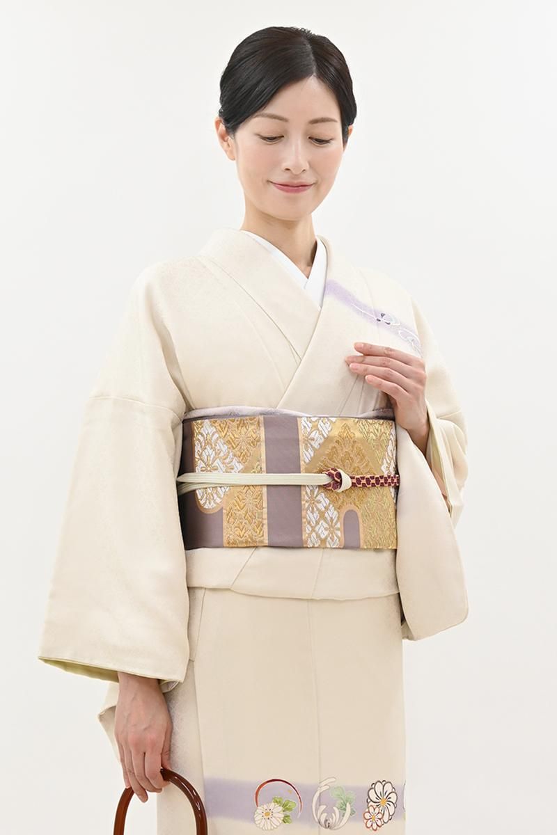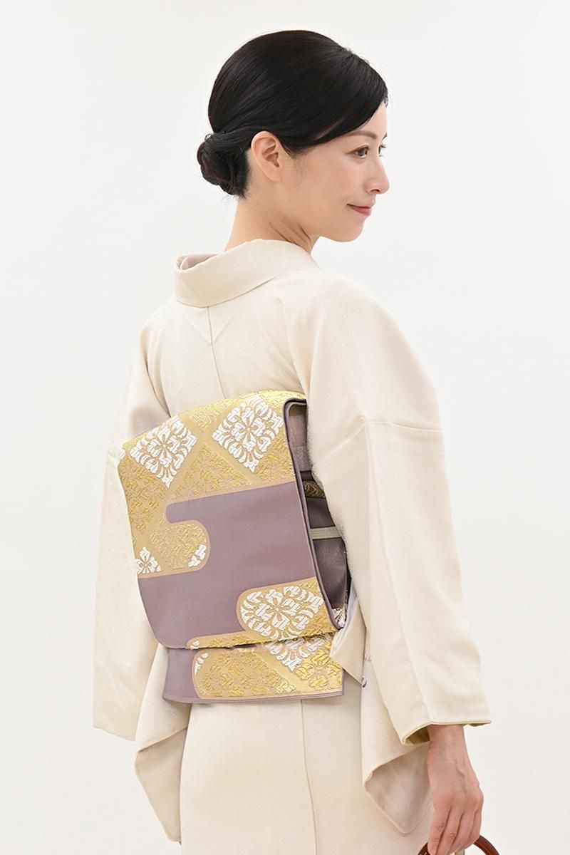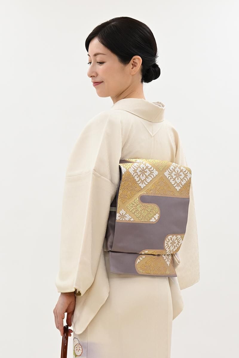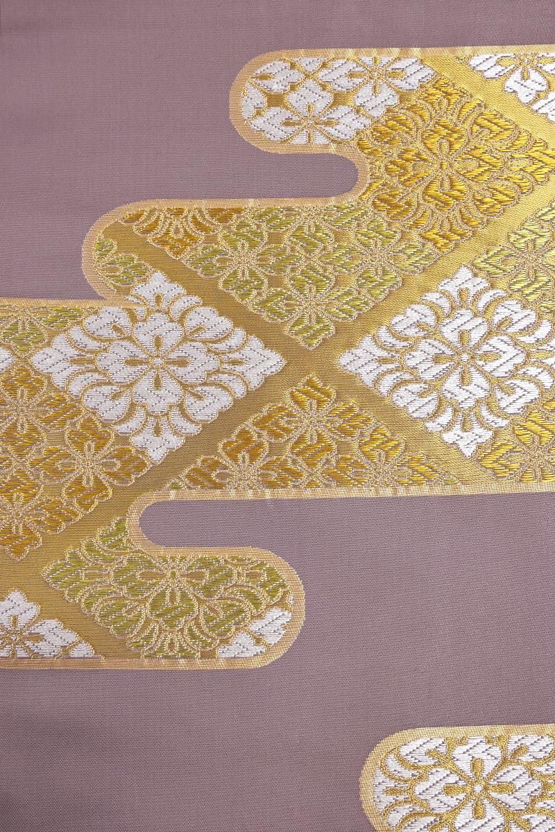 こちらは半色が近いでしょうか、細やかな金糸を通した灰みの紫色の地に、おおらかな霞取りに花菱文を織りだしたお品、金糸をふんだんに用いた重厚感のある景色がフォーマルな装いを格調高く引き立ててくれることと思います。洗練された意匠としなやかな締め心地はやはり川島さんならでは、合わせる着物の幅も広く、どのような場面にも安心してお使いいただけそうですね。この機会にぜひお手元にてご覧くださいませ。