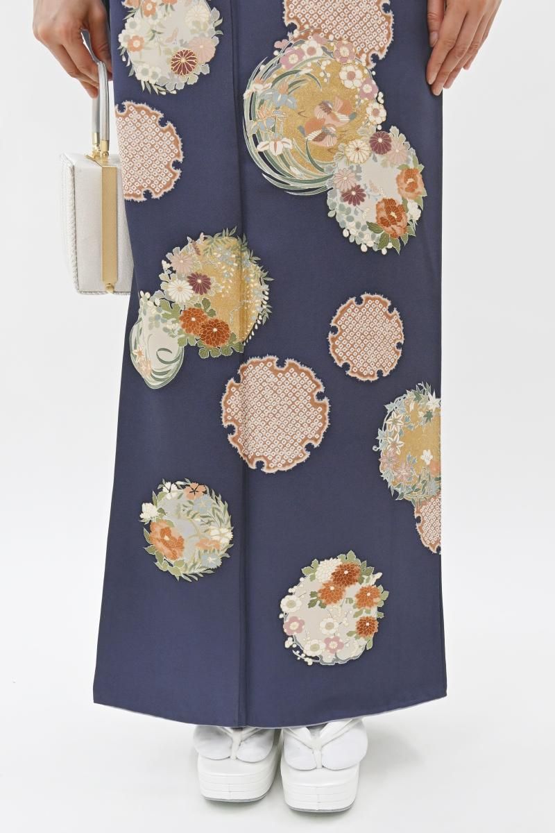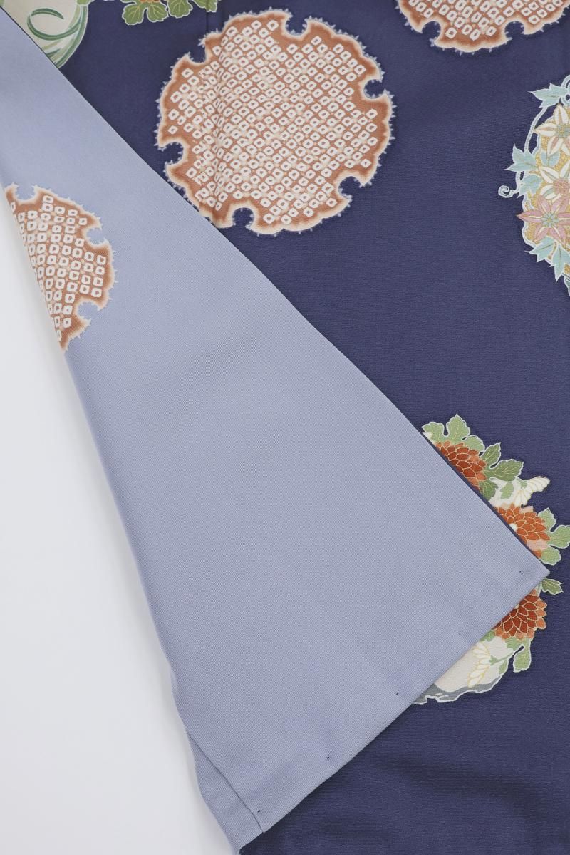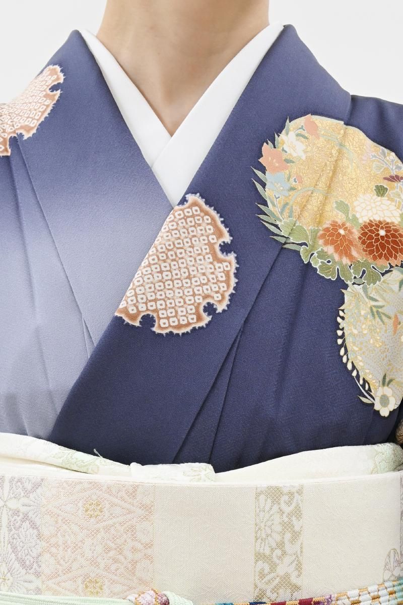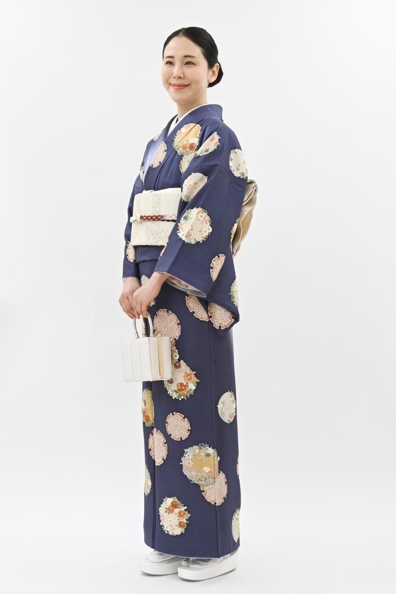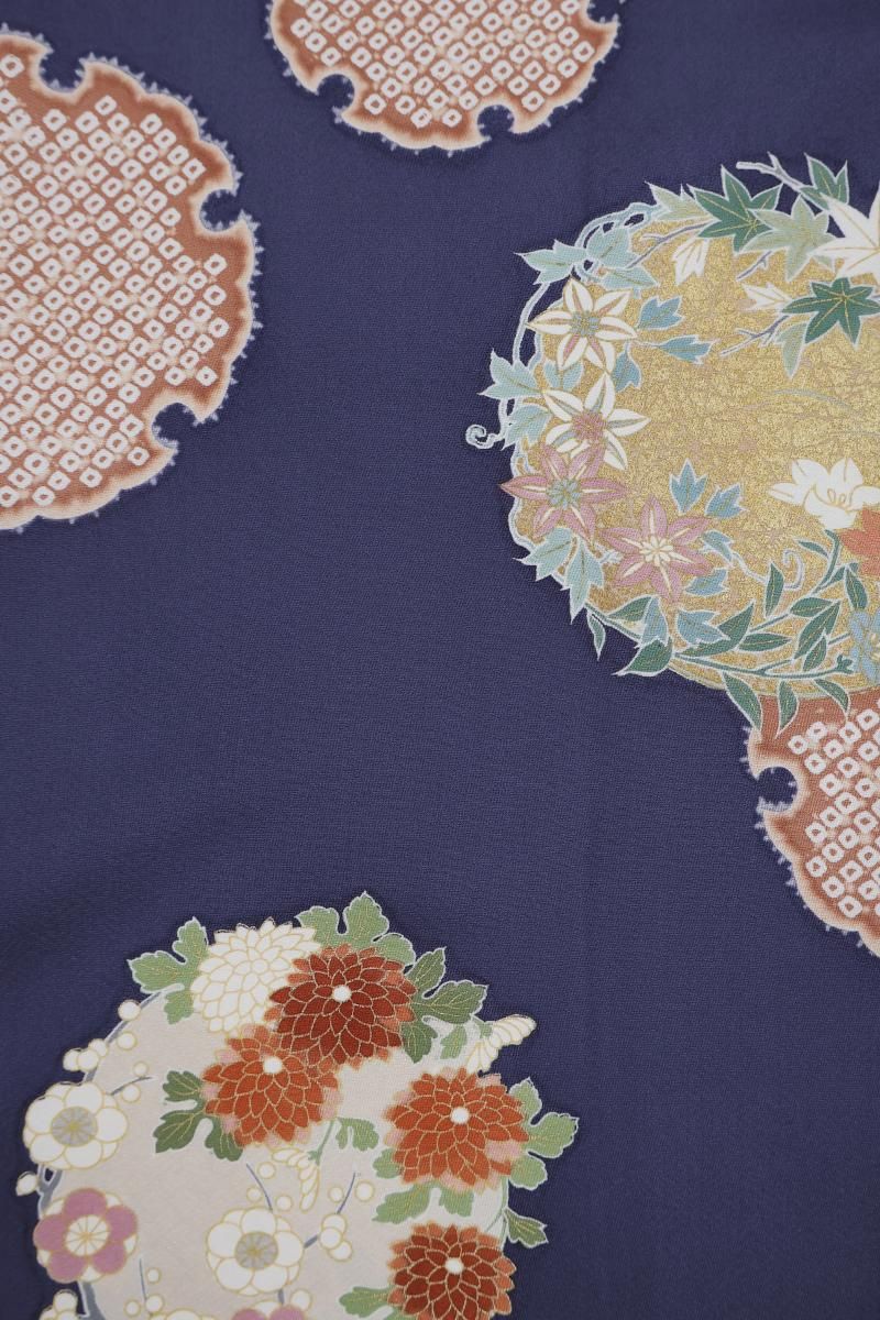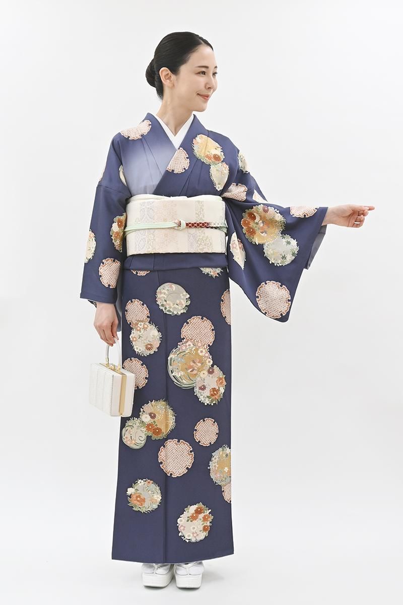 やや色を薄めた紺桔梗色が近いでしょうか、灰みを含んだ深い青紫色の地に、おおらかな暈かしを配し、疋田の雪輪や四季花の丸を描いた訪問着です。光の加減で菱の地紋が浮かぶ深みのあるお色目に、優美な色遣いで表現された古典意匠が贅沢に映えるお品、改まったお呼ばれやお祝いのお席などの晴れやかな場面でも一際目を引く存在感のある装いをお楽しみ頂けることと思います。この機会にいかがでしょうか。